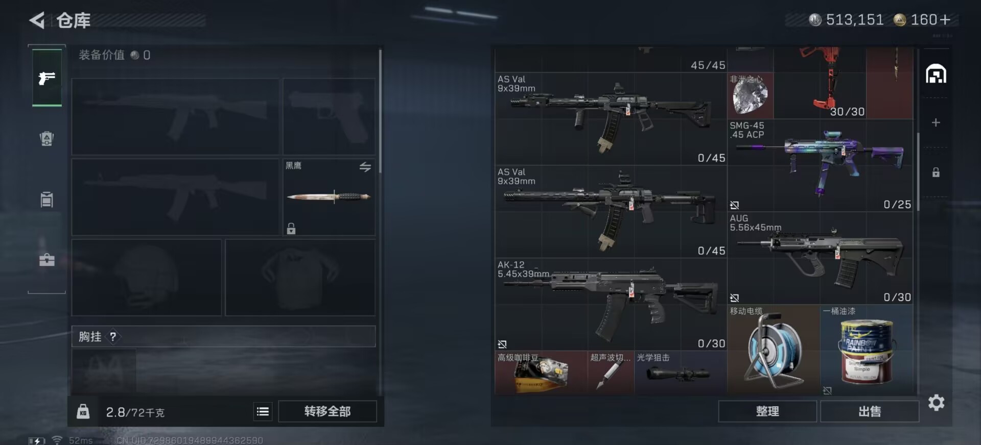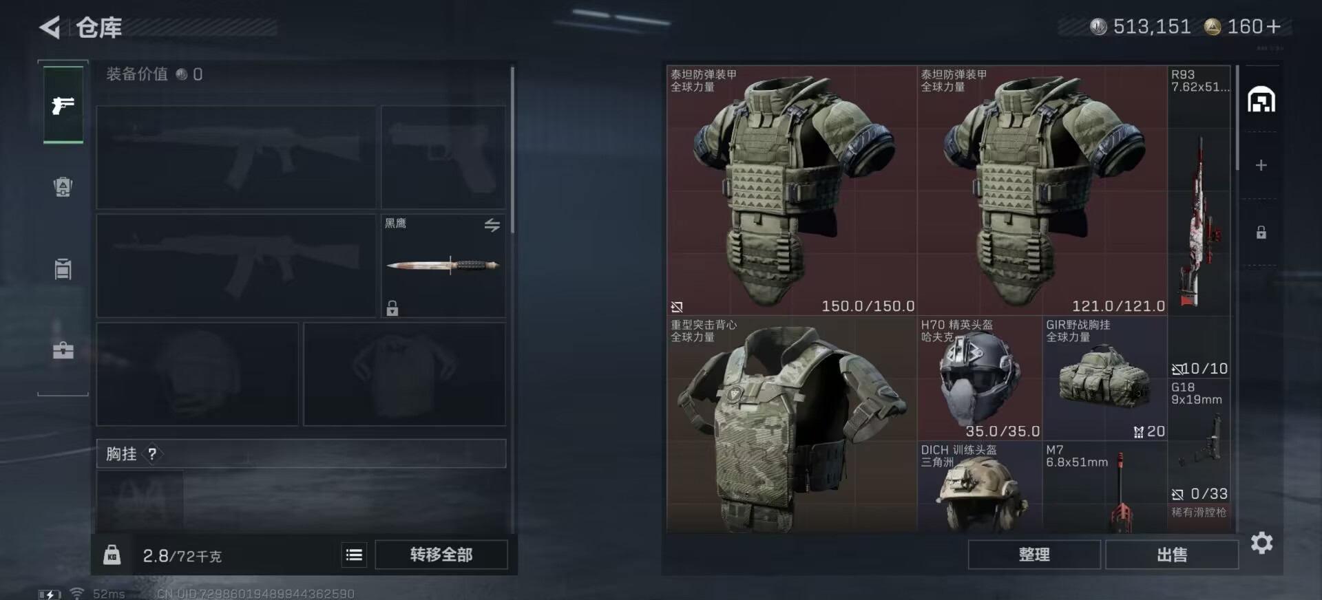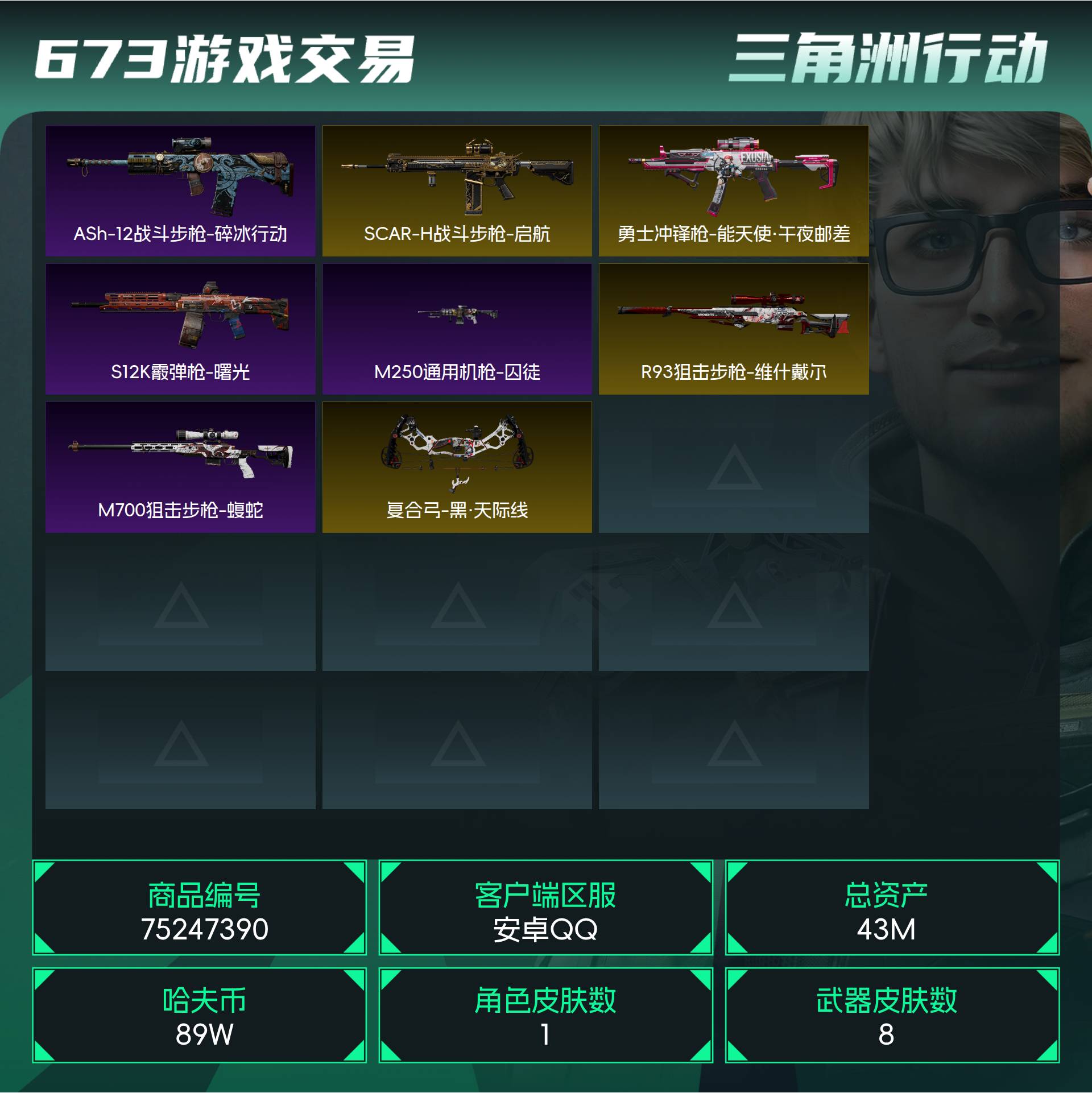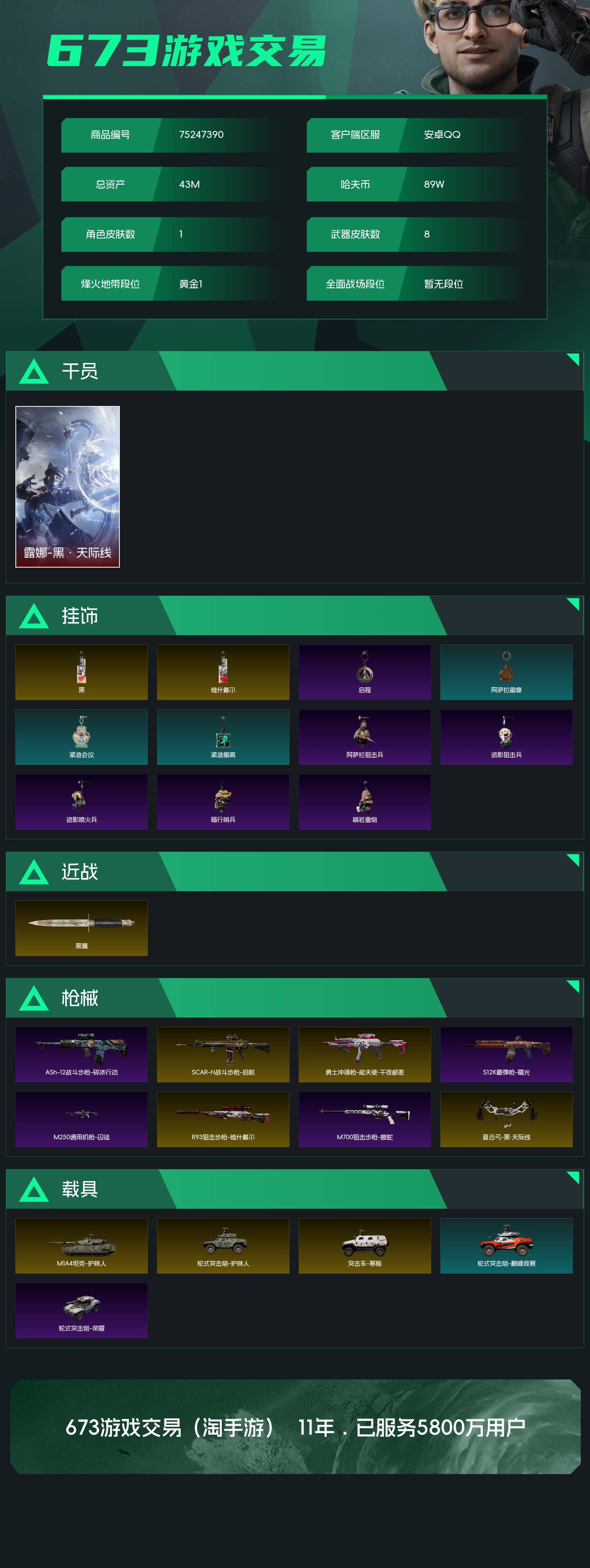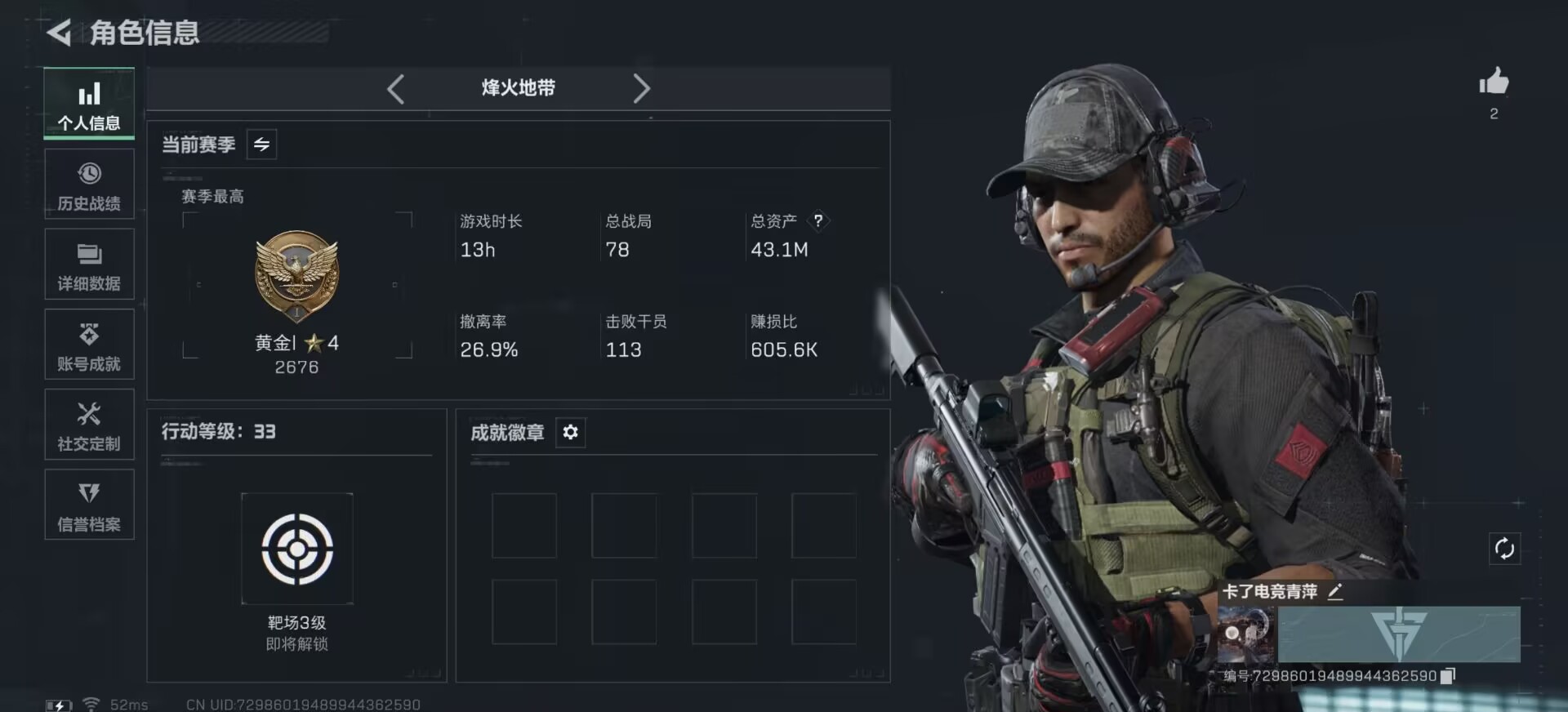 烽火段位黄金1 战场段位暂无段位 总资产43M 哈夫币89W 干员1 挂饰11 近战1 枪械8 载具5
