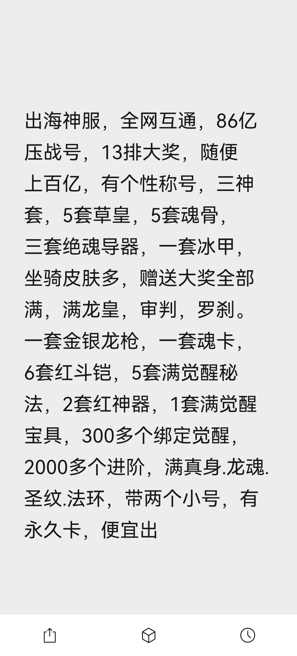 出海神服,全网互通,86亿压战号,13排大奖,随便上百亿,有个性称号,三神套,5套草皇,5套魂骨