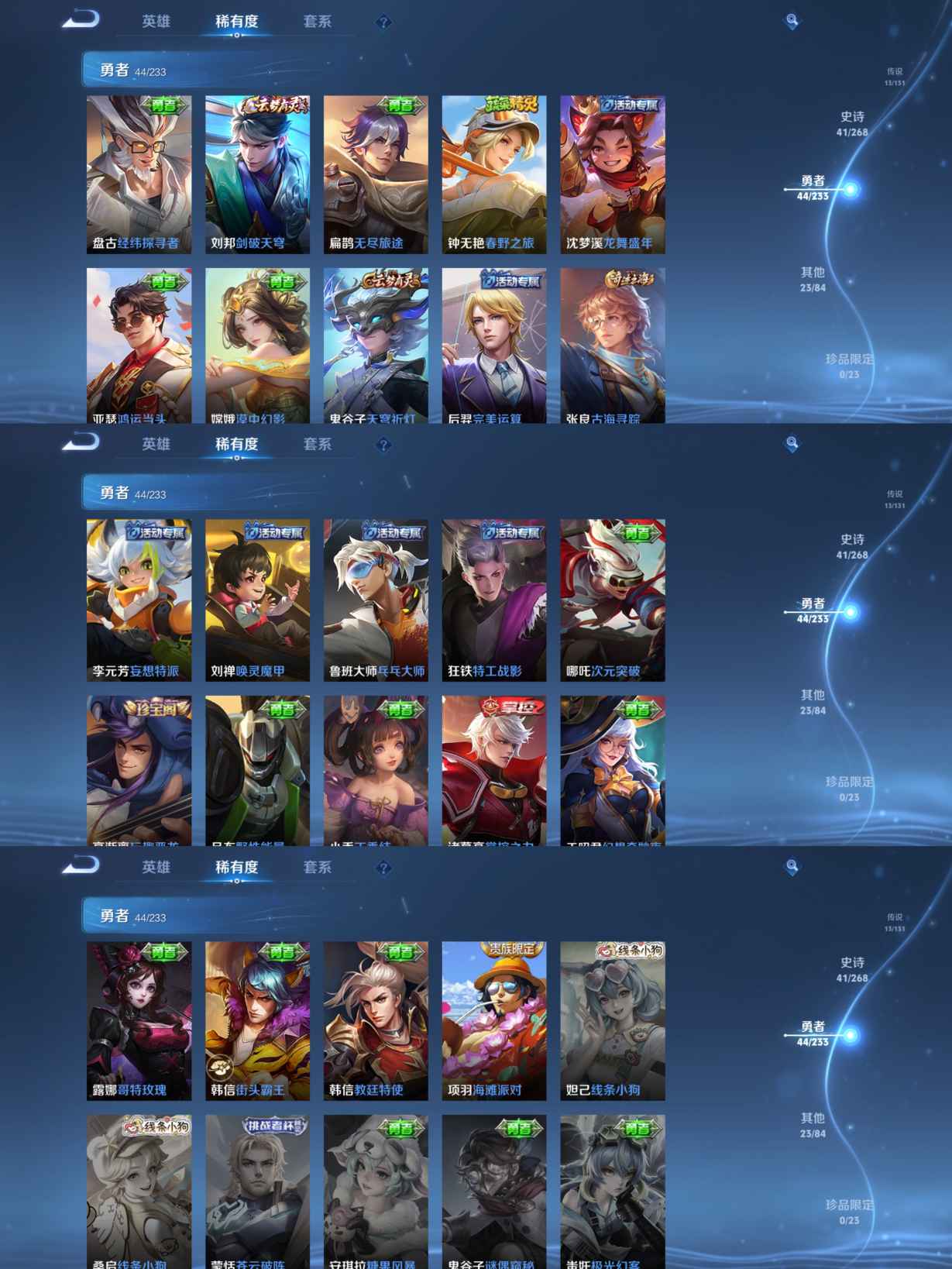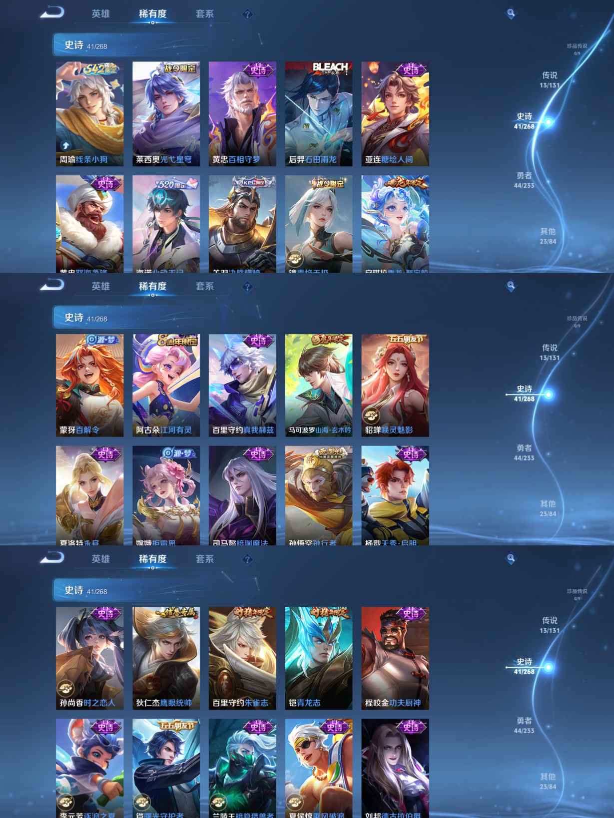 【史诗皮肤】 决胜骁骑 糖绘人间 青龙志 电玩小子 孙行者 决胜骁骑 线条小狗 山海·玄木吟 心动手记 青焰无极 怒海争锋 真我赫兹 踏浪烽翎 苍威无极 江河有灵 乘龙·聚宝船 百解令 百相守梦 漠中幻影 光弋星穹 石田雨龙 朱雀志 拒霜思