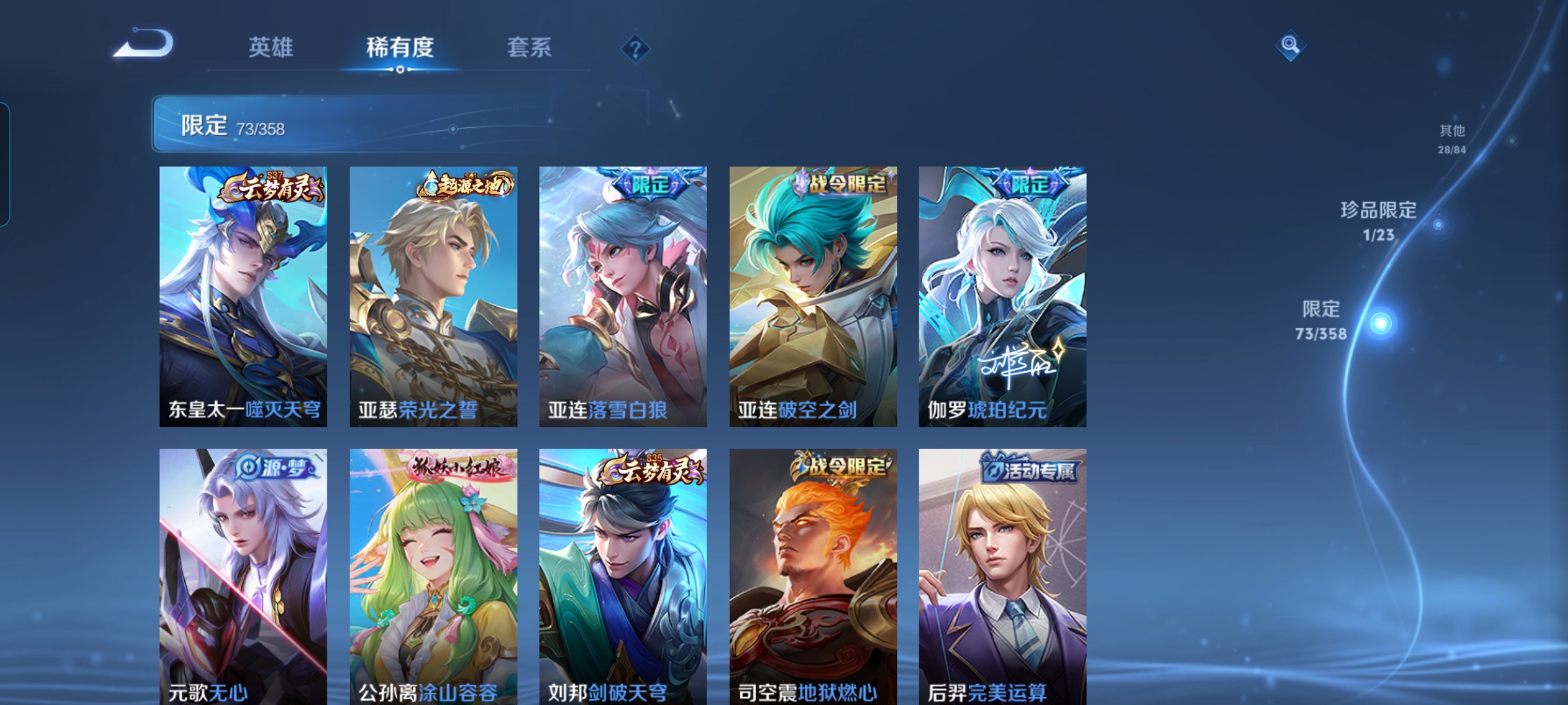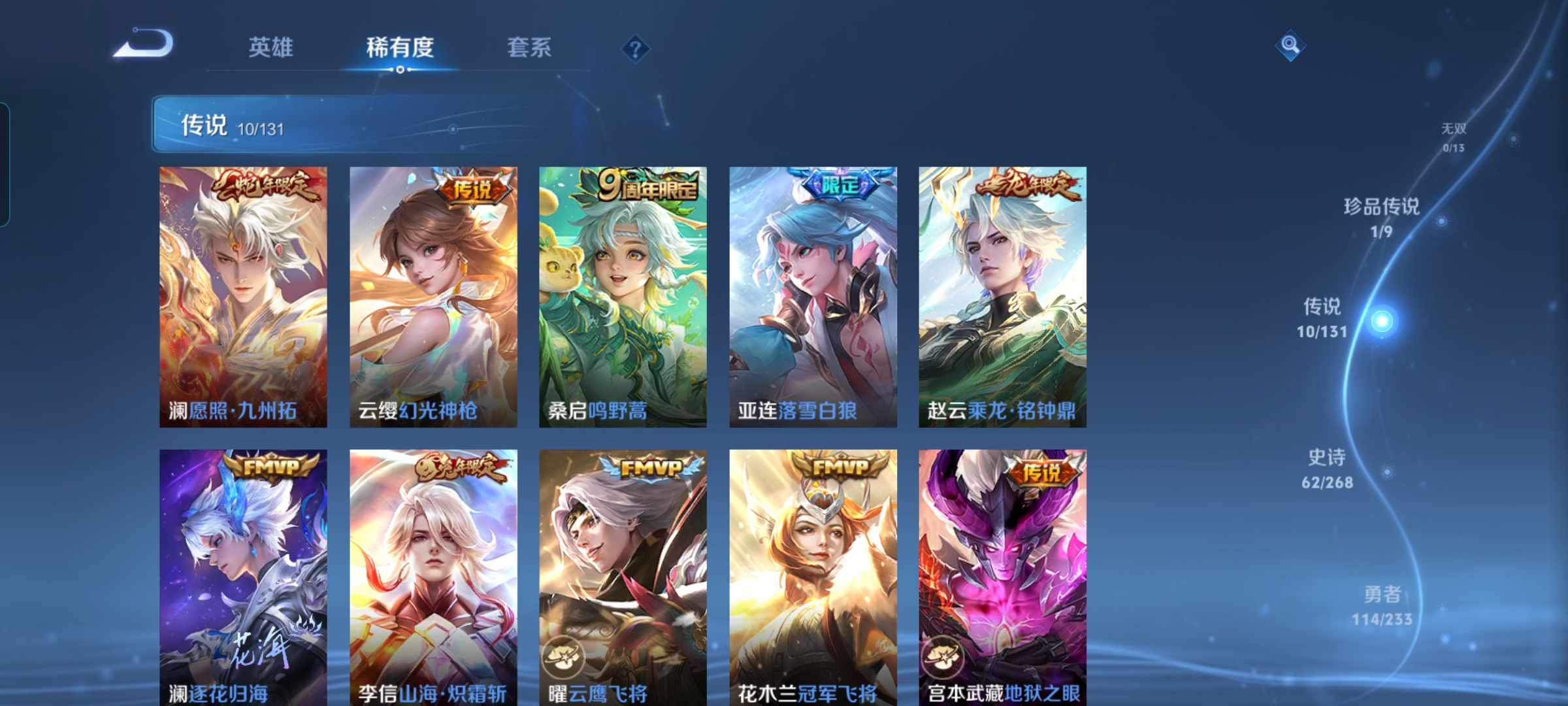 【传说皮肤】 鸣野蒿 逐花归海 乘龙·铭钟鼎 幻光神枪 愿照·九州拓 落雪白狼 山海·炽霜斩 地狱之眼 冠军飞将 云鹰飞将