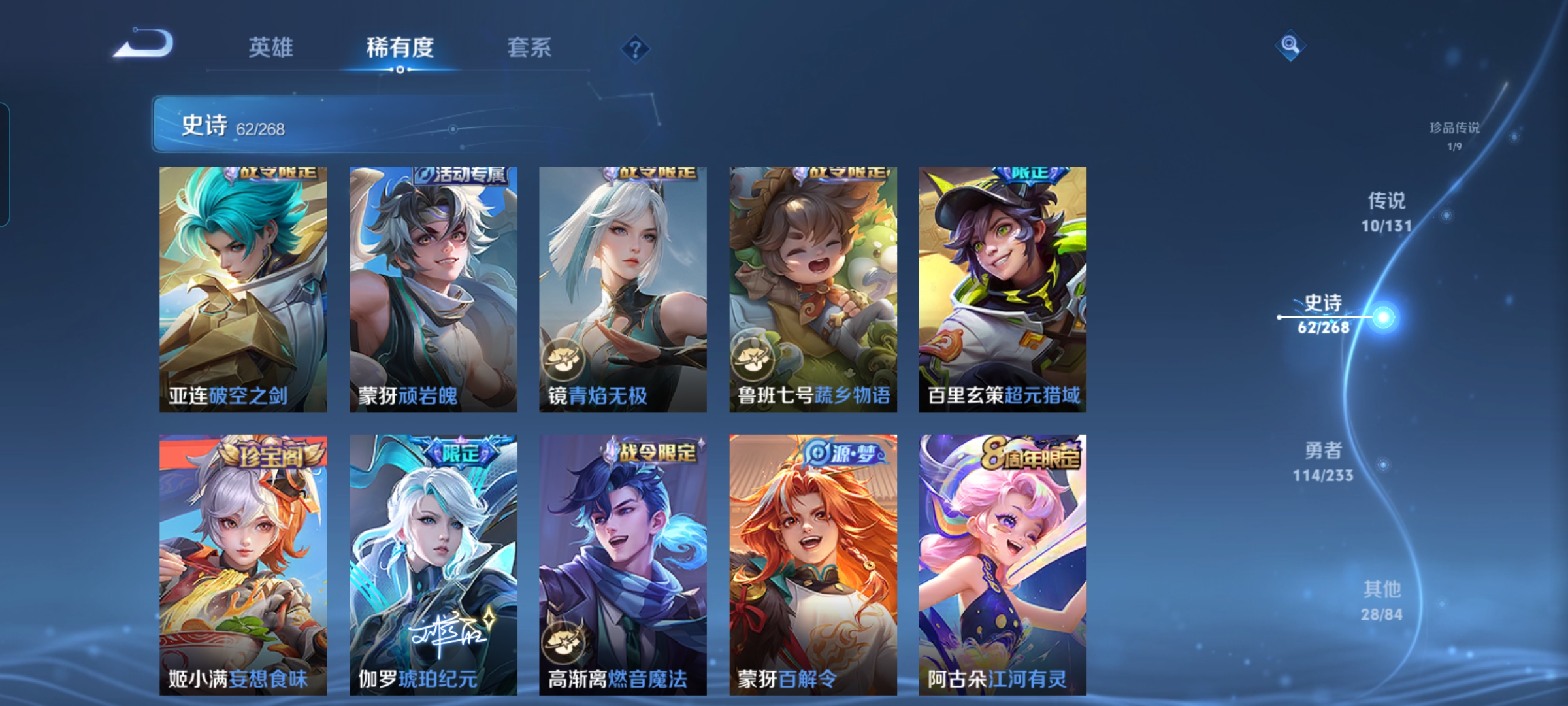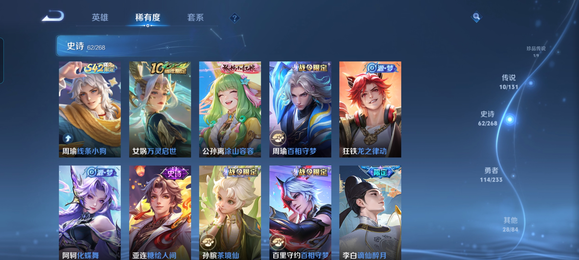 【史诗皮肤】 蔬乡物语 蔬乡物语 破空之剑 茶境仙 百相守梦 糖绘人间 布丁狗之约 谧流熔炉 涂山容容 龙之律动 地狱燃心 线条小狗 谪仙醉月 山海·玄木吟 青焰无极