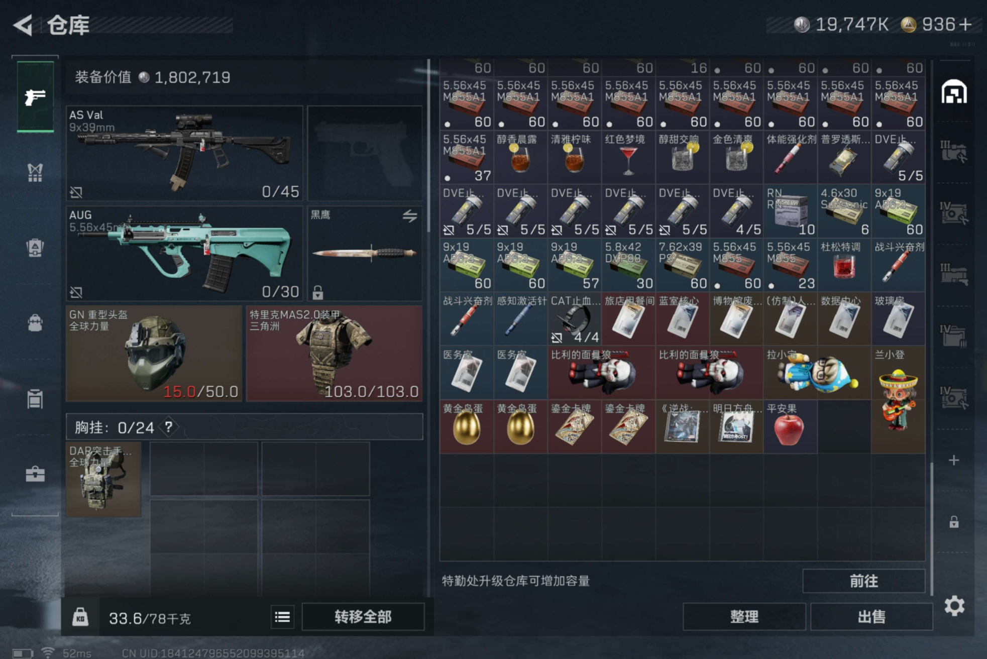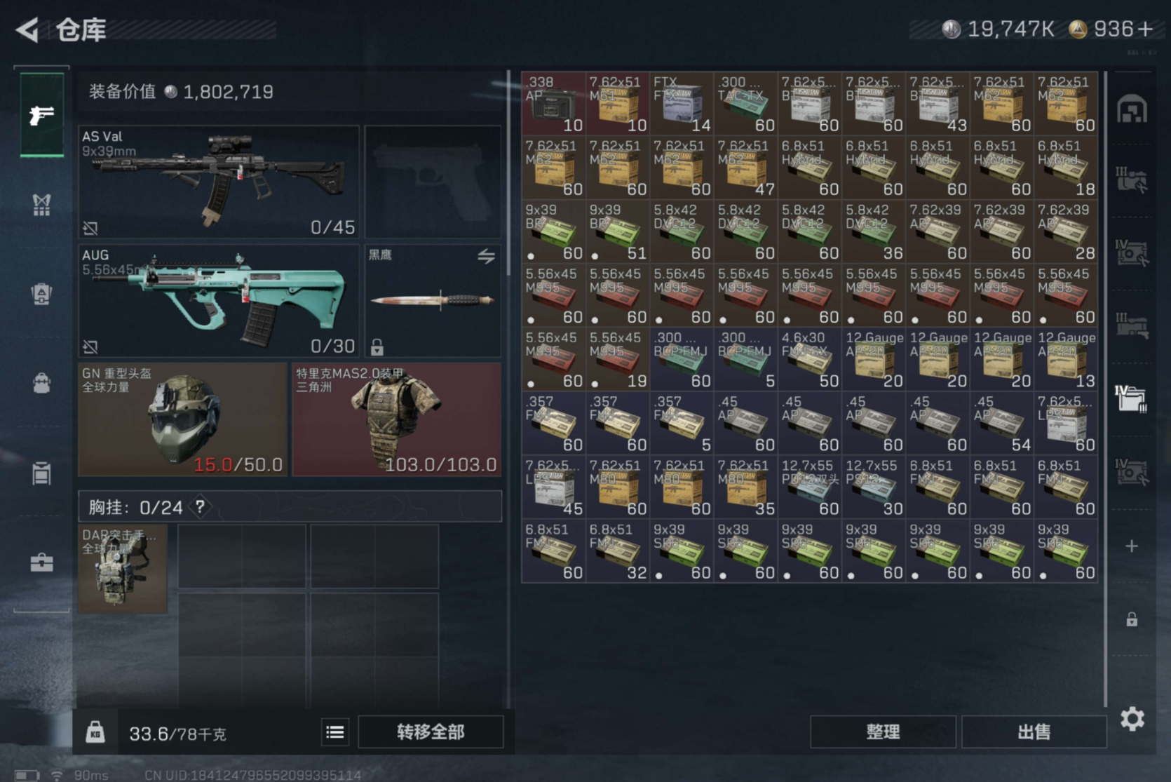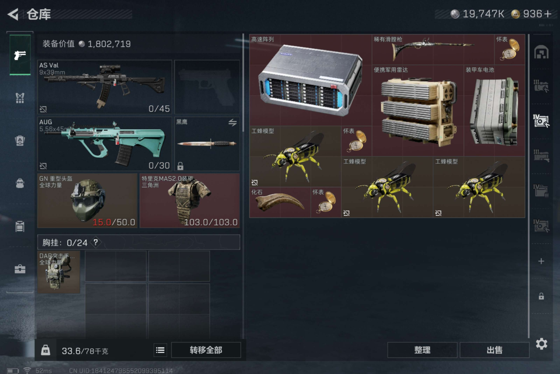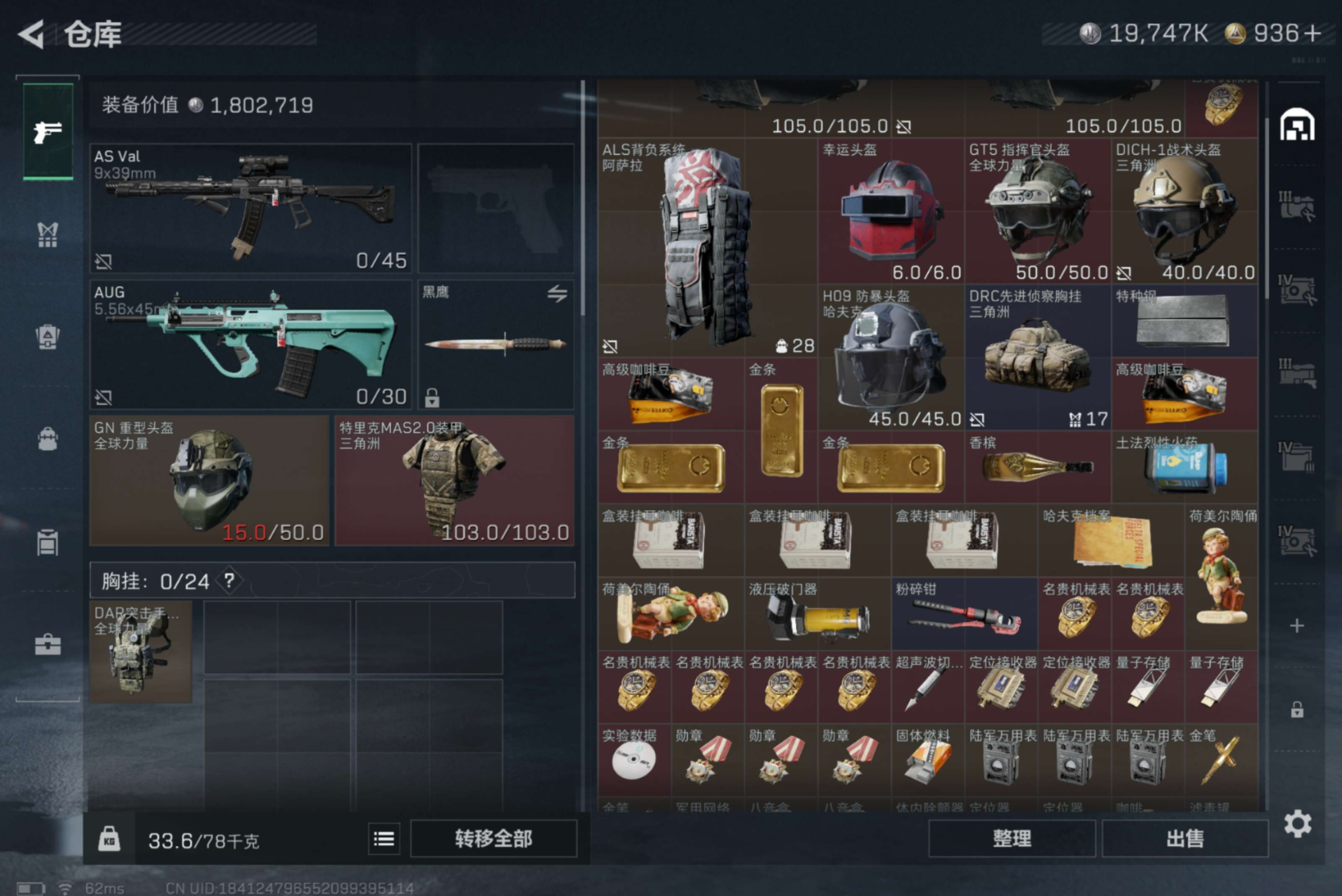 安卓qq-素材猛攻首选账号-总资产105.52M,哈夫币 19747.07K,行动等级:60 黑鹰,角色皮肤1,枪皮数量35【特战干员外观】骇爪-维什戴尔,【步枪】AS Val突击步枪-刀锋,M4A1突击步枪-阿米娅,ASh-12战斗步枪-鹅鸭杀,SCAR-H战斗步枪-启航,KC17突击步枪-电锯惊魂,QBZ95-1突击步枪-海色,SCAR-H战斗步枪-荣耀列队,PTR-32突击步枪-黄蜂,K