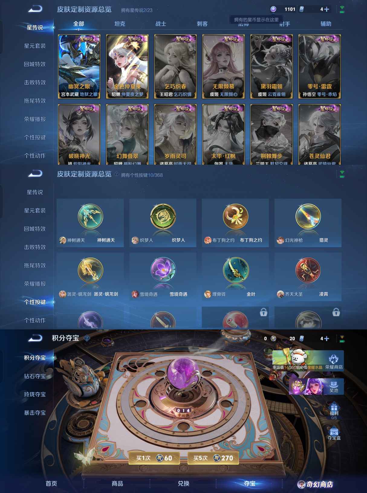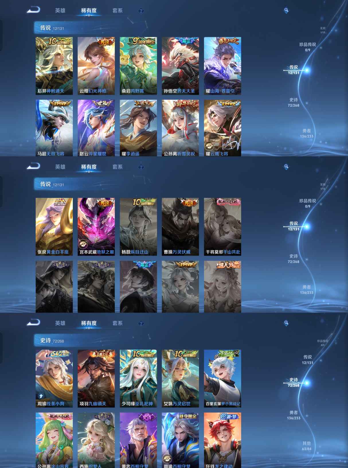 【传说皮肤】 神树通天 鸣野蒿 幻光神枪 山海·苍雷引 齐天大圣 无双飞将 祈雪灵祝 地狱之眼 云鹰飞将 李逍遥 黄金白羊座 淬星耀世