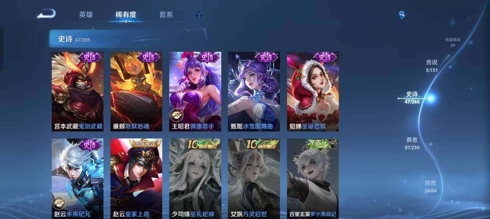【限定皮肤】:姜子牙天穹之誓,狄仁杰阴阳师,赵云皇家上将,庄周高山流水,元歌云间偶戏,元歌无心,马可波罗山海玄木吟,狄仁杰万华元夜,达摩沙漠行僧,项羽海滩派对,老夫子醍醐杖,兰陵王金庭之子,亚瑟潮玩骑士王,李元芳云中旅人,钟馗驱傩正仪,杨玉环遇见飞天,雅典娜黎明之约,鬼谷子原初探秘者,鬼谷子五