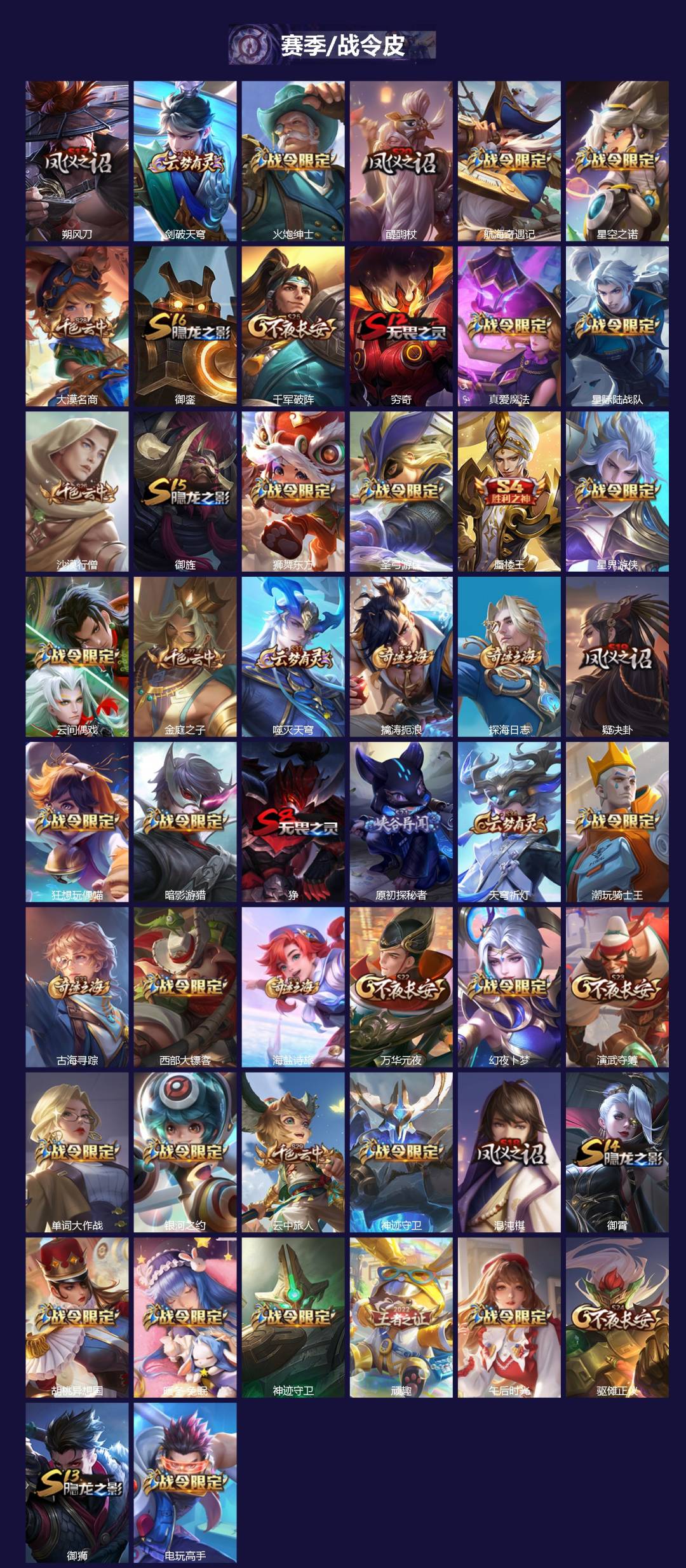【赛季/战令皮】噬灭天穹(s37),古海寻踪(s33),星界游侠,海盐诗旅(s30),擒涛扼浪(s31),探海日志(s32),顽趣-梦奇