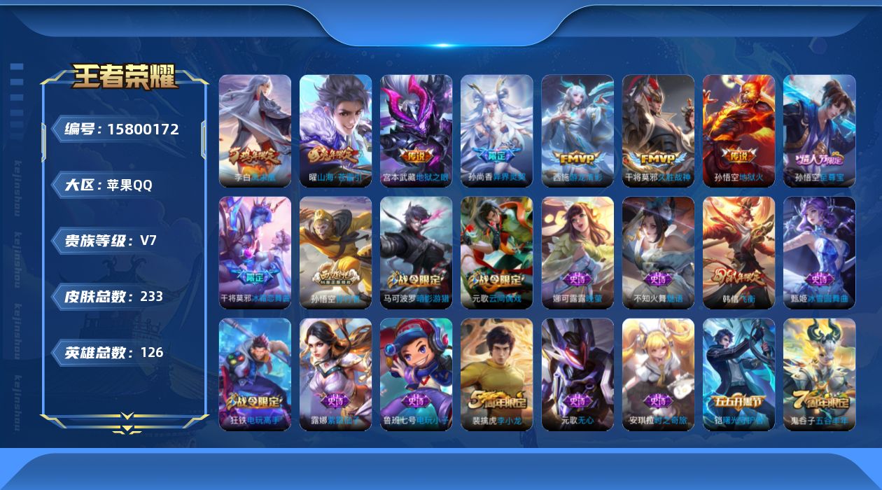 V7 7传说 126英雄 233皮肤 典藏英雄武则天 可修改实名 金标干将