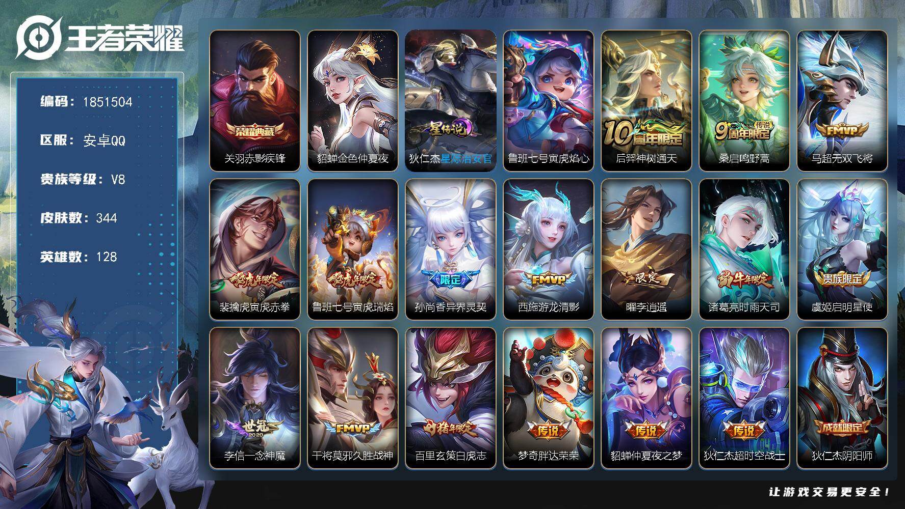 W13939,,可立即换绑无需挂单养号,,铭文满级,,典藏1,传说16,,星传说3,,按键2,,夺宝202,,安卓Q-V8-永恒钻石V段位-128英雄-344皮肤-1典藏皮肤-16传说-100史诗