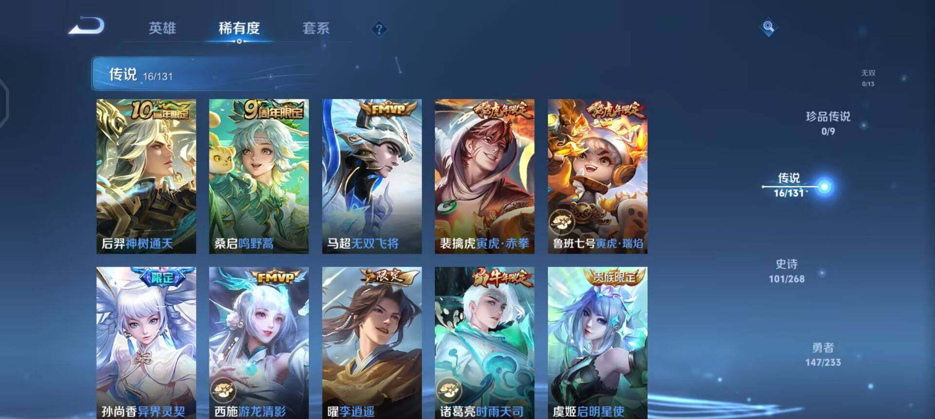 【传说皮肤】:后羿神树通天,桑启鸣野蒿,马超无双飞将,裴擒虎寅虎赤拳,鲁班七号寅虎瑞焰,孙尚香异