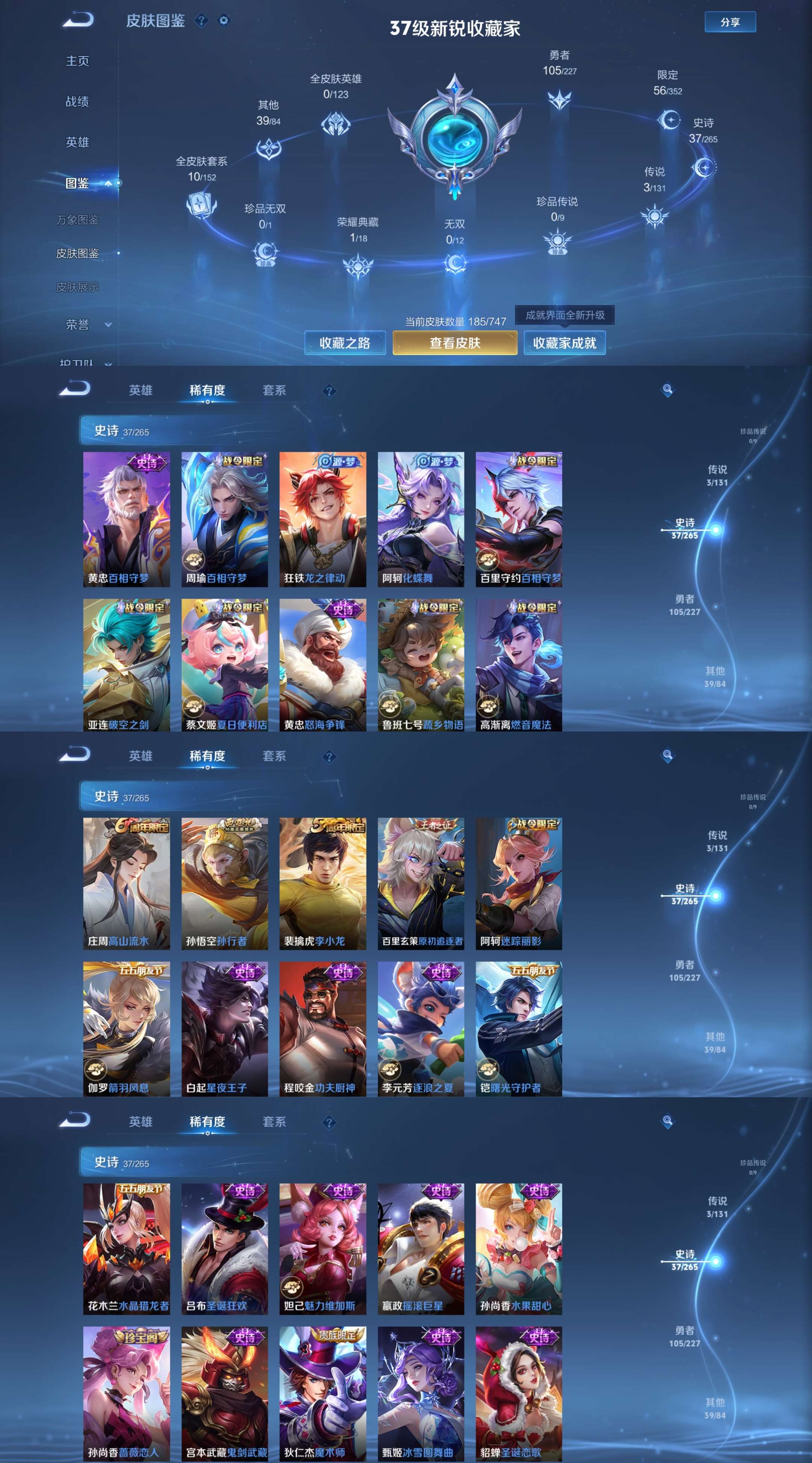 【史诗皮肤】 蔬乡物语 高山流水 燃音魔法 心灵战警 鬼剑武藏 迷踪丽影 星夜王子 龙之律动 怒海争锋 摇滚巨星 魅力维加斯 鹰眼统帅 孙行者 李小龙 特工魅影 原初追逐者 逐浪之夏 未来