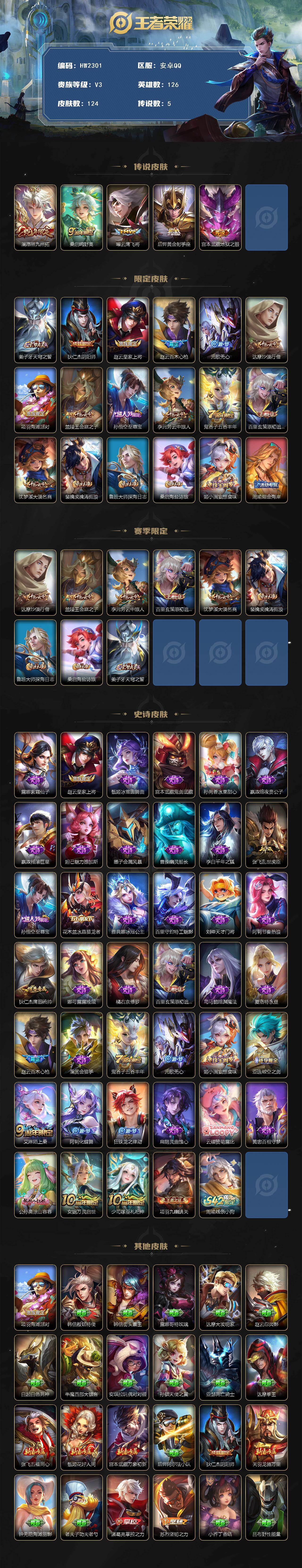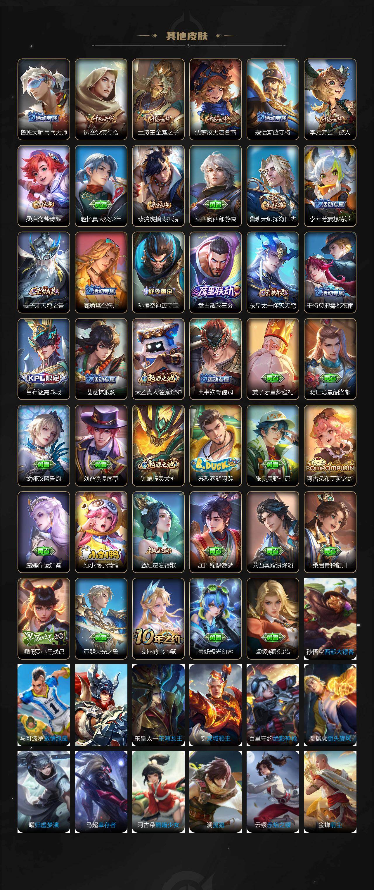 【限定皮肤】:姜子牙天穹之誓,狄仁杰阴阳师,赵云皇家上将,赵云百木心枪,元歌无心,达摩沙漠行僧,项羽海滩派对,兰陵王金庭之子,孙悟空至尊宝,李元芳云中旅人,鬼谷子五谷丰年,百里玄策原初追逐者,沈梦溪大漠