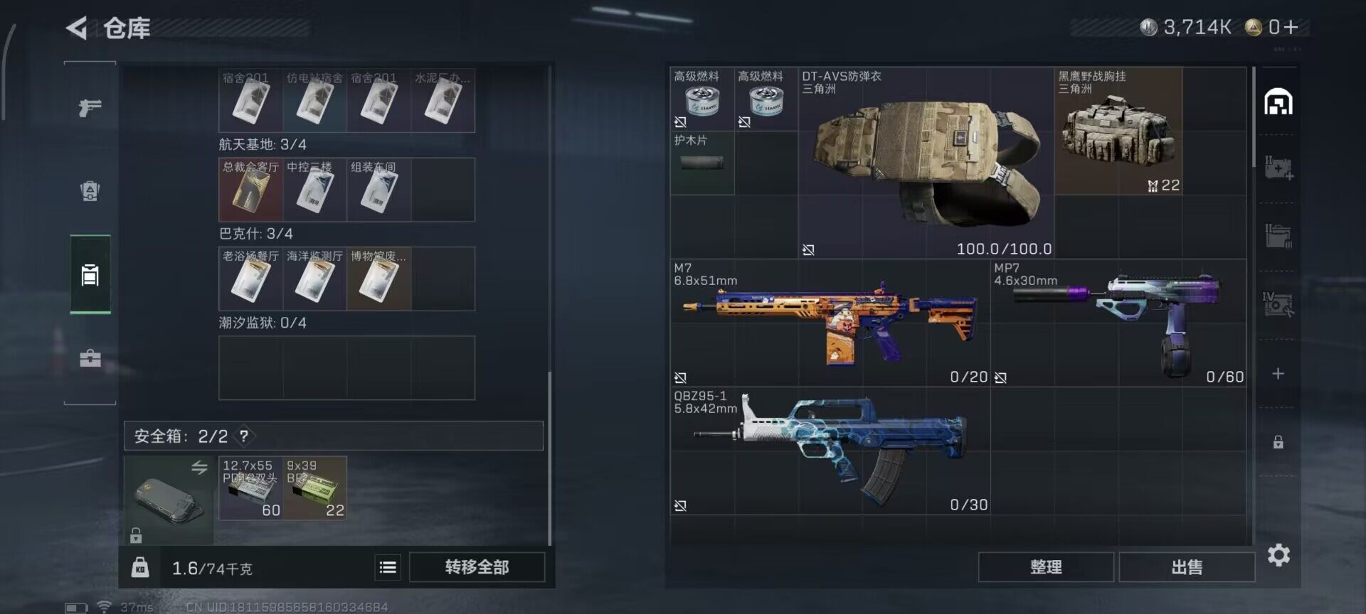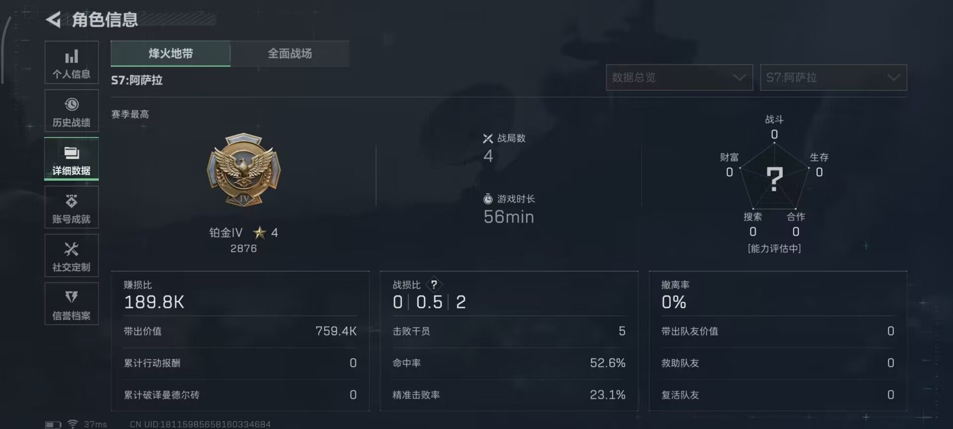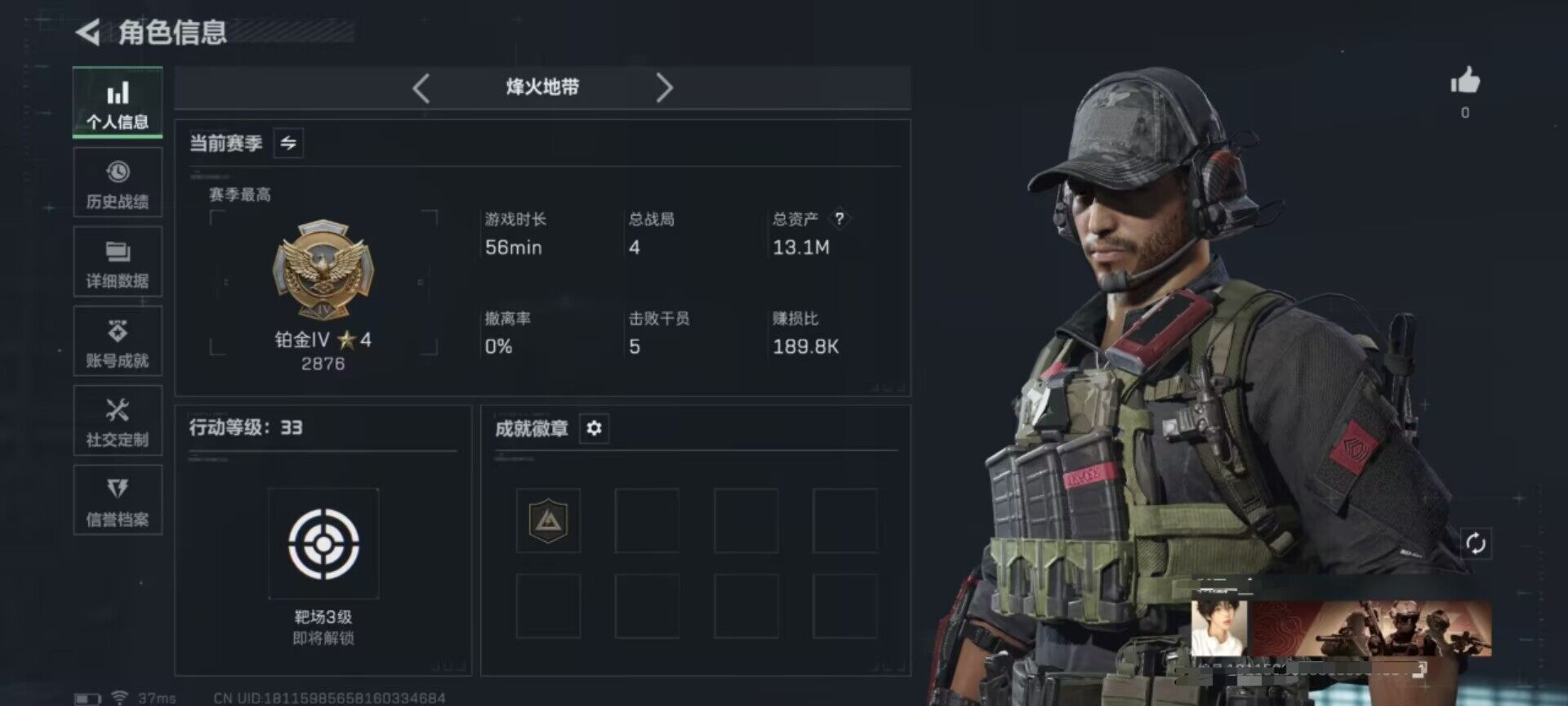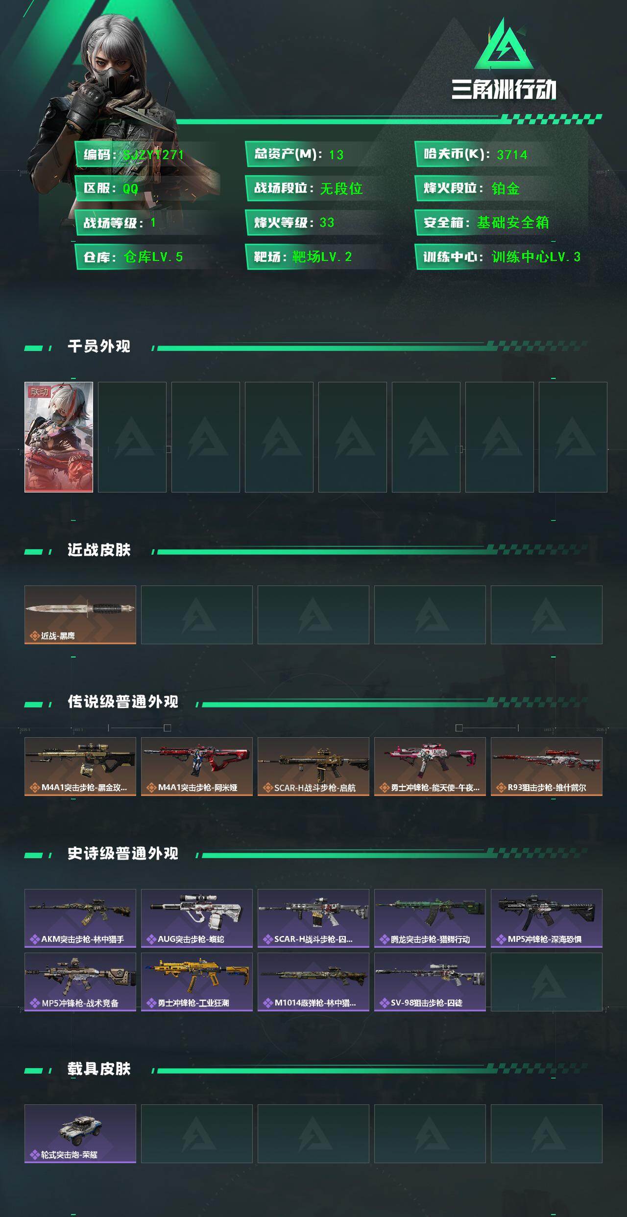 总资产(M):13M/哈夫币(K):3714K/传说枪皮数:5/全面战场等级:1_段位:无段位/烽火地带等级:33_段位:铂金