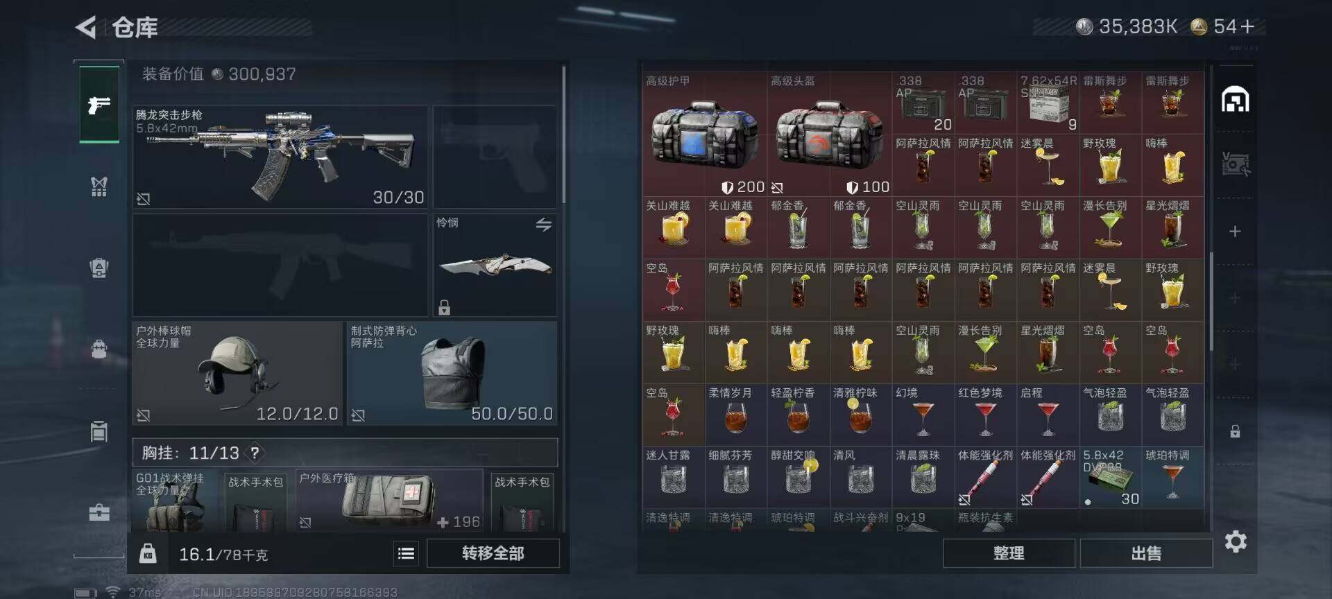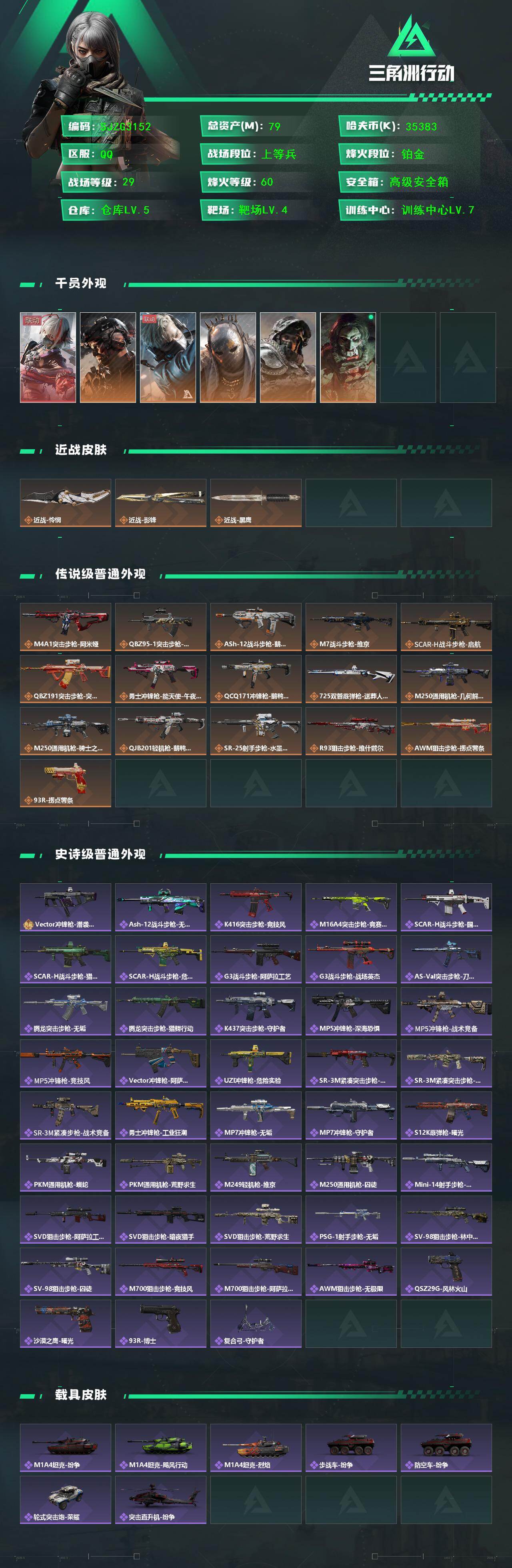 总资产(M):79M/哈夫币(K):35383K/传说枪皮数:16/全面战场等级:29_段位:上等兵/烽火地带等级:60_段位:铂金