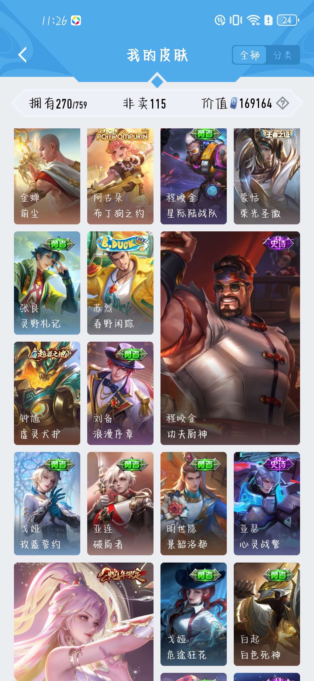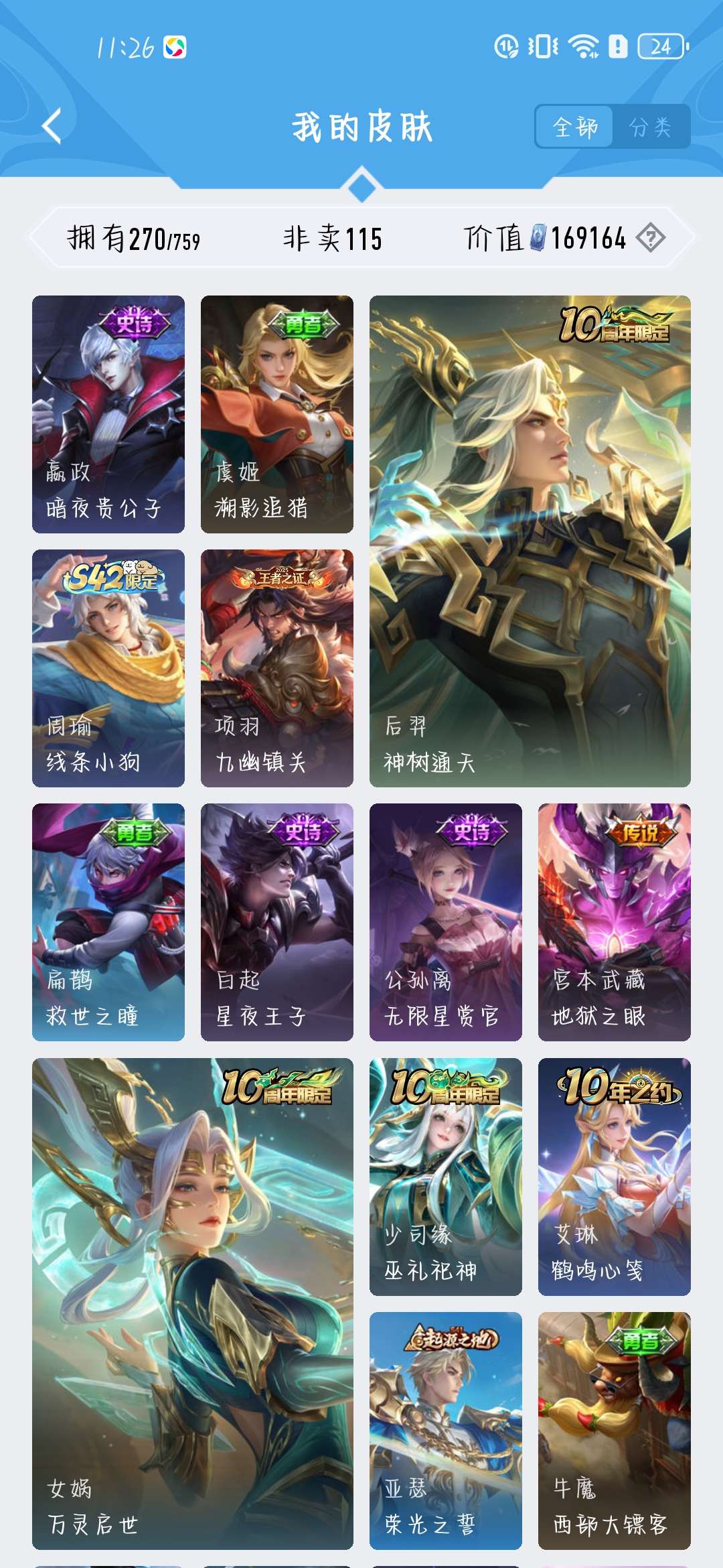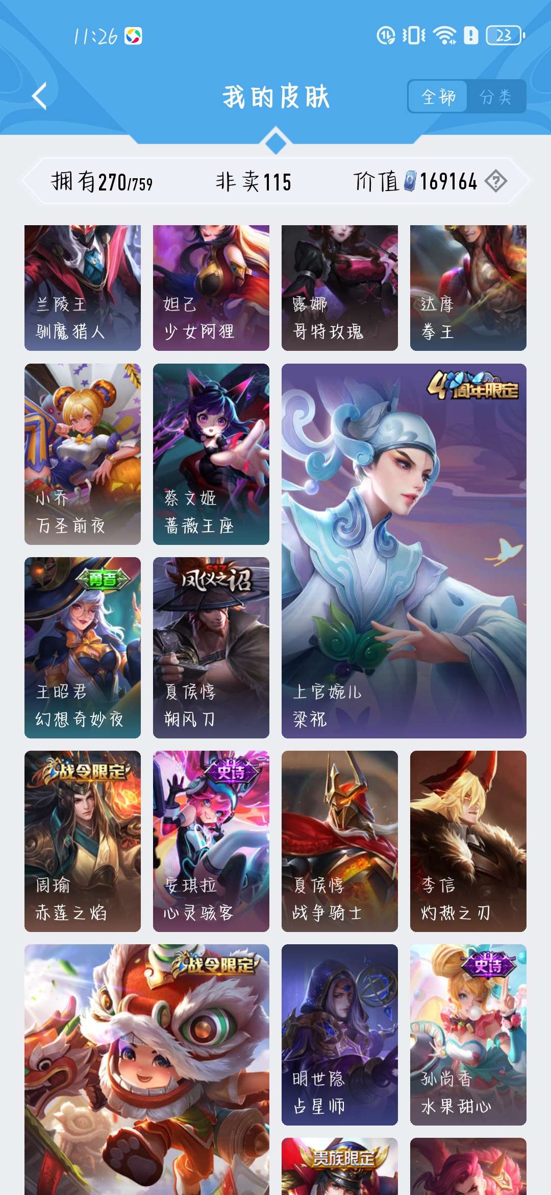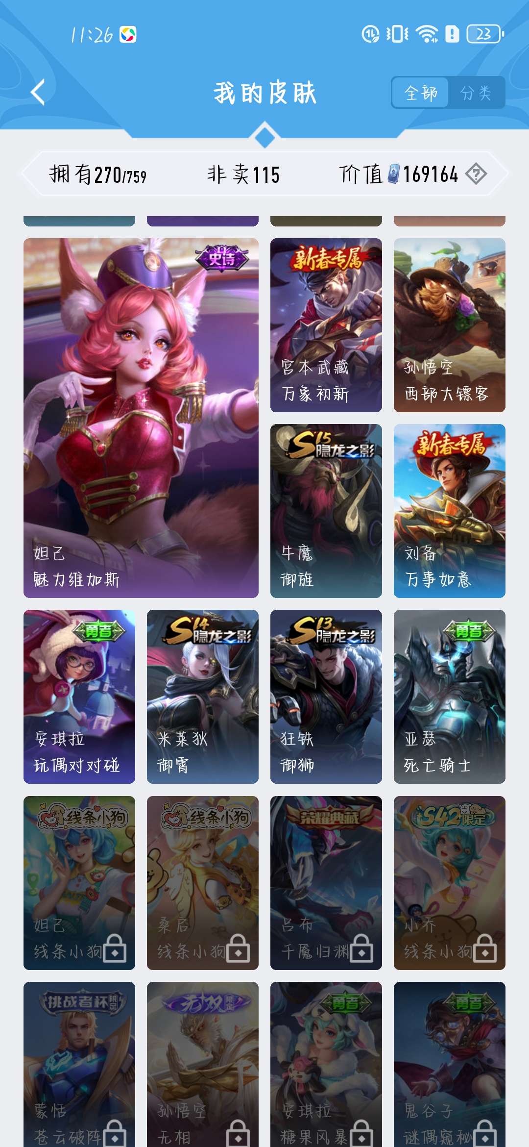 一共270个皮肤,荣耀水晶300抽,新赛季段位是星耀,标多,全能账号,低价卖,买了不亏