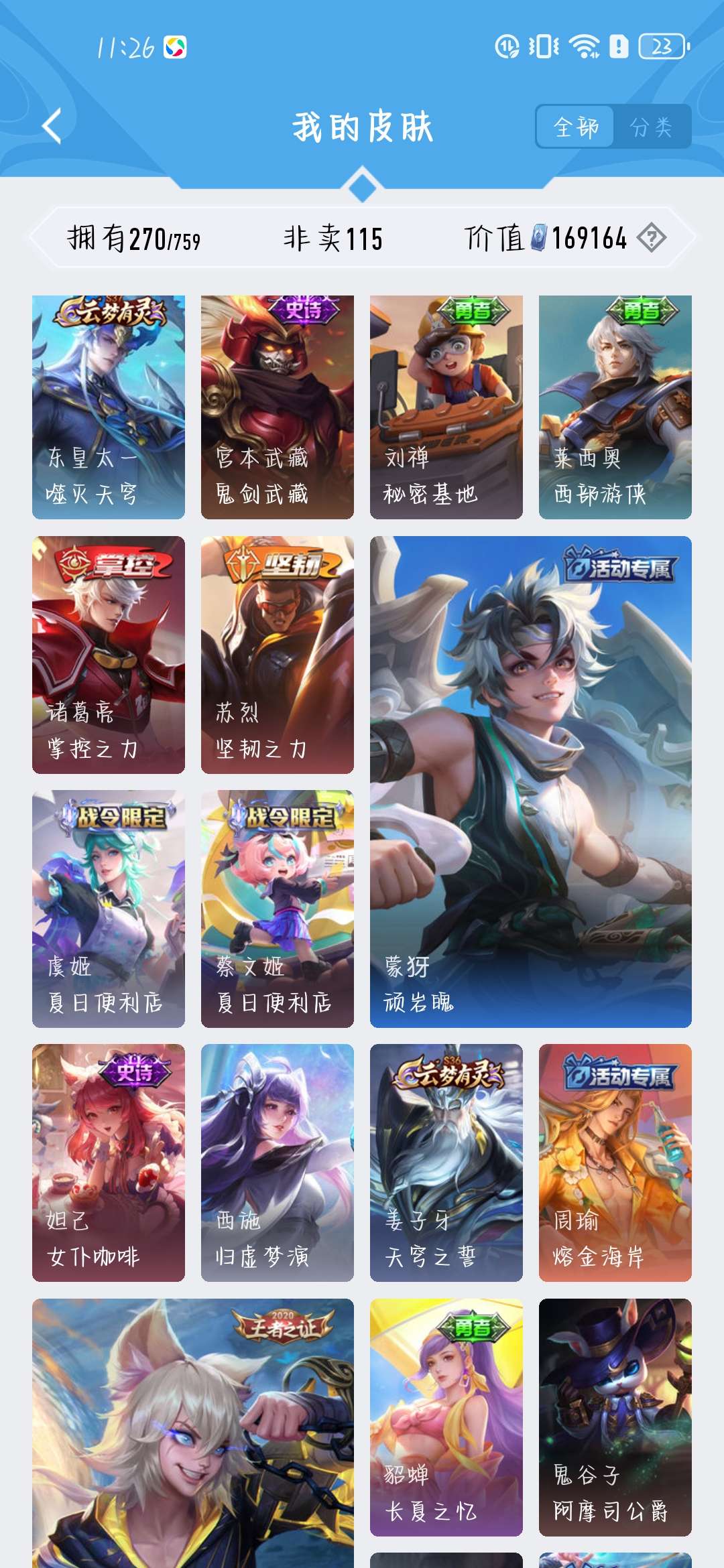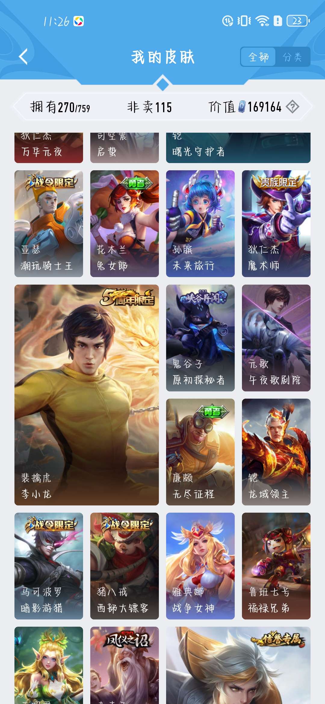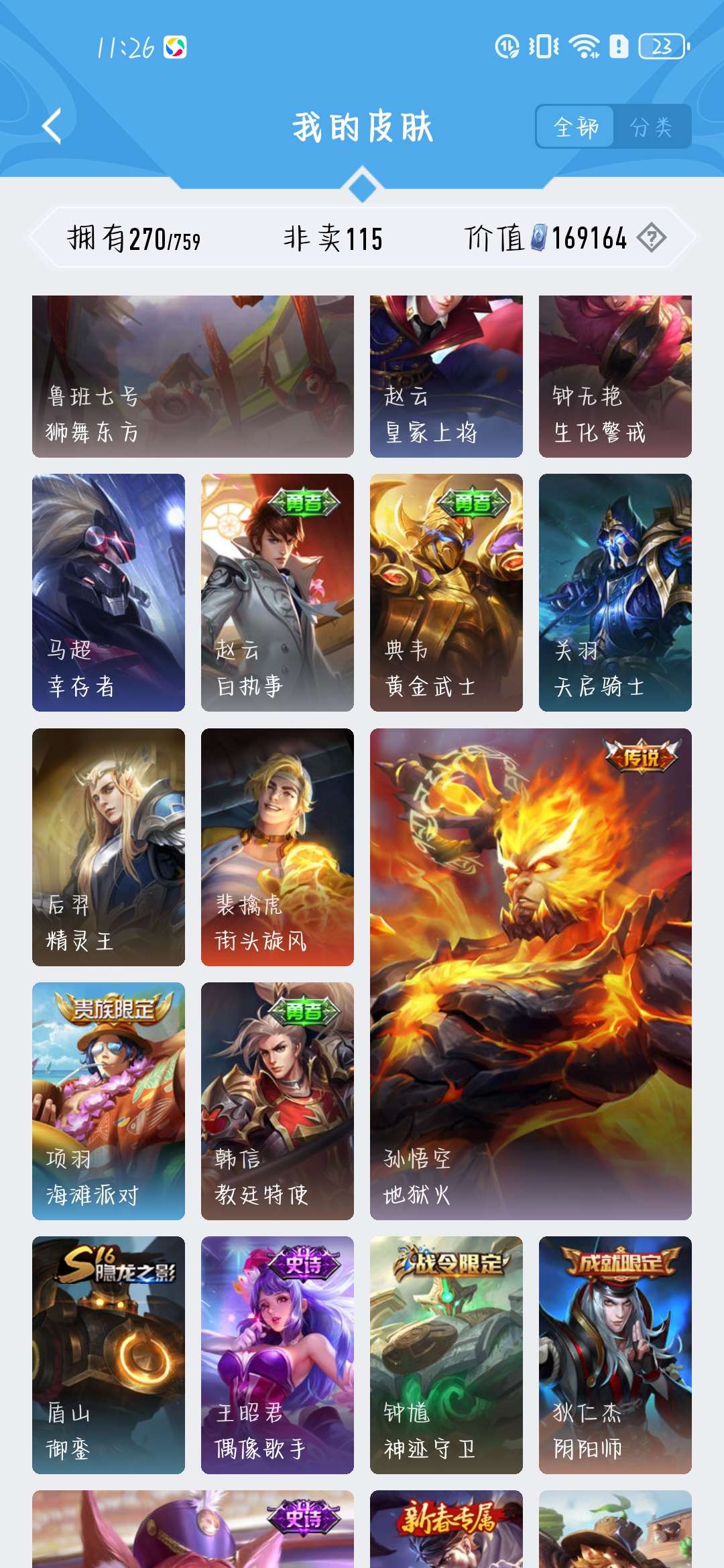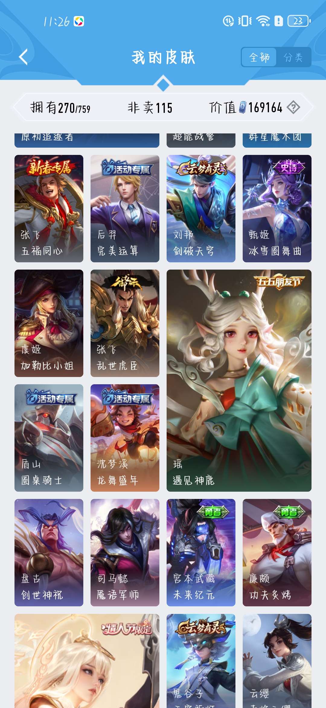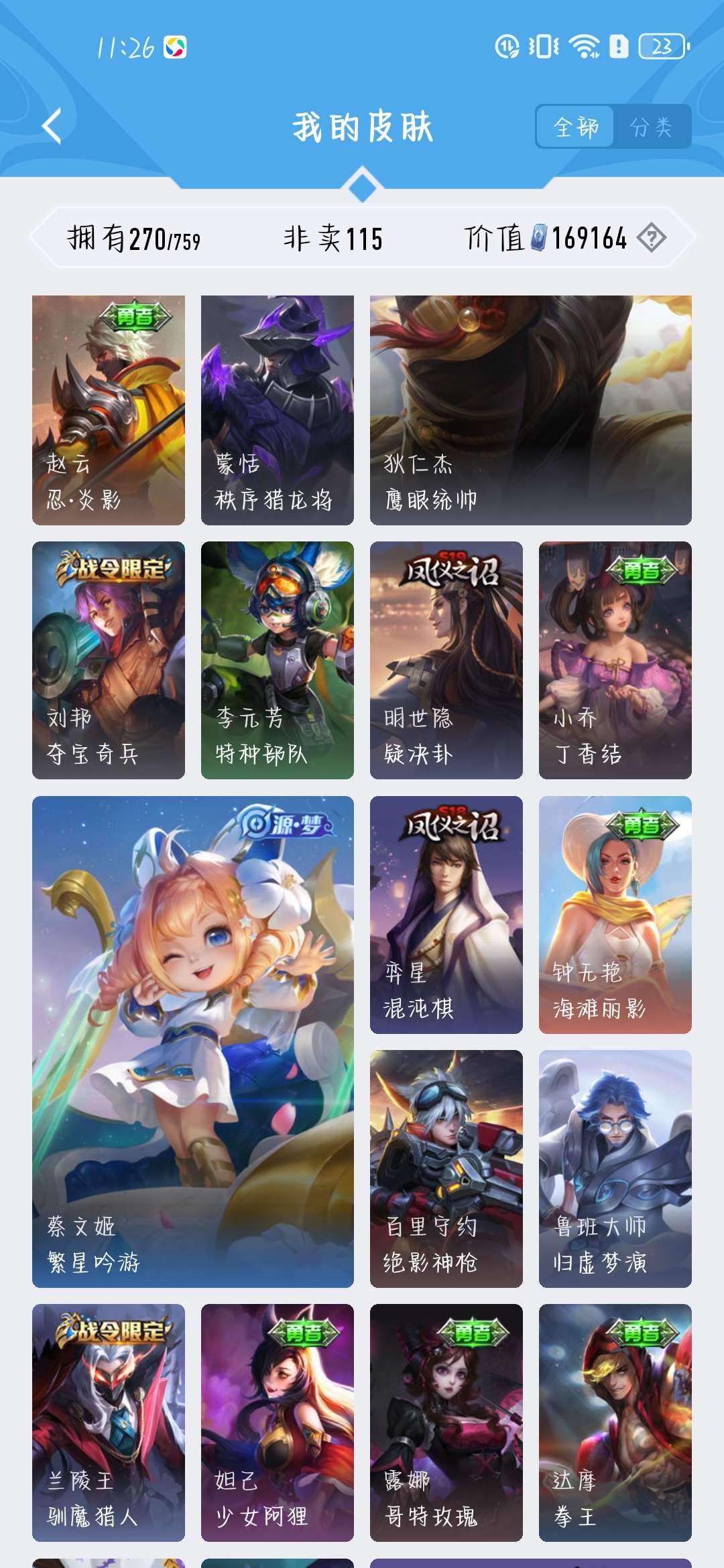 一共270个皮肤,荣耀水晶300抽,新赛季段位是星耀,标多,全能账号,低价卖,买了不亏
