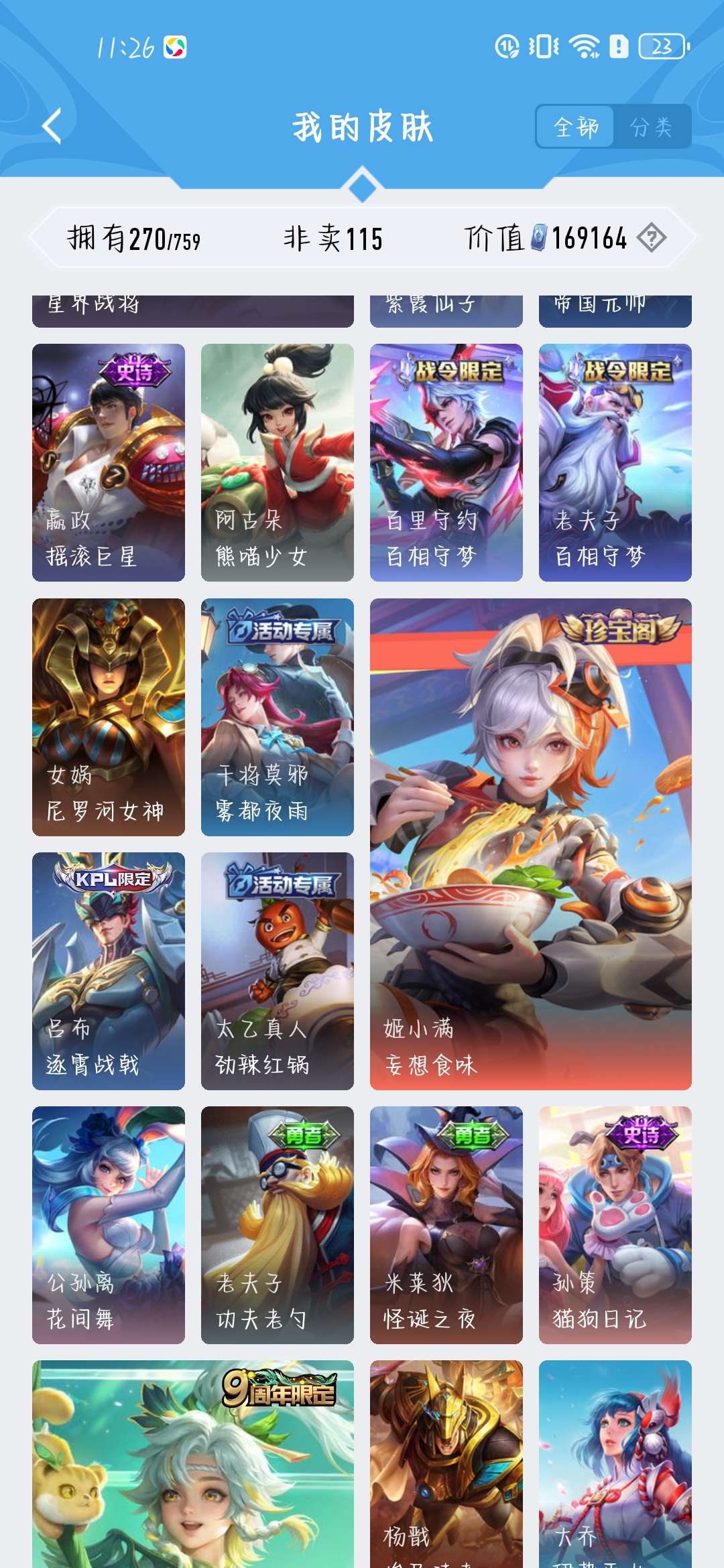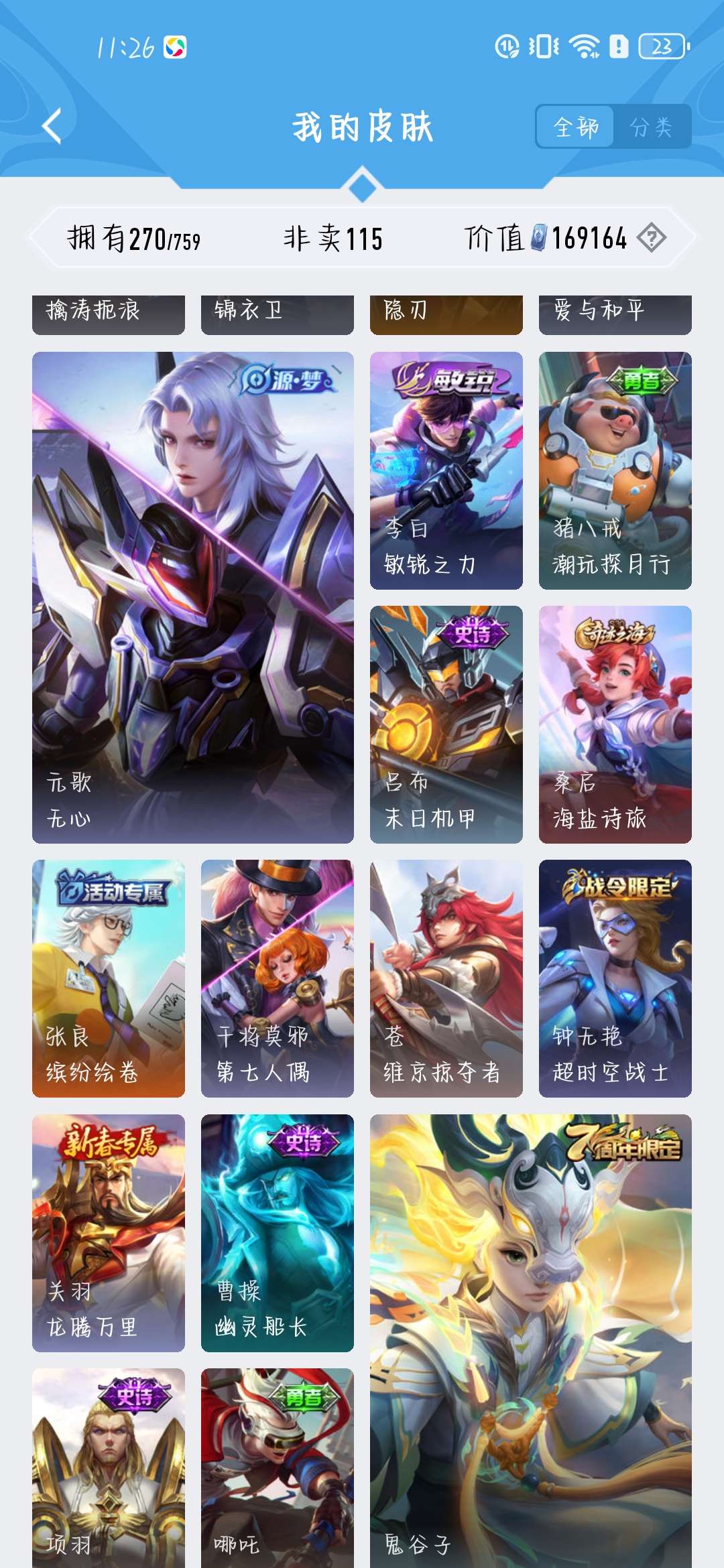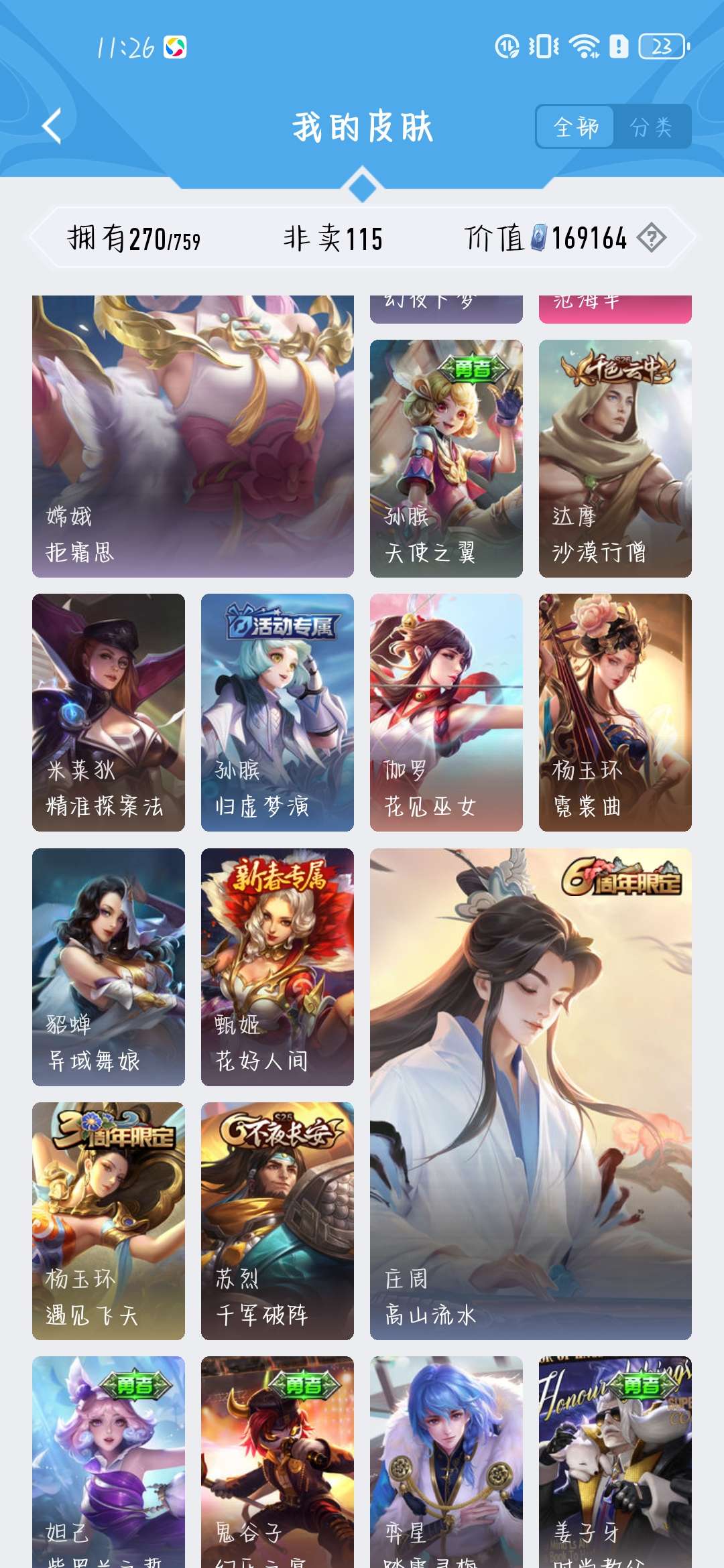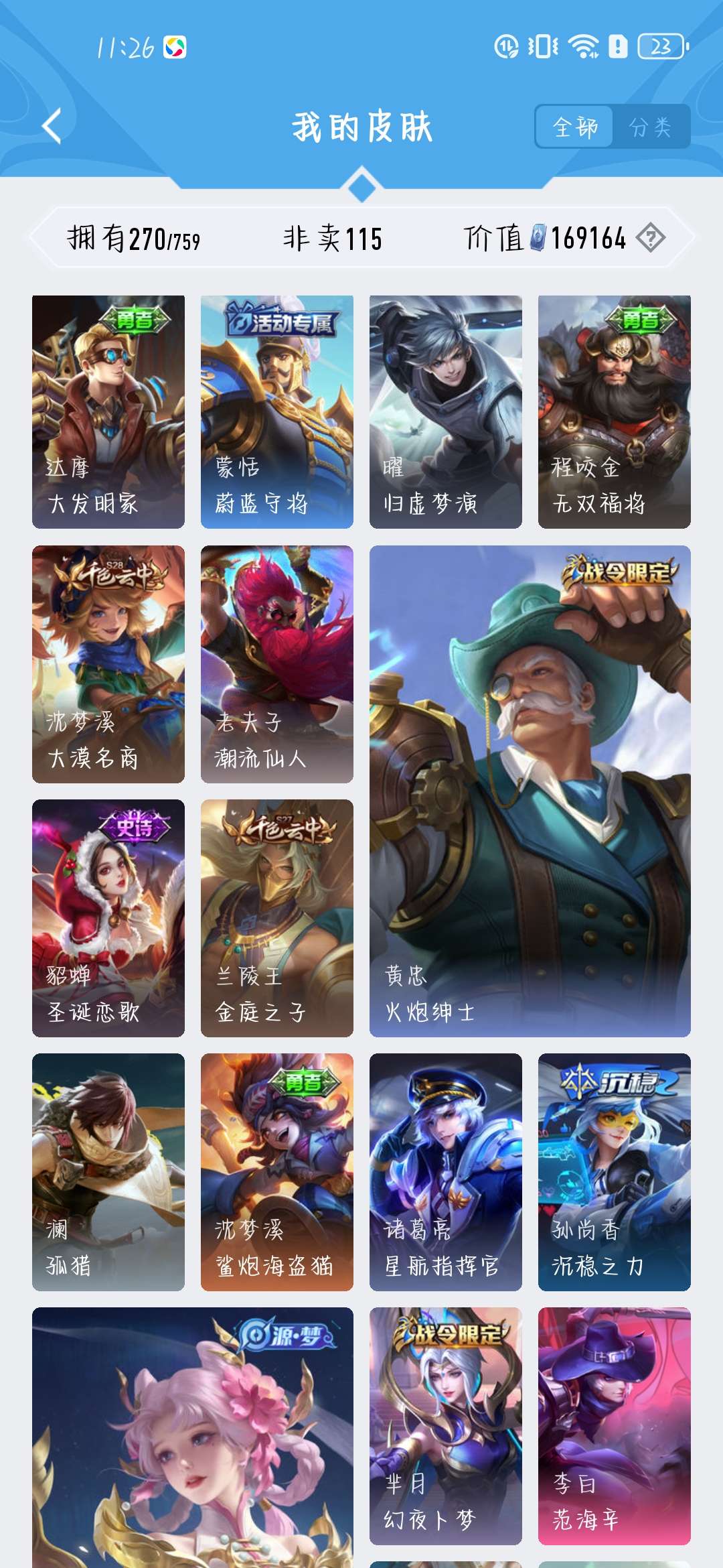 一共270个皮肤,荣耀水晶300抽,新赛季段位是星耀,标多,全能账号,低价卖,买了不亏