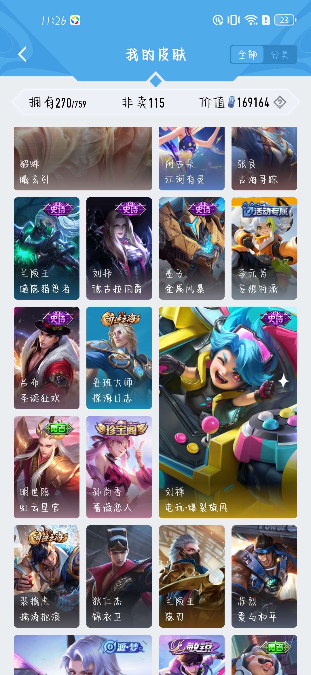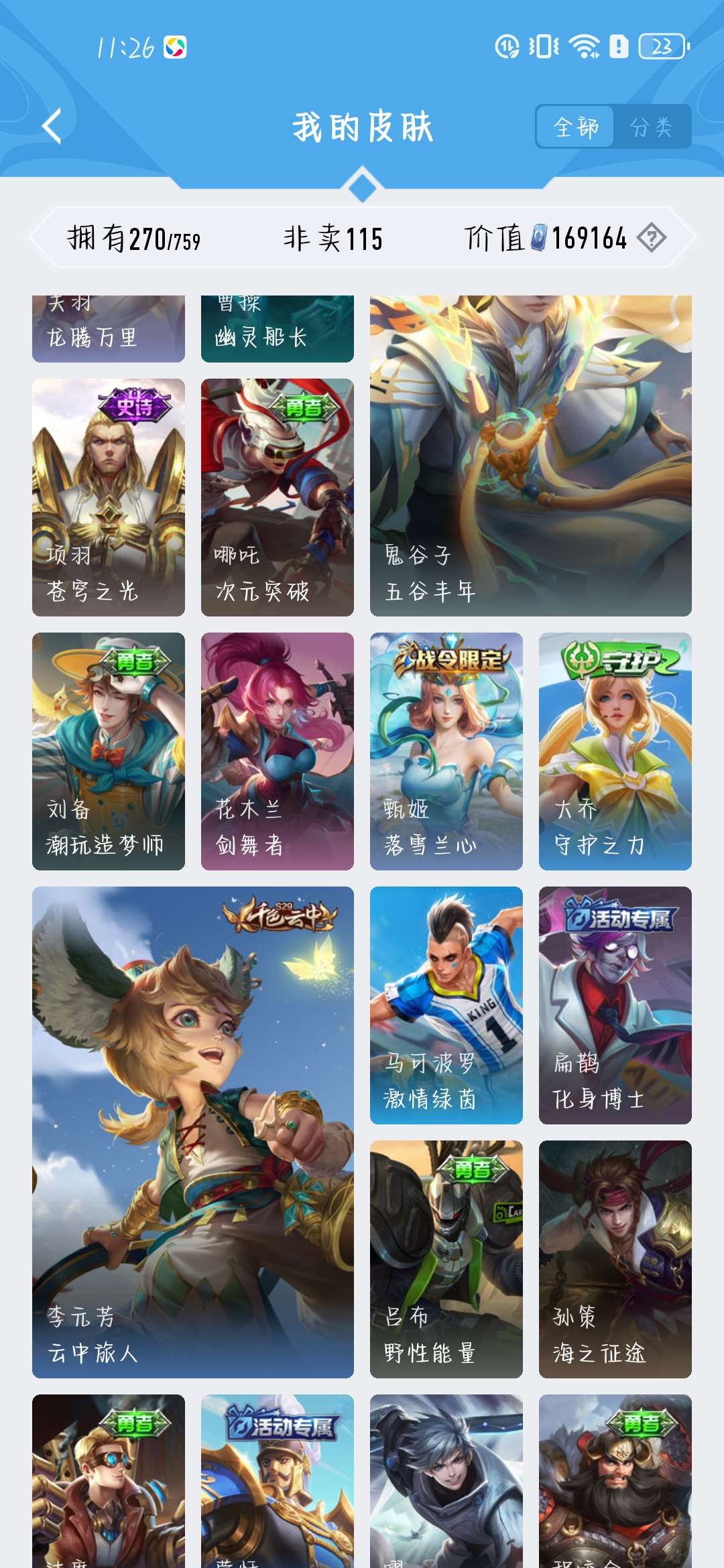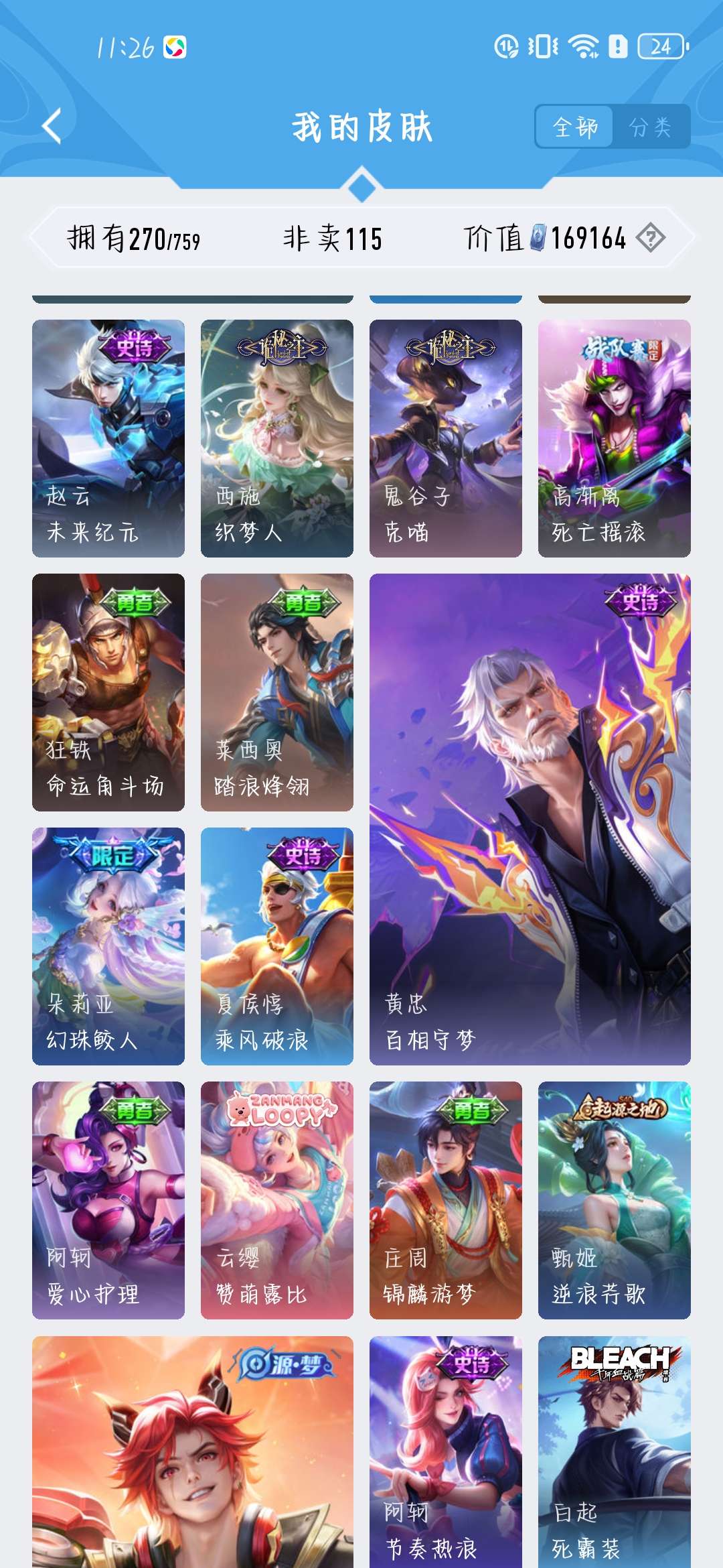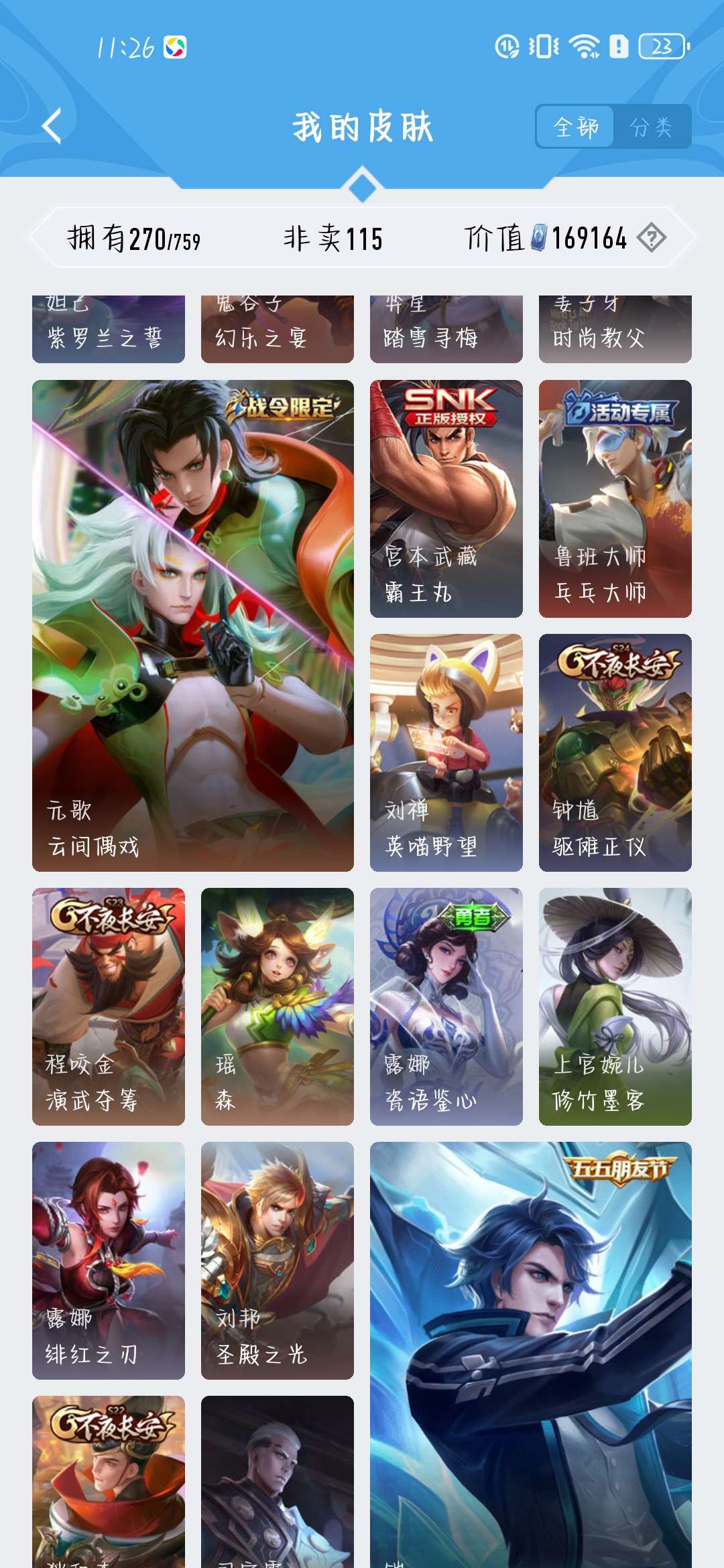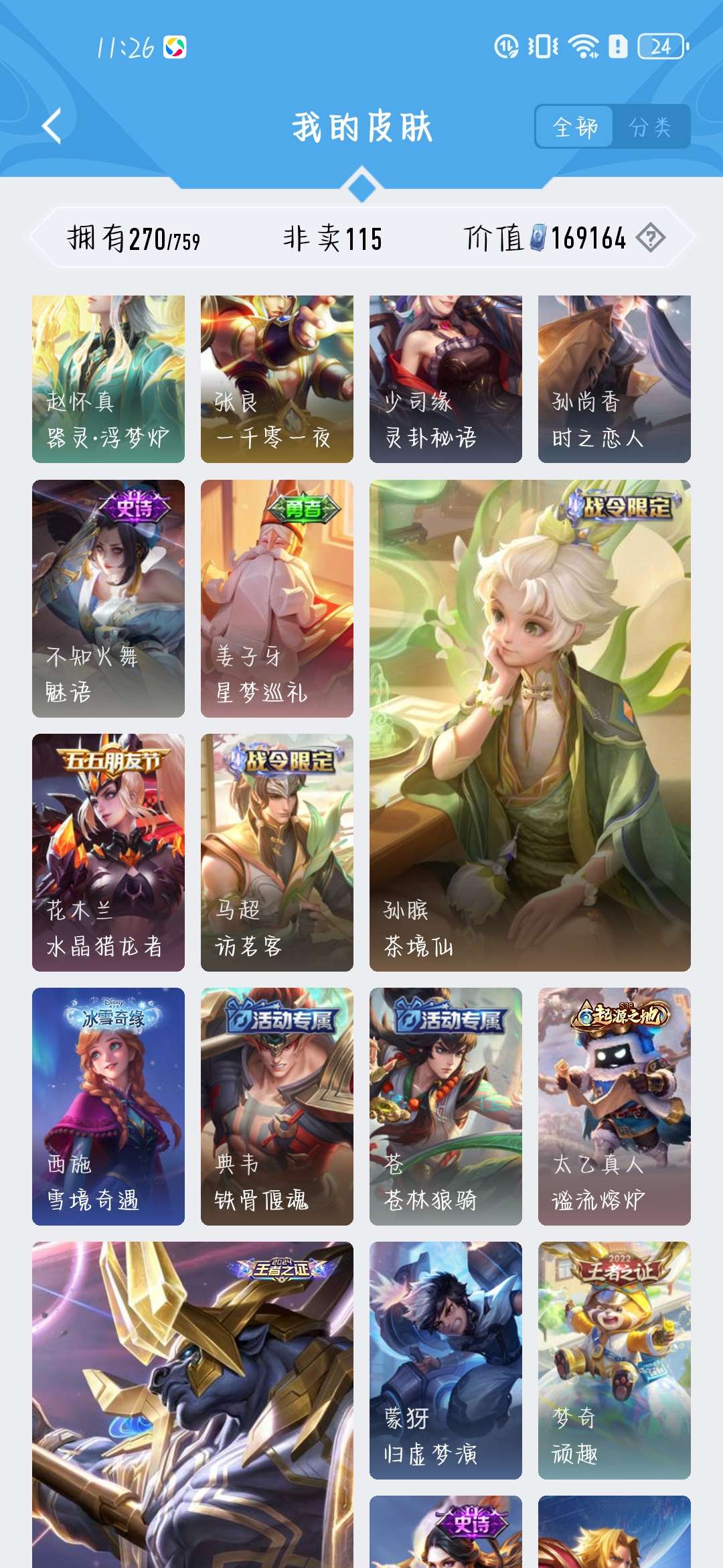 一共270个皮肤,荣耀水晶300抽,新赛季段位是星耀,标多,全能账号,低价卖,买了不亏