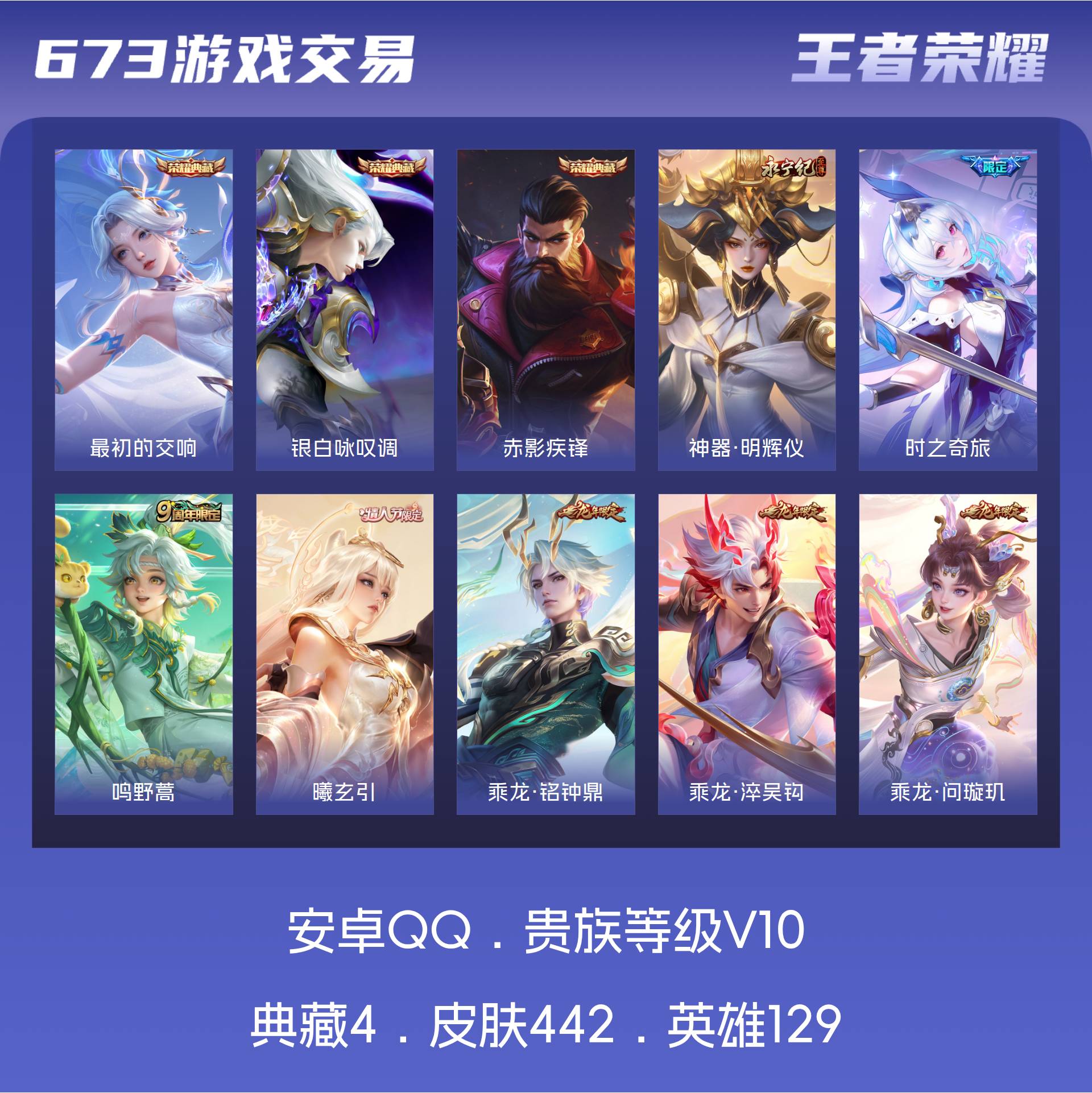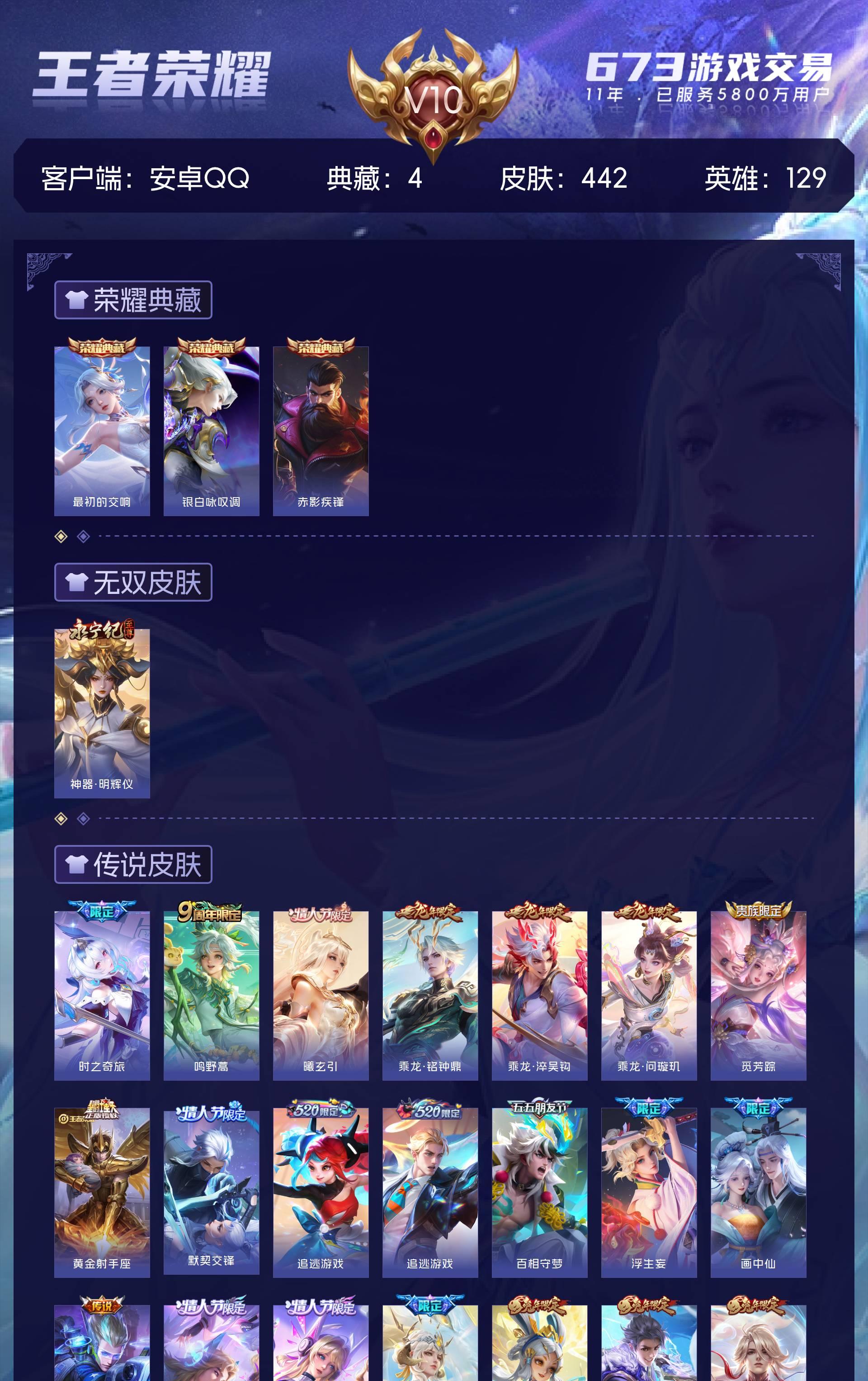 安卓QQ/至尊星耀/442皮肤/129英雄/3典藏/0珍品无双/1无双/0珍品传说/37传说/148