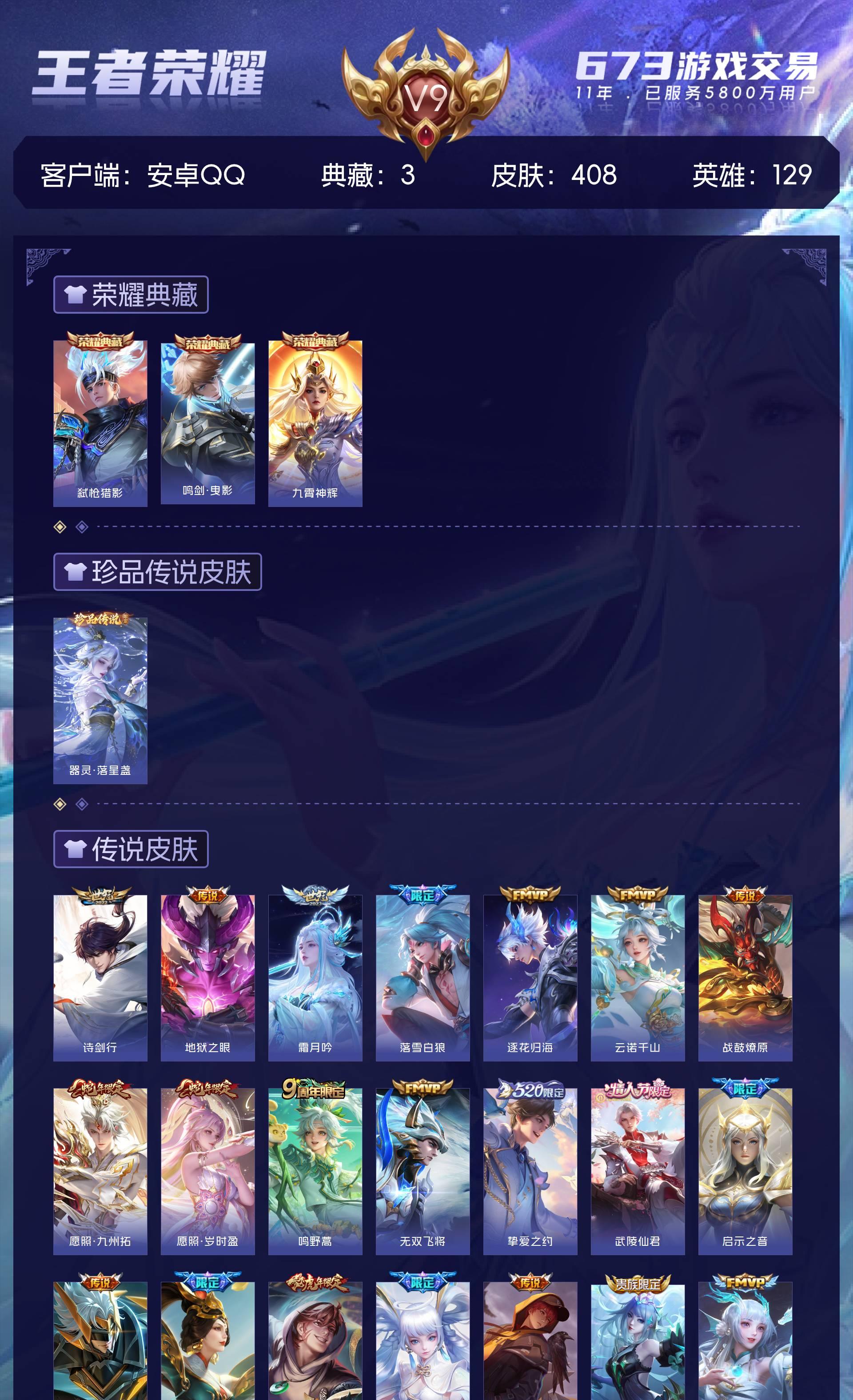 V9 皮肤408 英雄129 至尊星耀 荣耀典藏3 珍品传说1 传说39 其他皮肤371