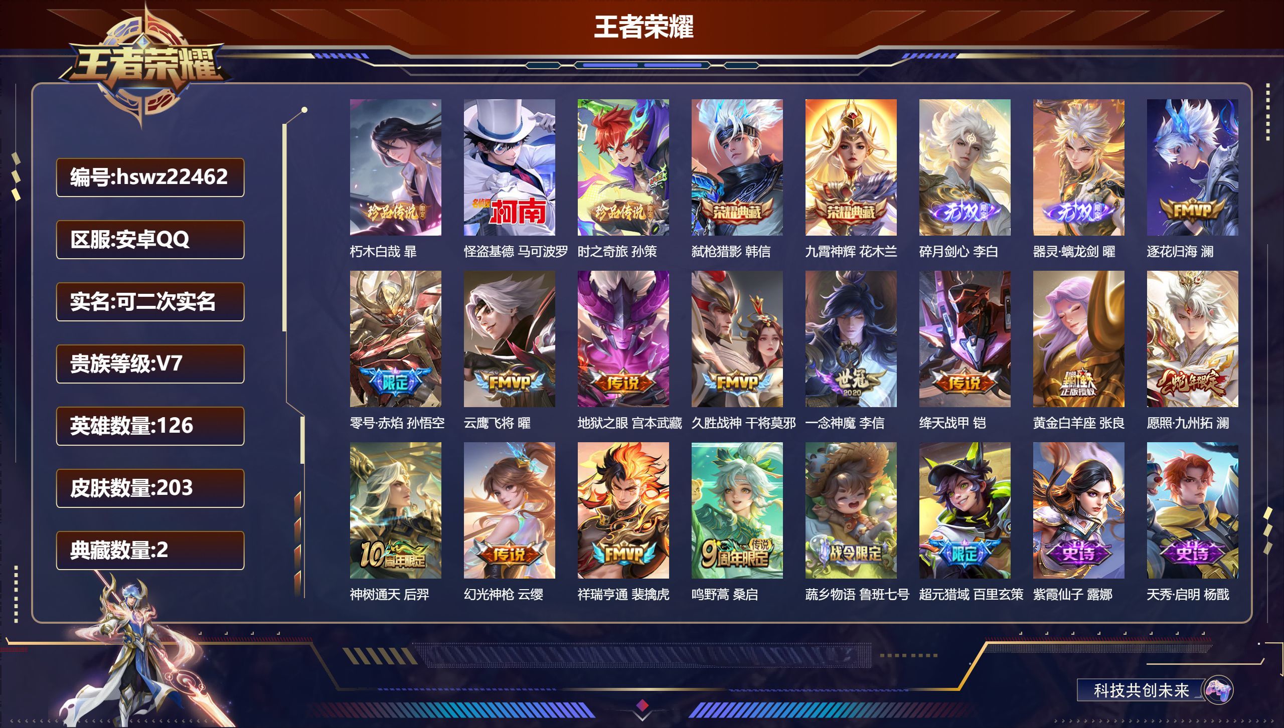 安卓QQ/至尊星耀/203皮肤/126英雄/2典藏/0珍品无双/2无双/3珍品传说/13传说/64史