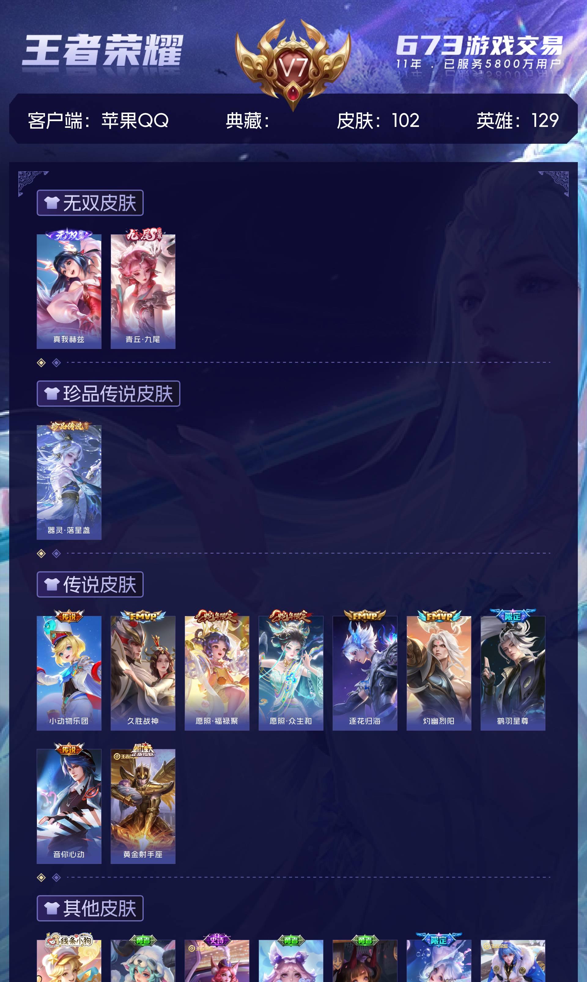 V7 皮肤102 英雄129 尊贵铂金 无双皮肤2 珍品传说1 传说9 其他皮肤95