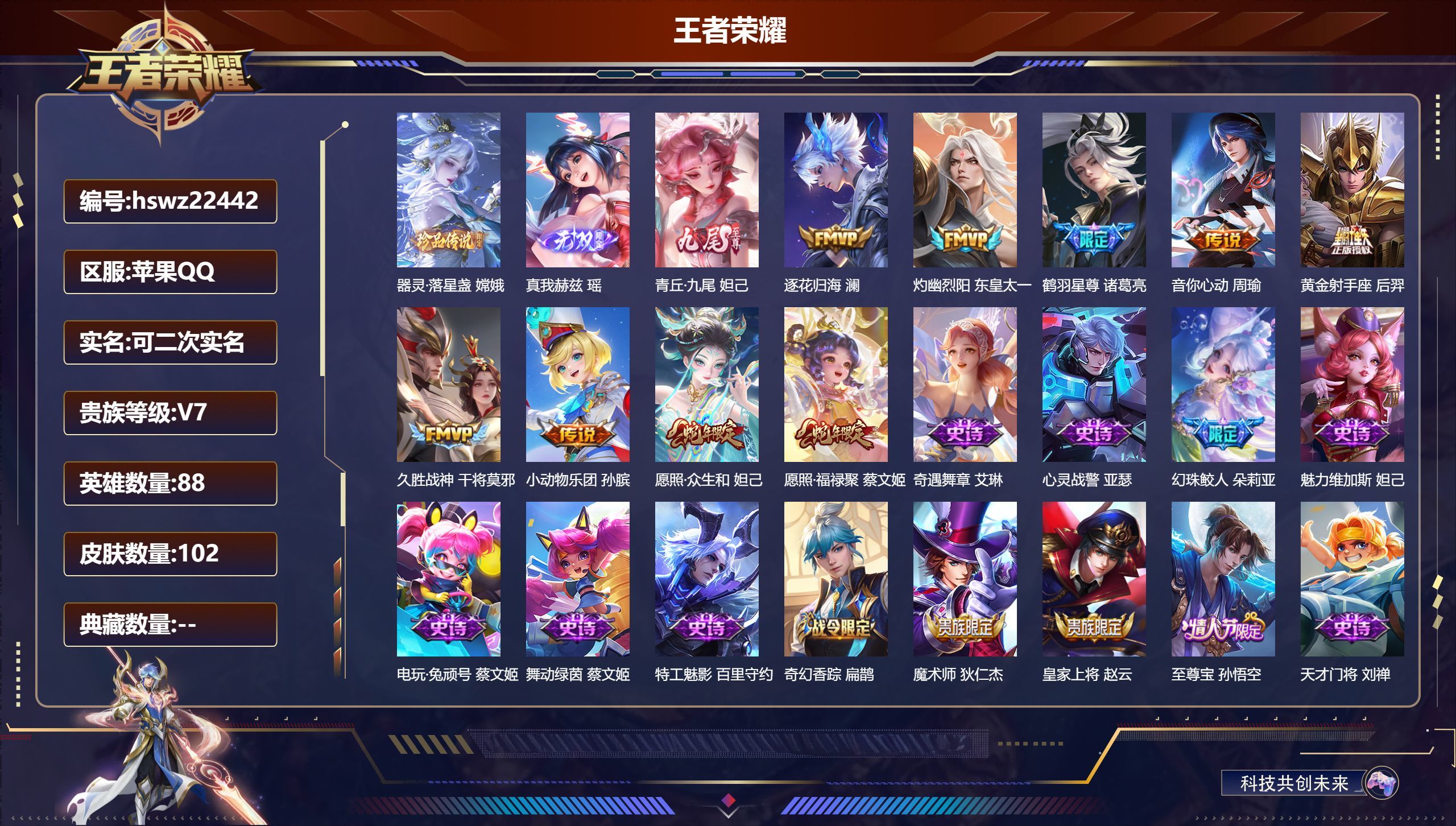 苹果QQ/尊贵铂金/102皮肤/88英雄/0典藏/0珍品无双/2无双/1珍品传说/9传说/21史诗/