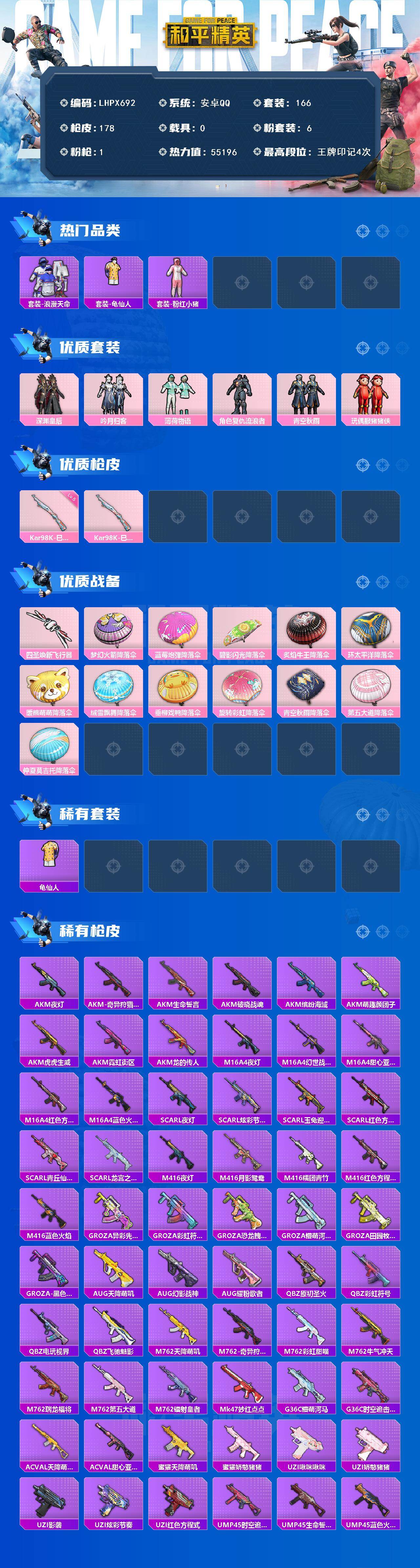 【特价出售/店主推荐】安卓 手Q-6粉装-1特效枪-0载具-1粉色飞行器-55196热力值-4王牌印记-166套装-178枪皮