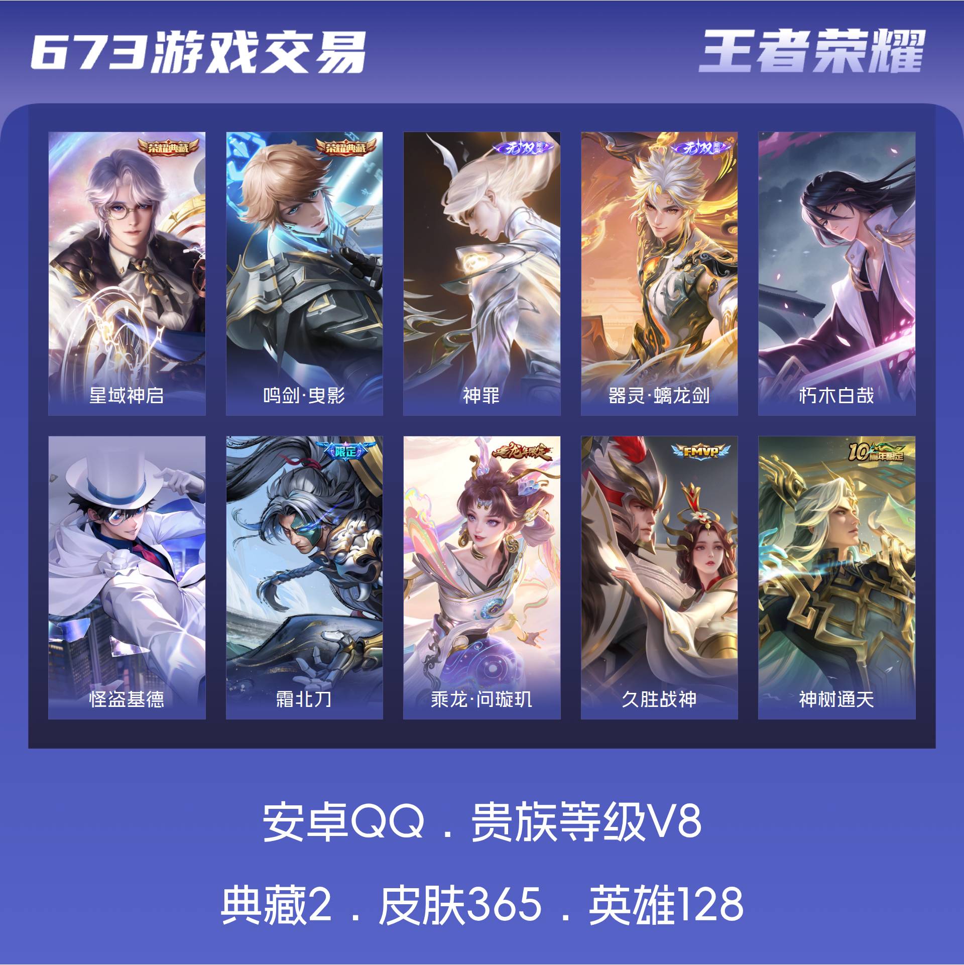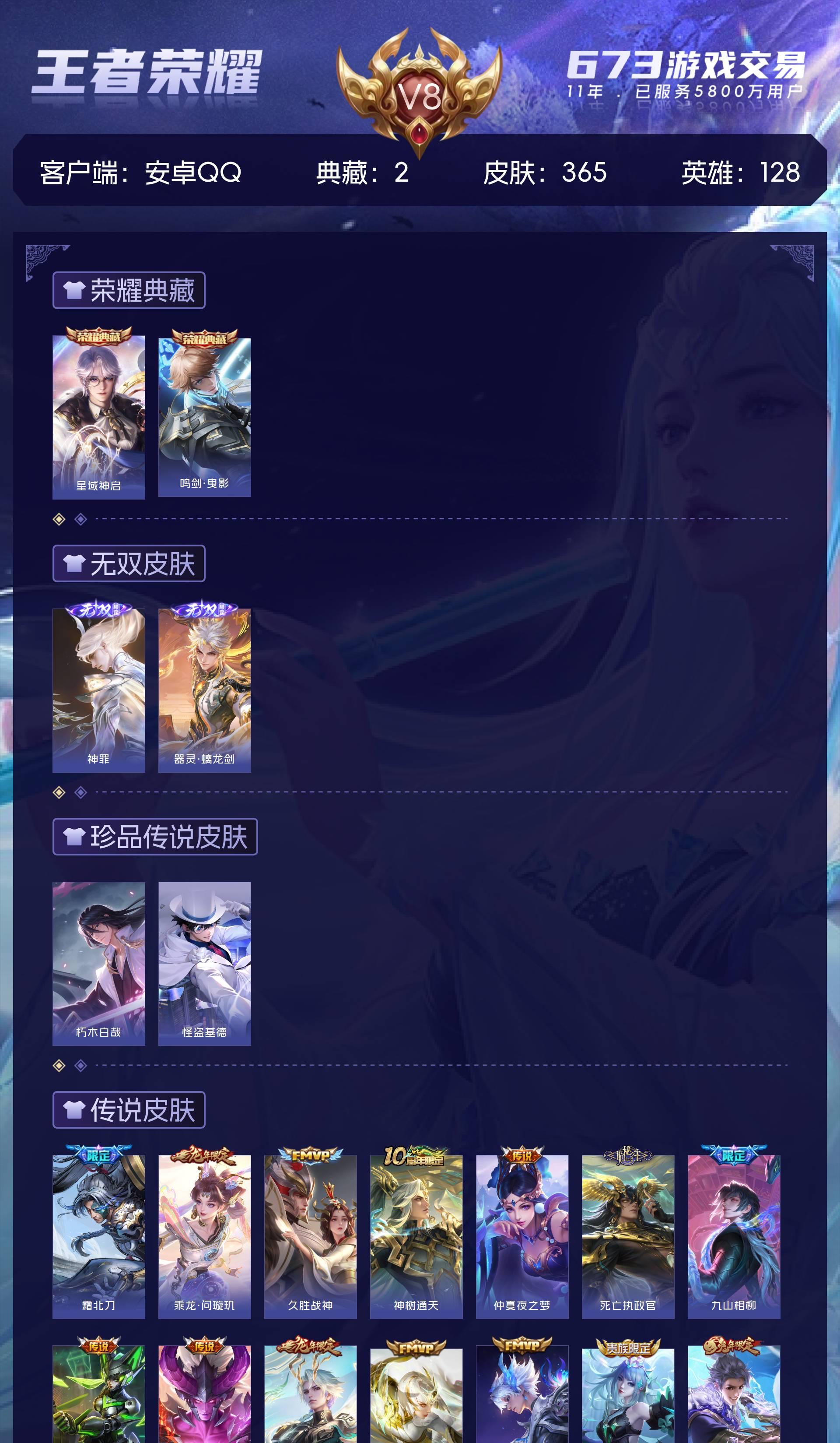 安卓QQ/永恒钻石/365皮肤/128英雄/2典藏/0珍品无双/2无双/2珍品传说/30传说/112