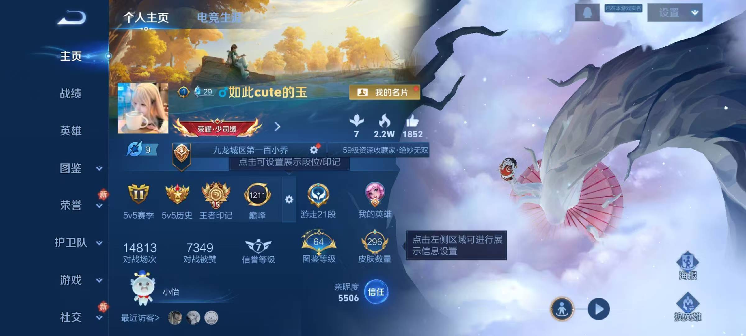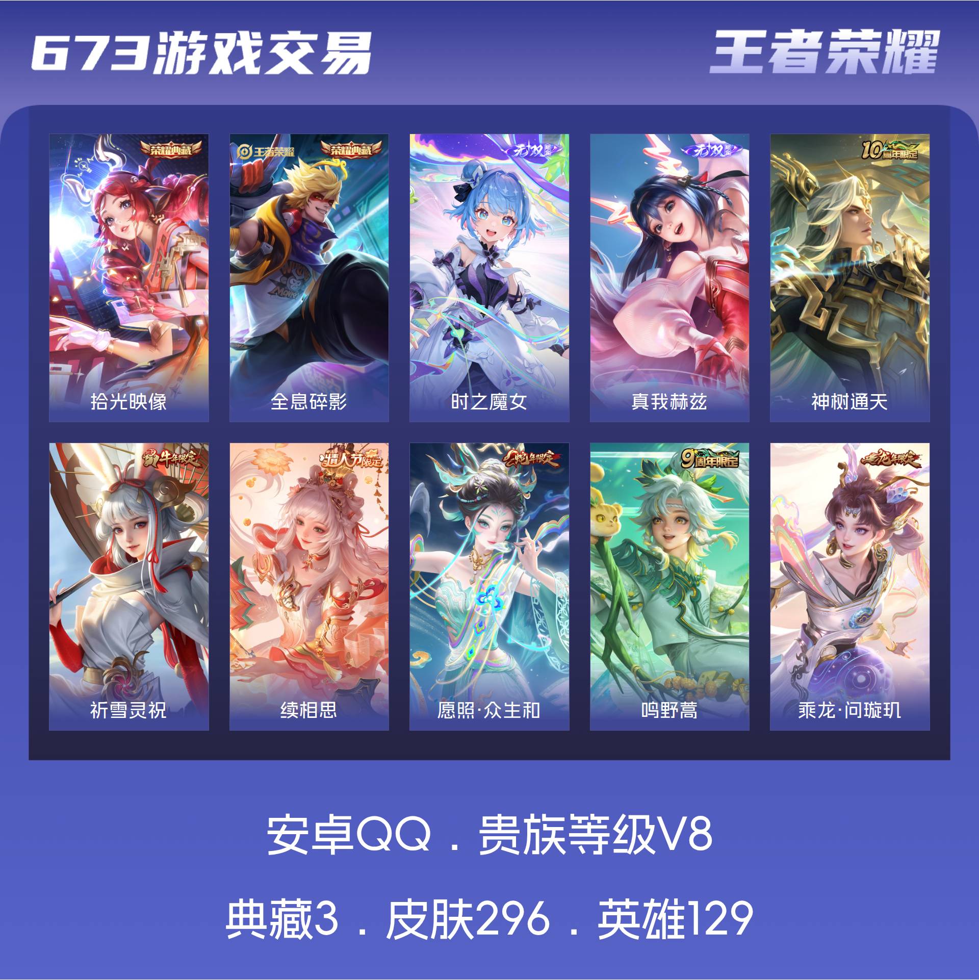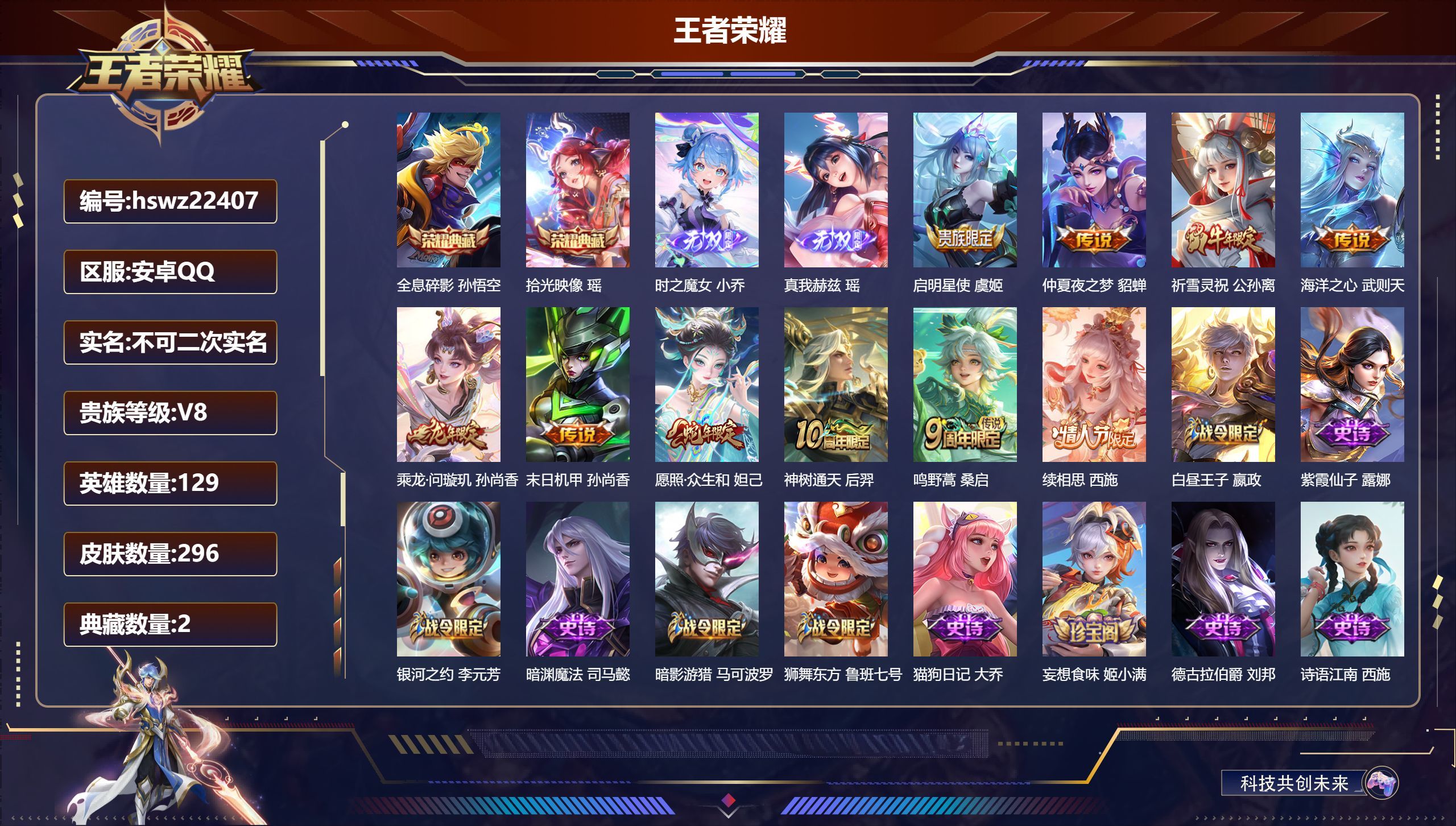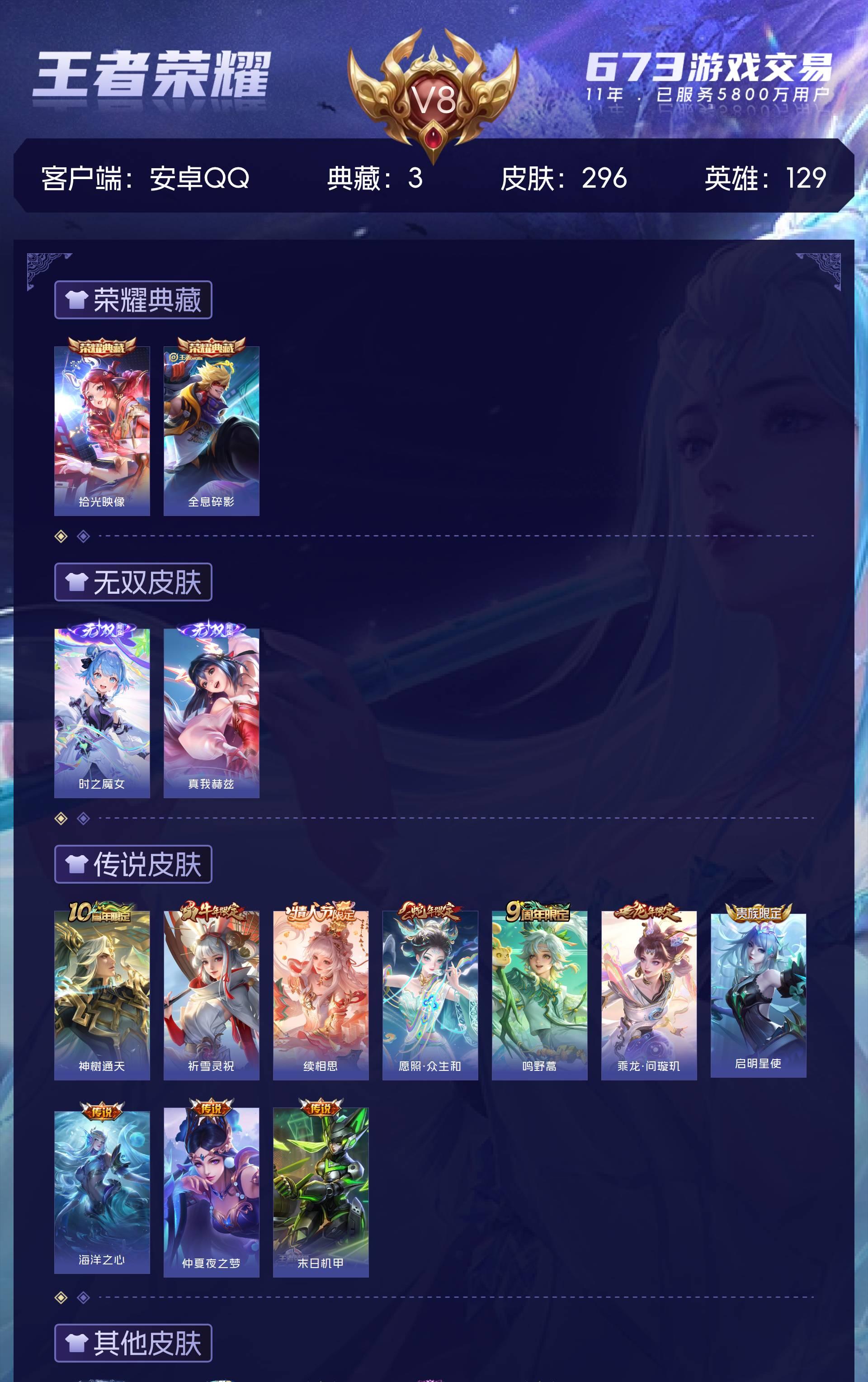 安卓QQ/至尊星耀/296皮肤/129英雄/2典藏/0珍品无双/2无双/0珍品传说/10传说/73史