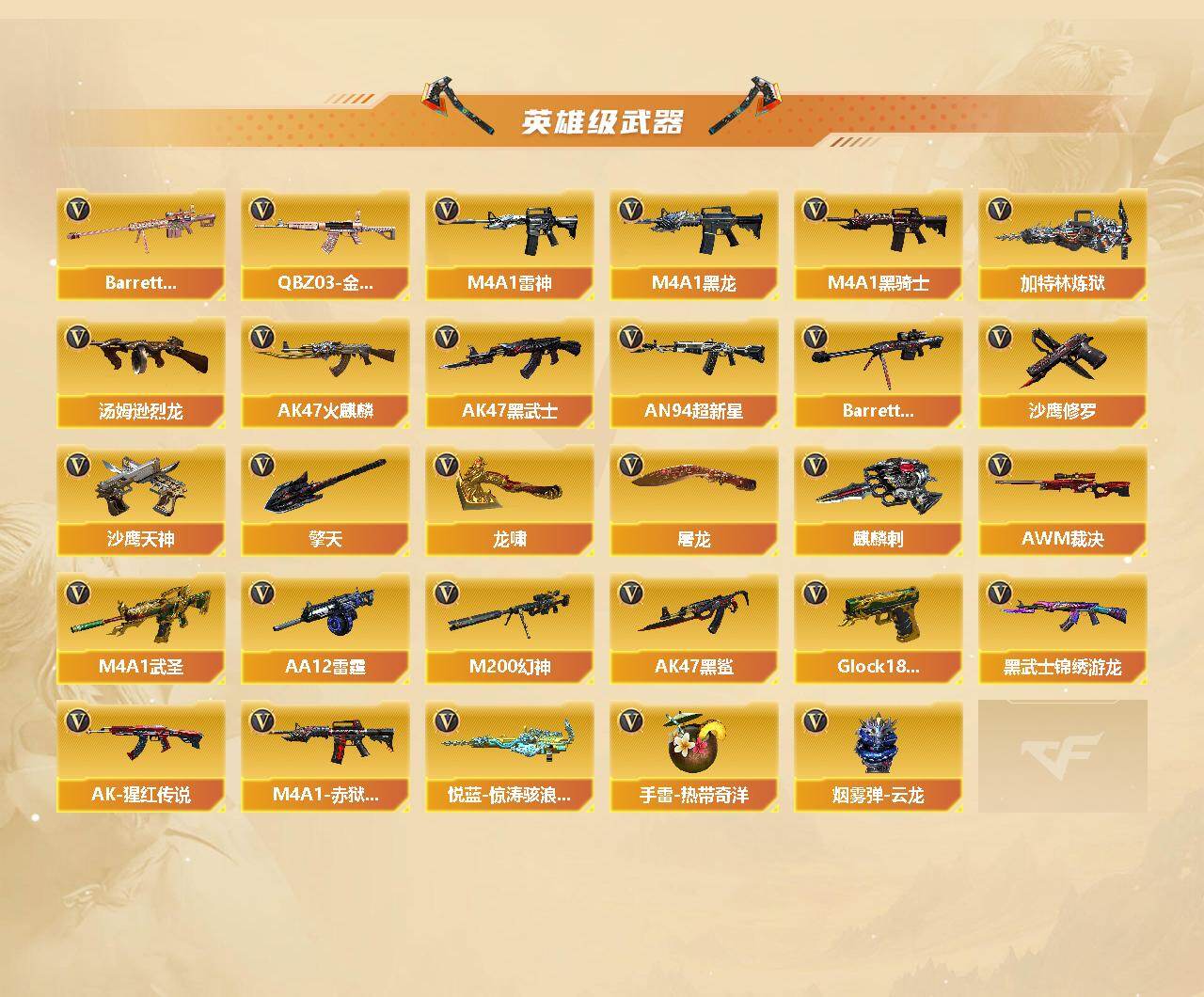 【热门武器】:QBZ03-金色蔷薇,M200-幻神,死亡之眼*3,C.A.T,M4A1-黑骑士,汤姆逊-烈龙*6,加特林-炼狱*2,沙鹰-修罗*2