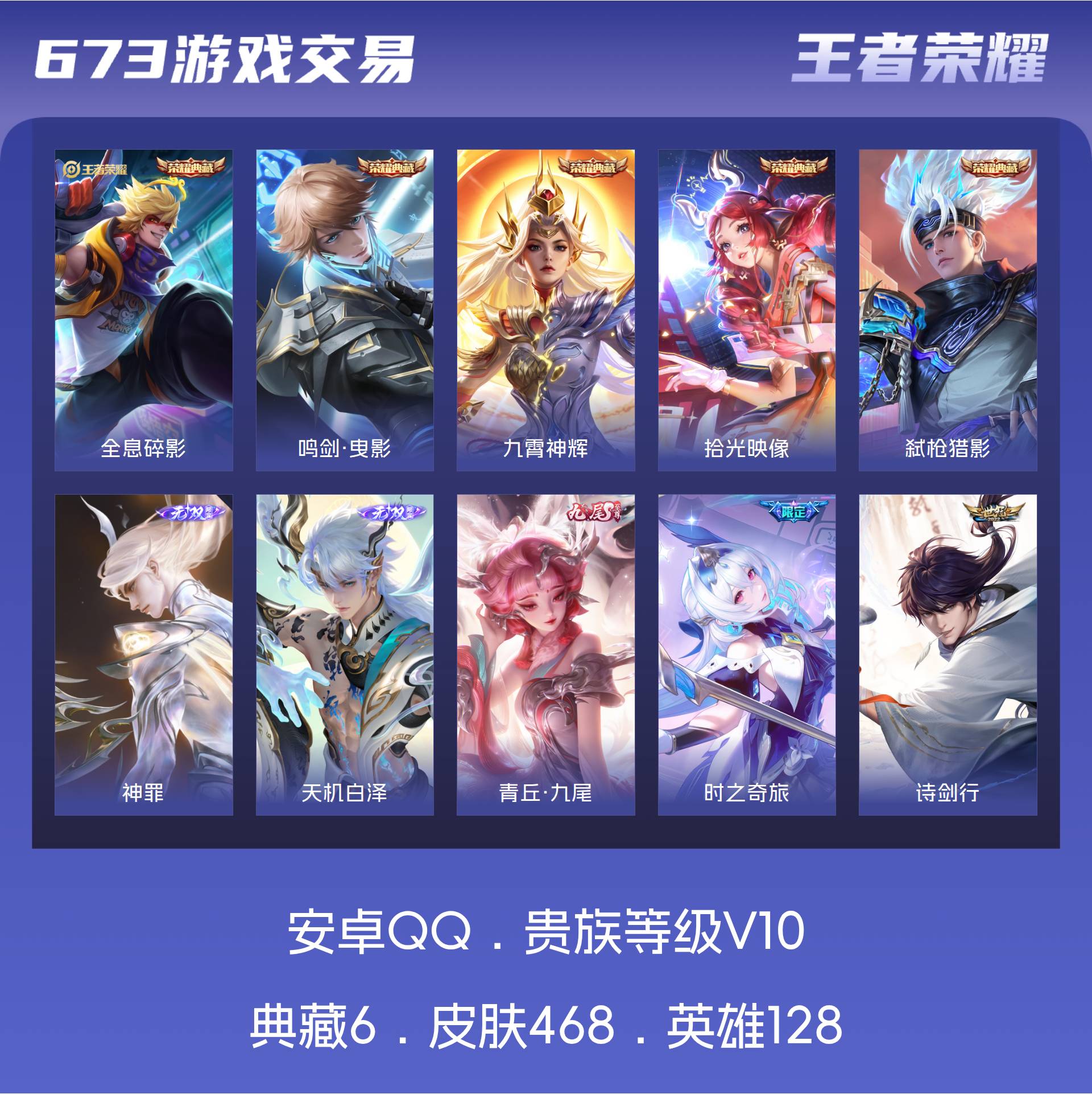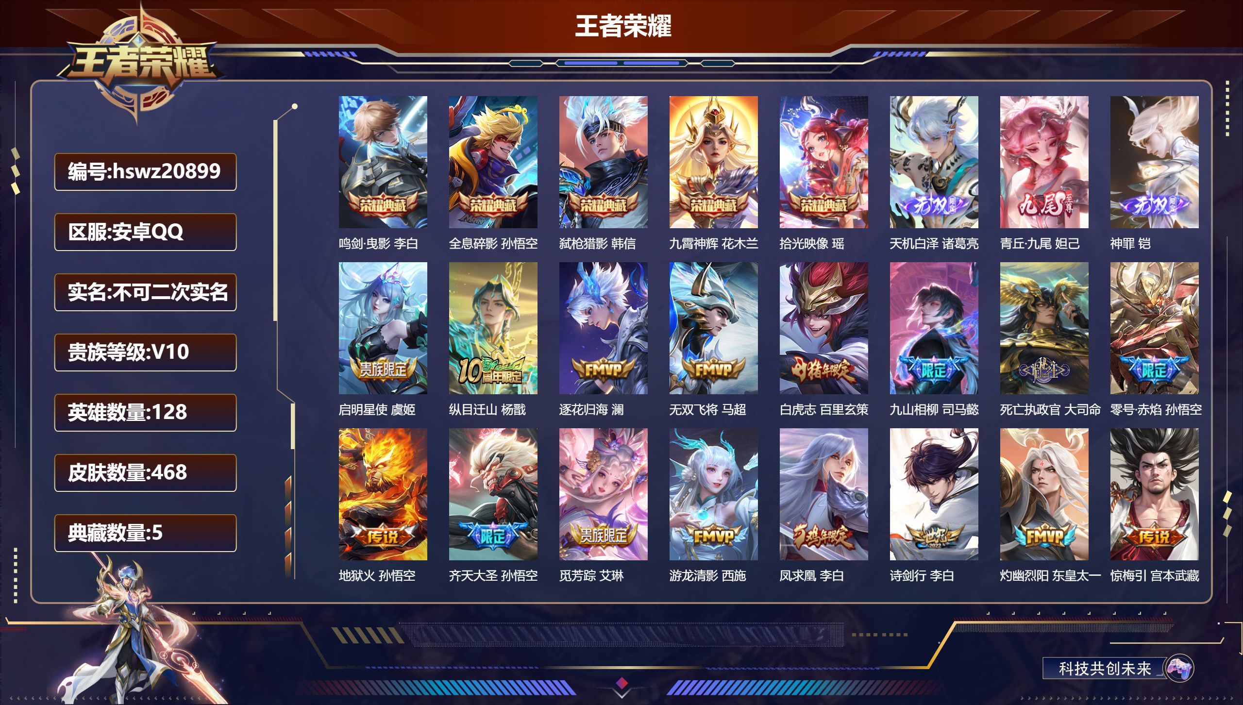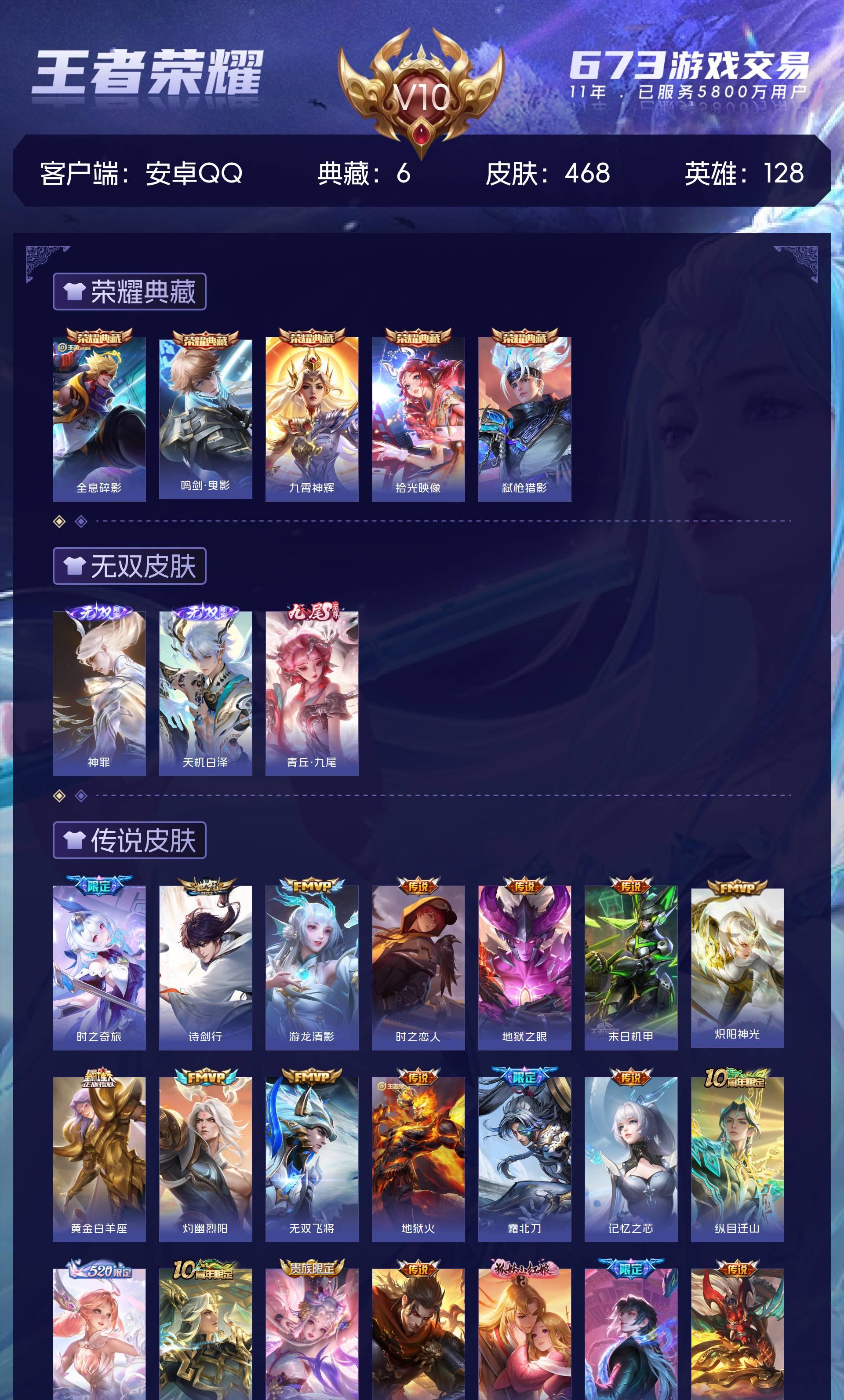 安卓QQ/荣耀王者/468皮肤/128英雄/5典藏/0珍品无双/3无双/0珍品传说/63传说/140