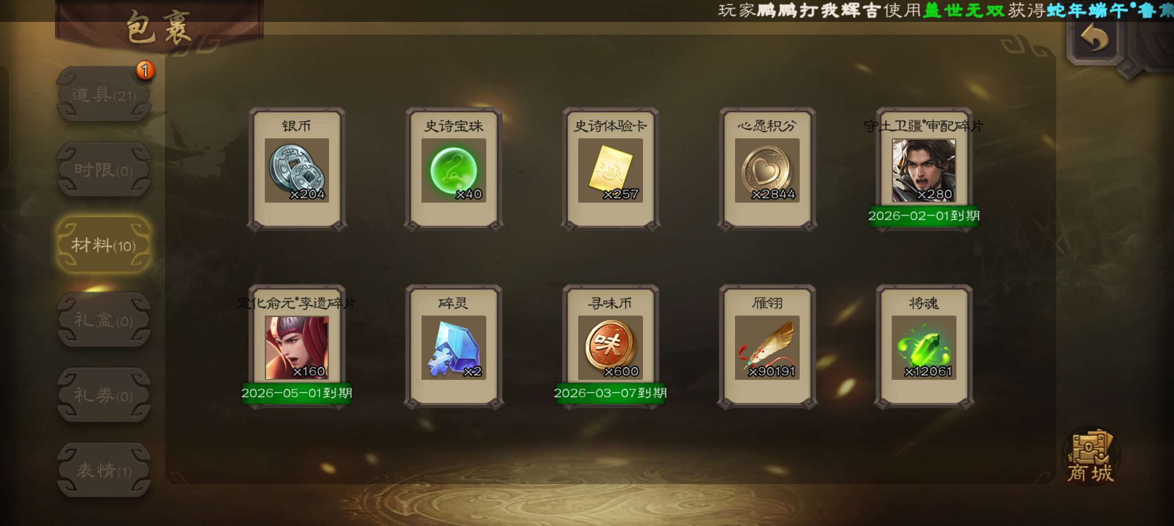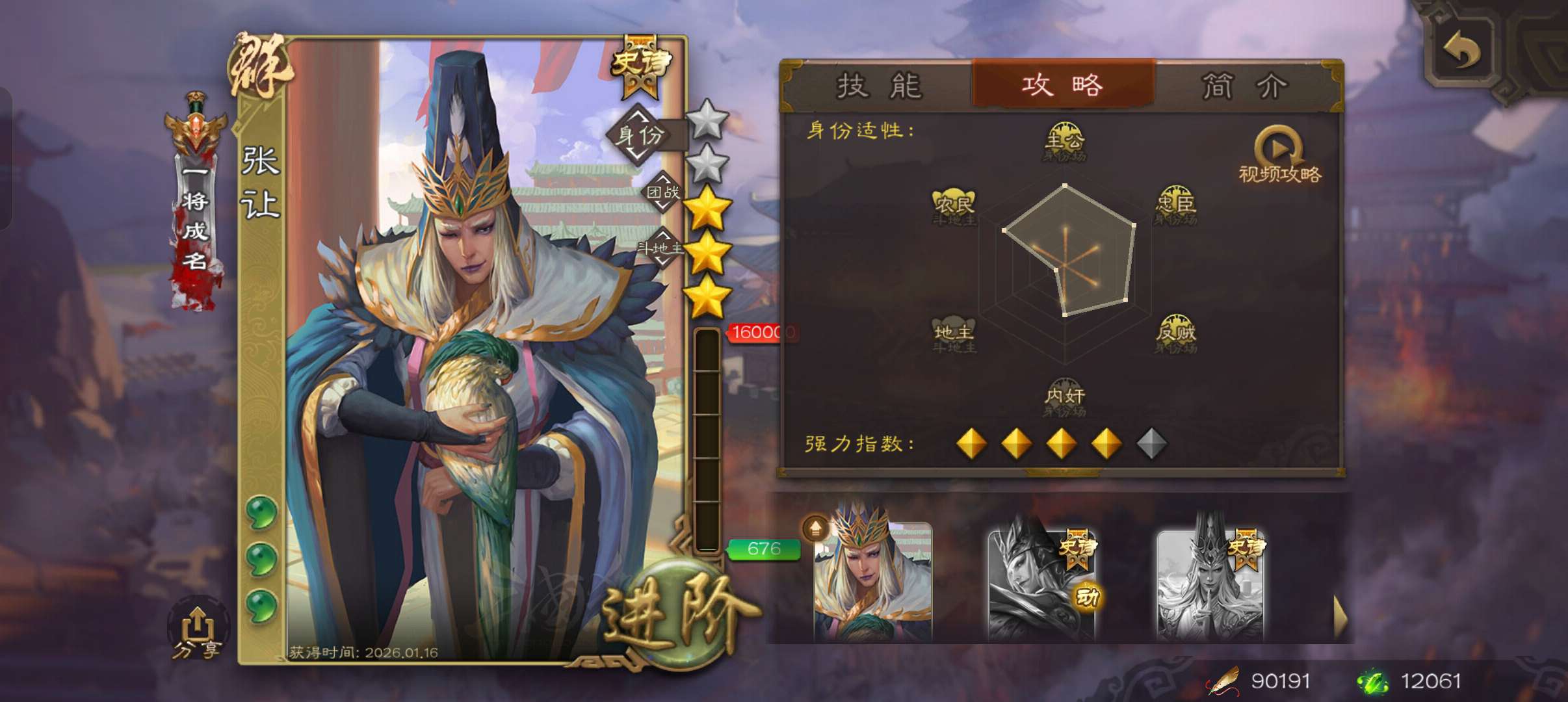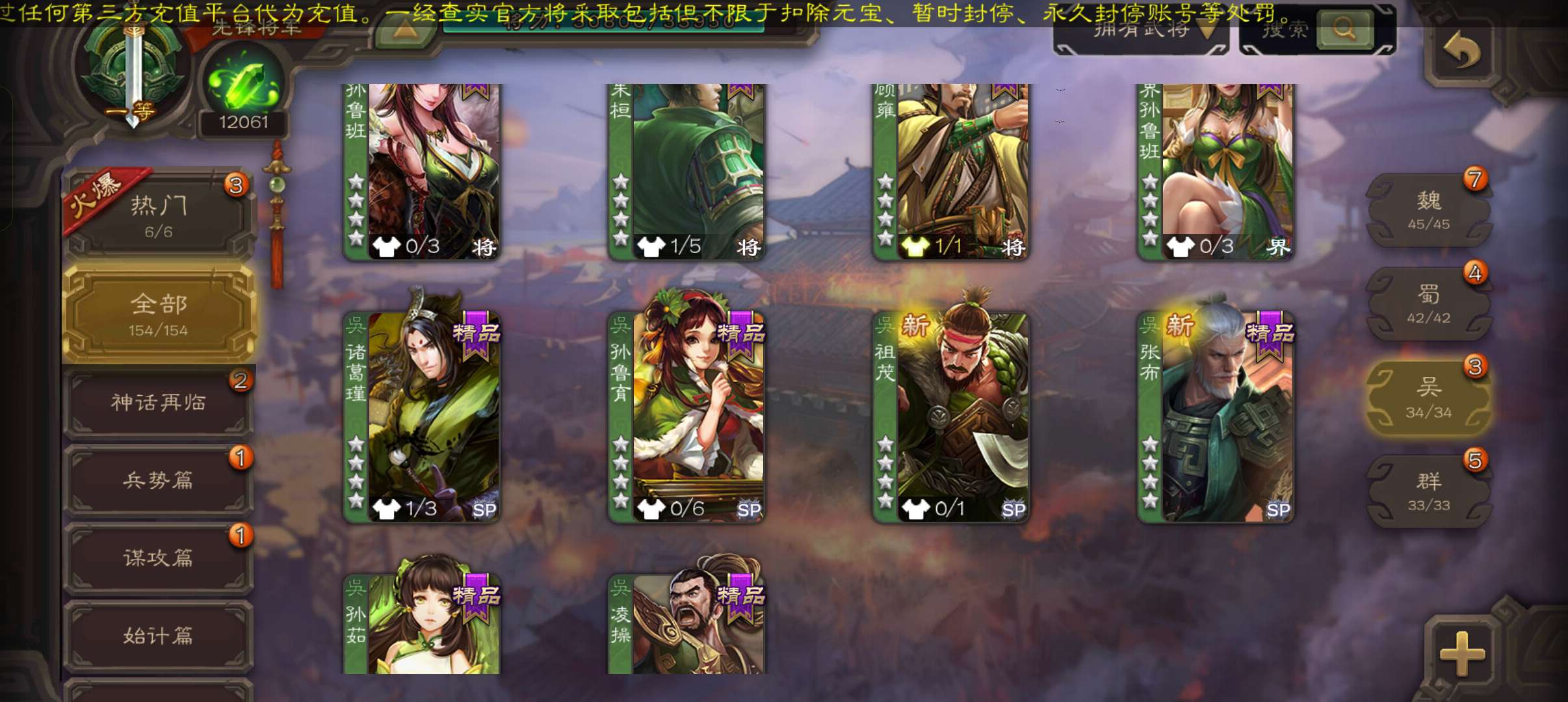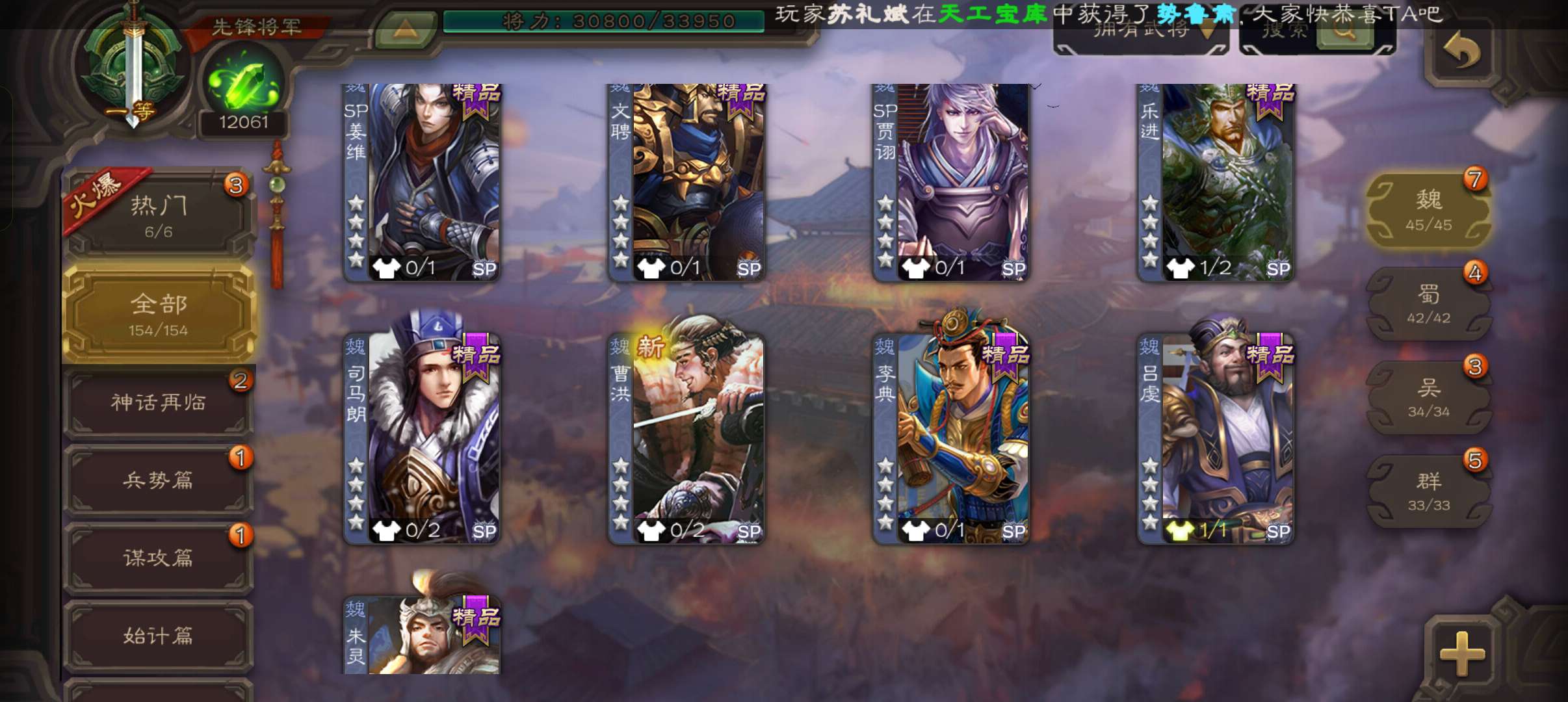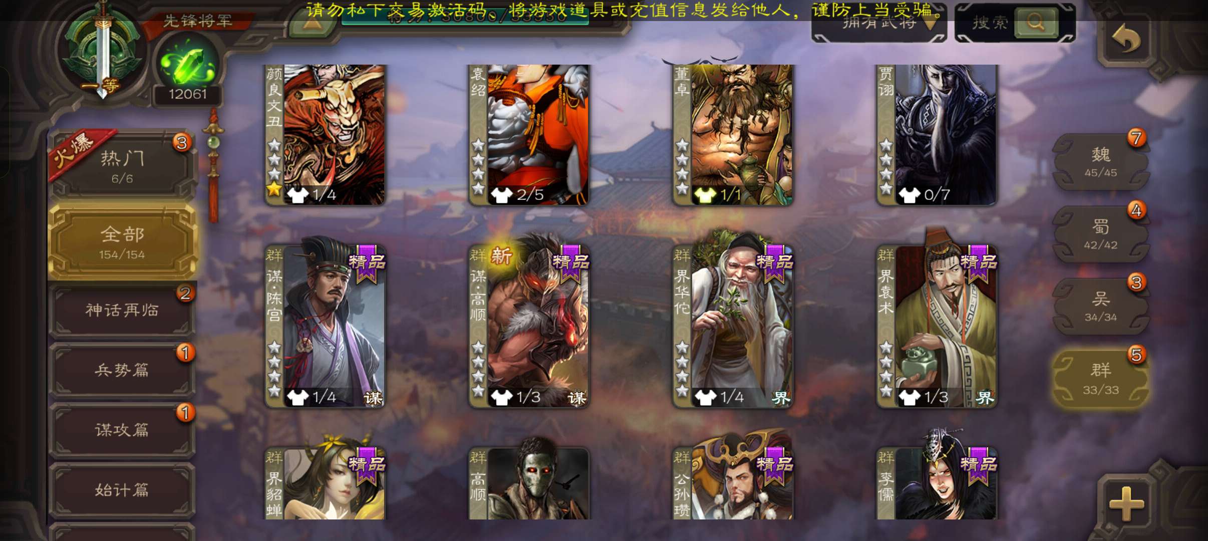 40宝珠9万羽毛1.2万将魂6.7万豆,张让花鬘董允3史诗先锋,关银屏谋高顺谋韩当154将一等先锋