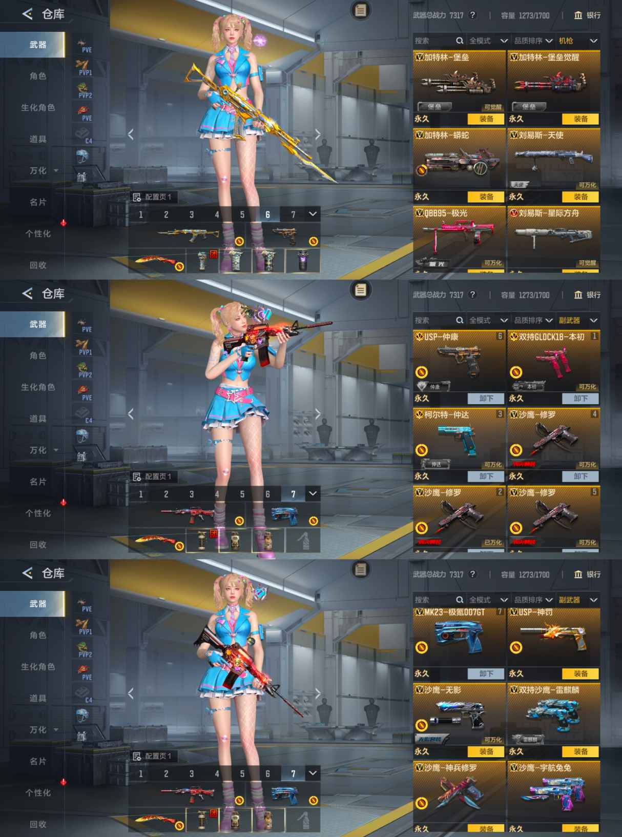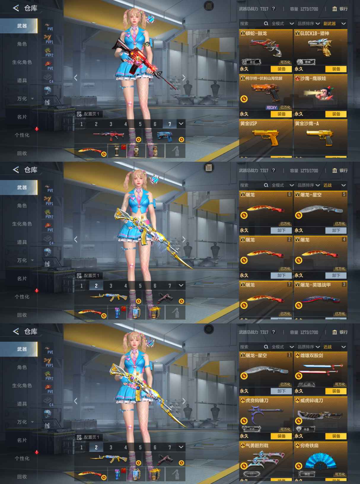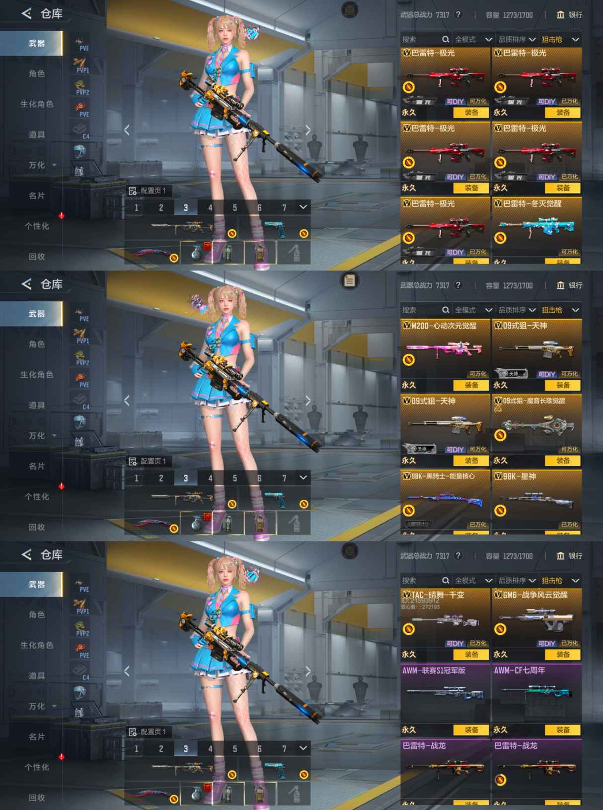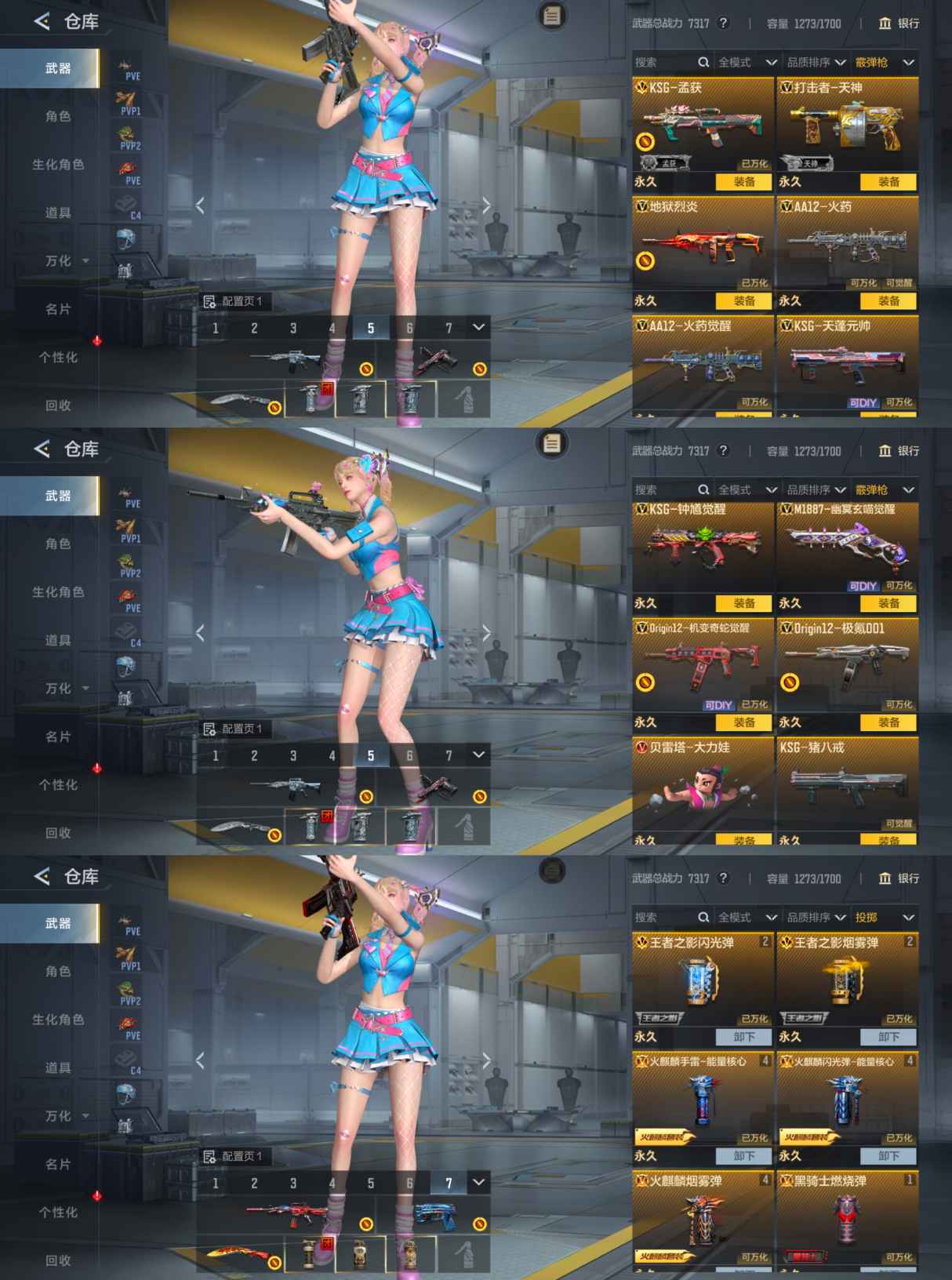 【金V角色】 萝拉 祝融夫人 祝融夫人 葵 【金V武器】 巴雷特-极光 M4A1-死神 巴雷特-极光 手雷-游骑兵 M4A1-死神 AK47-无影 沙鹰-宇航兔兔 龙啸 巴雷特-毁灭 M4A1-死神 KSG-钟馗觉醒 AK47-雷麒麟 烟雾弹-星际宇航 QCW05-变形金刚·大黄蜂 M4A1-雷神 M4A1-