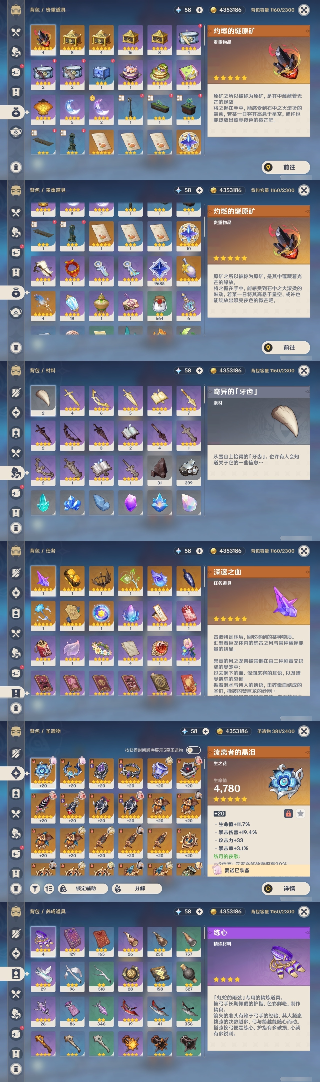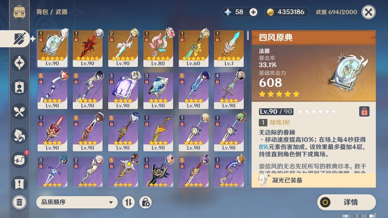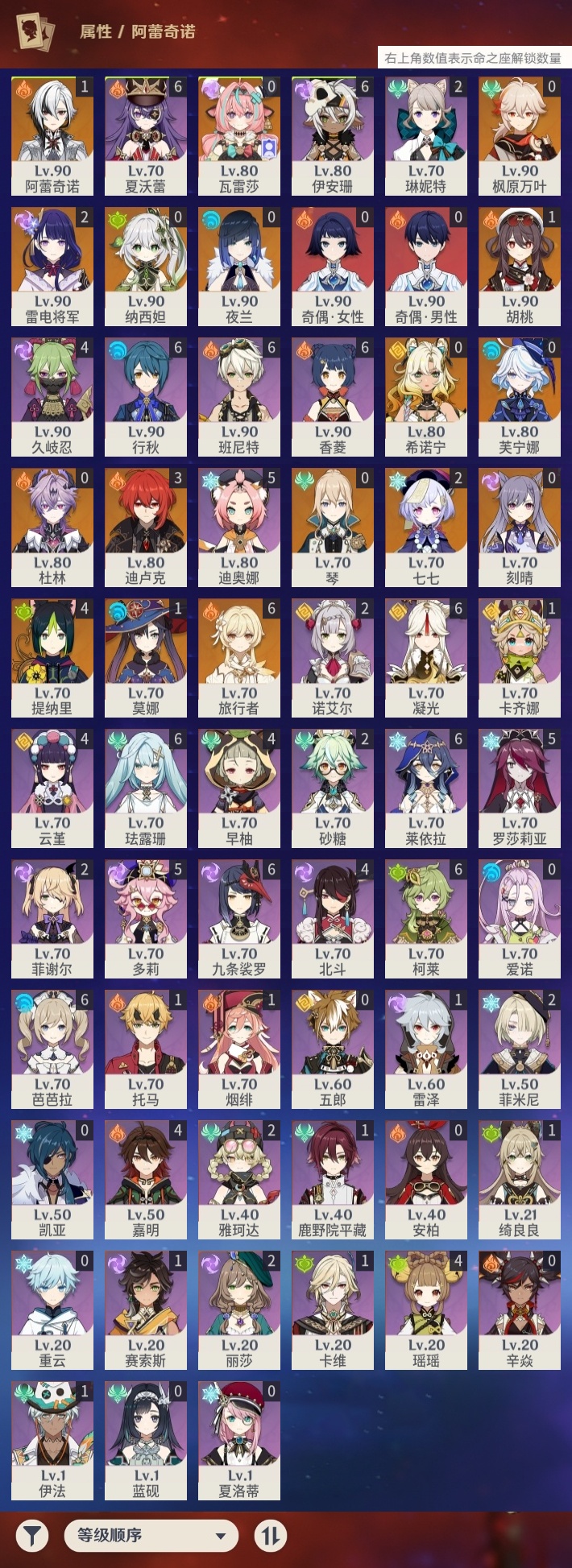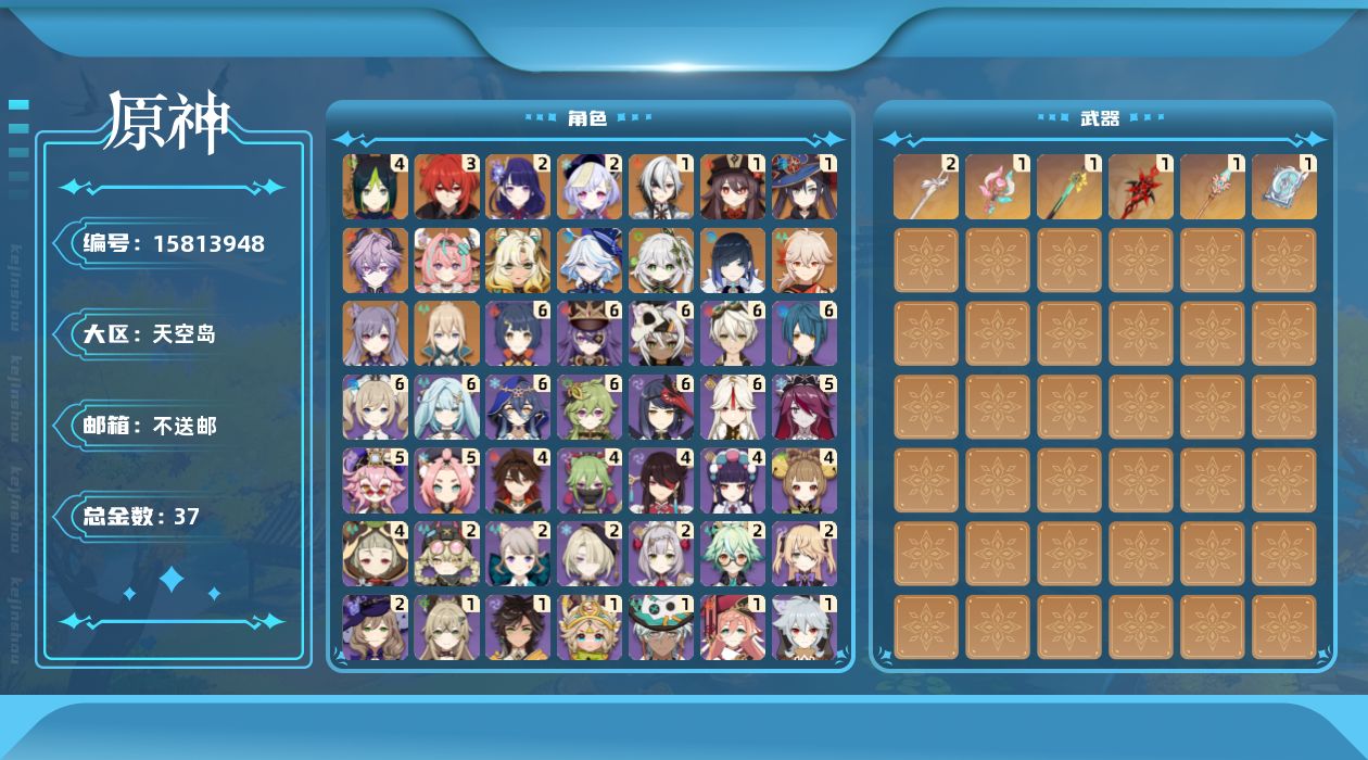 19330 邮箱: 不送邮/死邮 总黄数: 37 冒险等级: 59 4命金色角色: 四命提纳里 3命金色角色: 三命迪卢克 2命金色角色: 二命七七,二命雷电将军 1命金色角色: 一命莫娜,一命胡桃,一命阿蕾奇诺 0命金色角色: 枫原万叶,刻晴,琴,夜兰,纳西妲,芙宁娜,希诺宁,瓦雷莎,杜林 拥有武器: 四风原典,风鹰剑,天空之脊,赤月之形,岩峰巡歌,溢彩心念 2精武器: 风鹰剑 1精武器: 四风