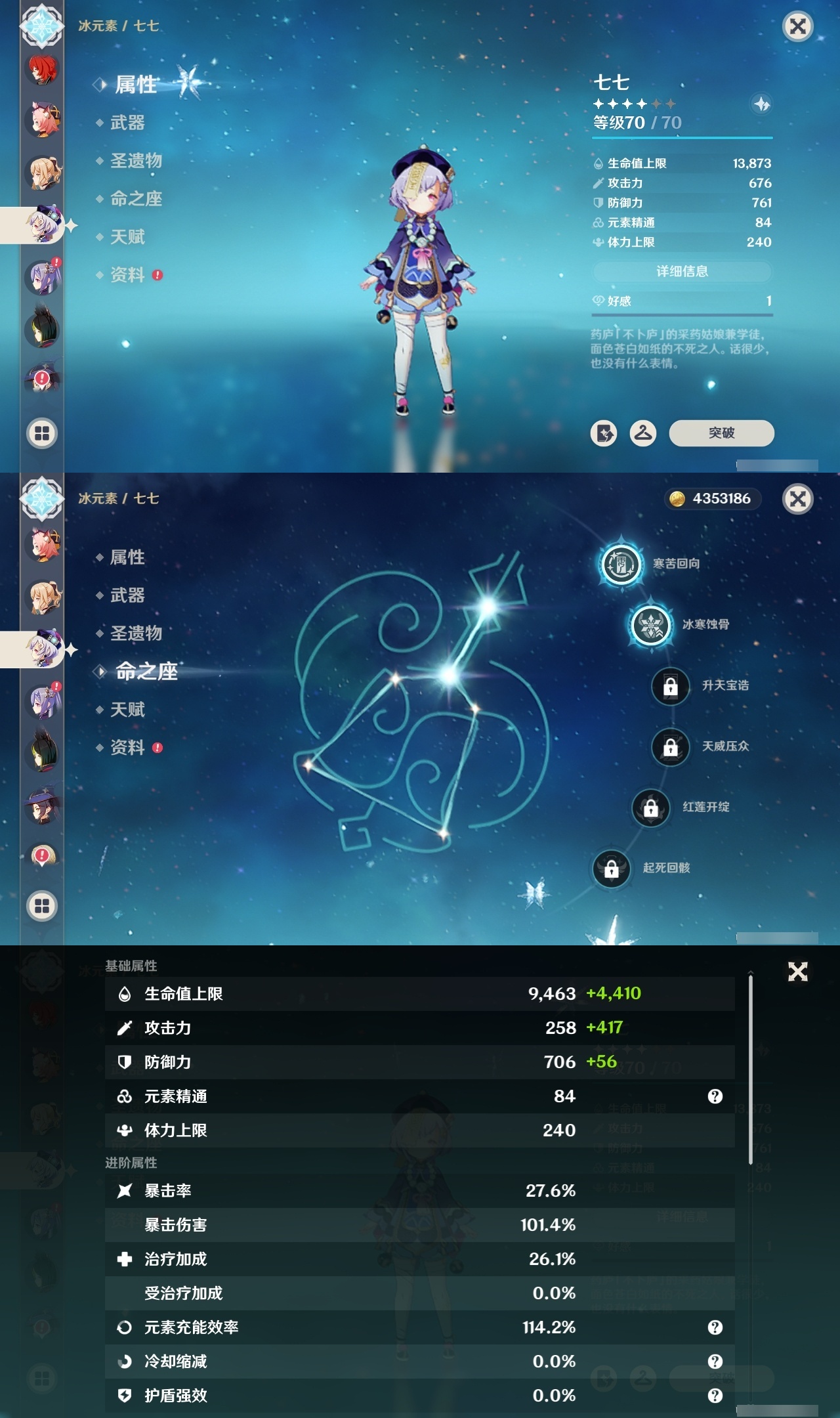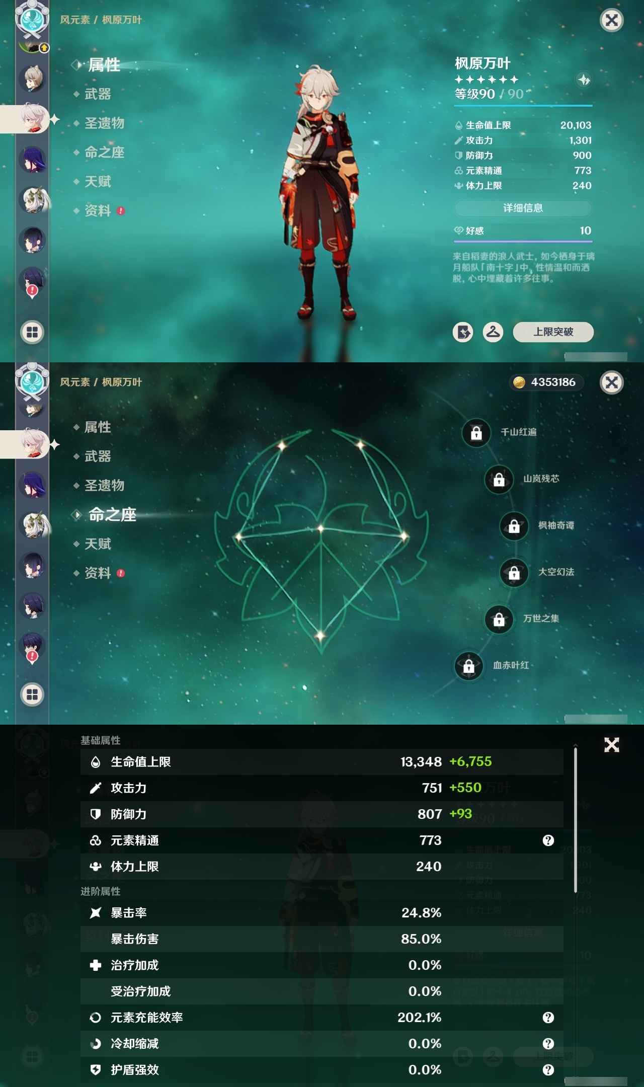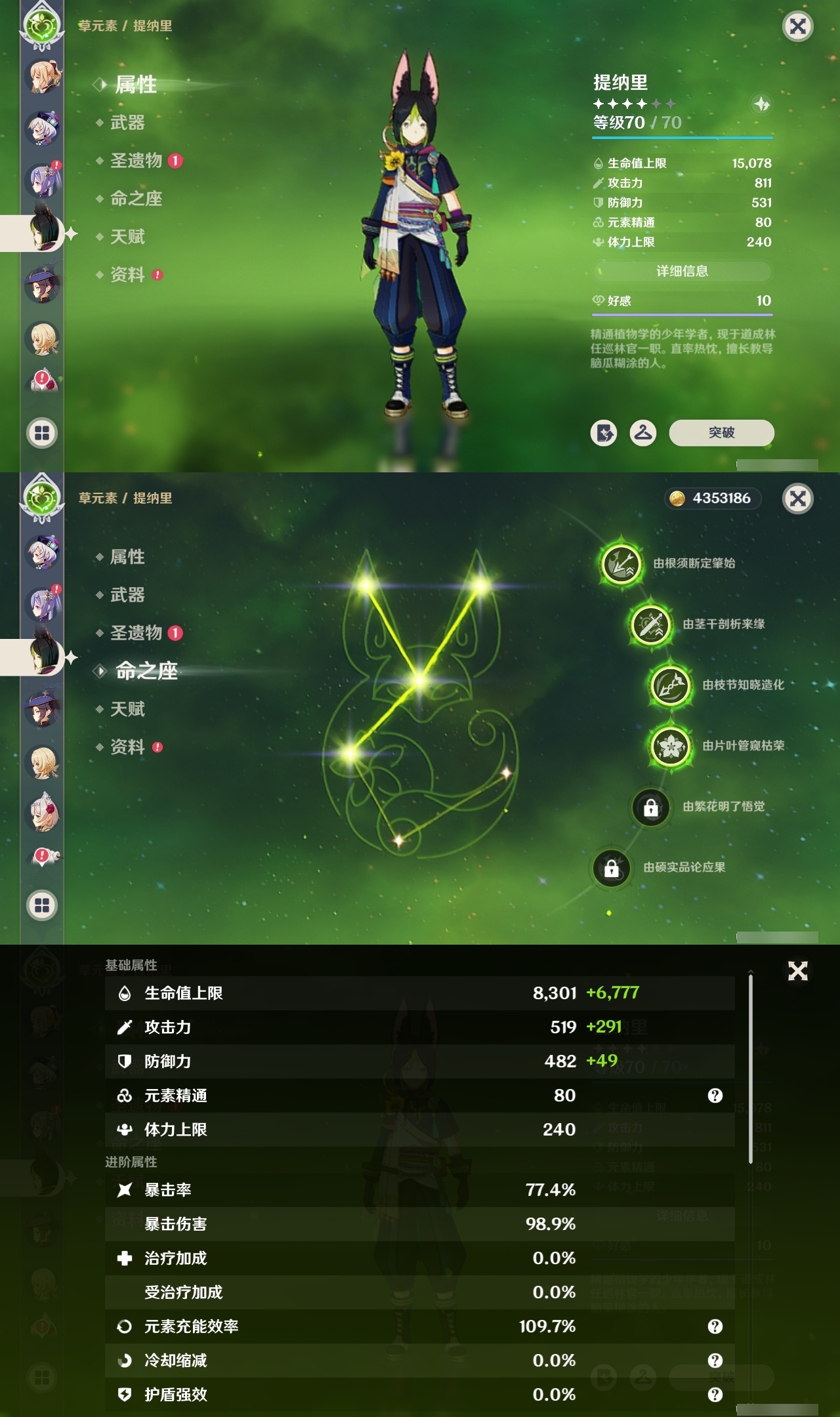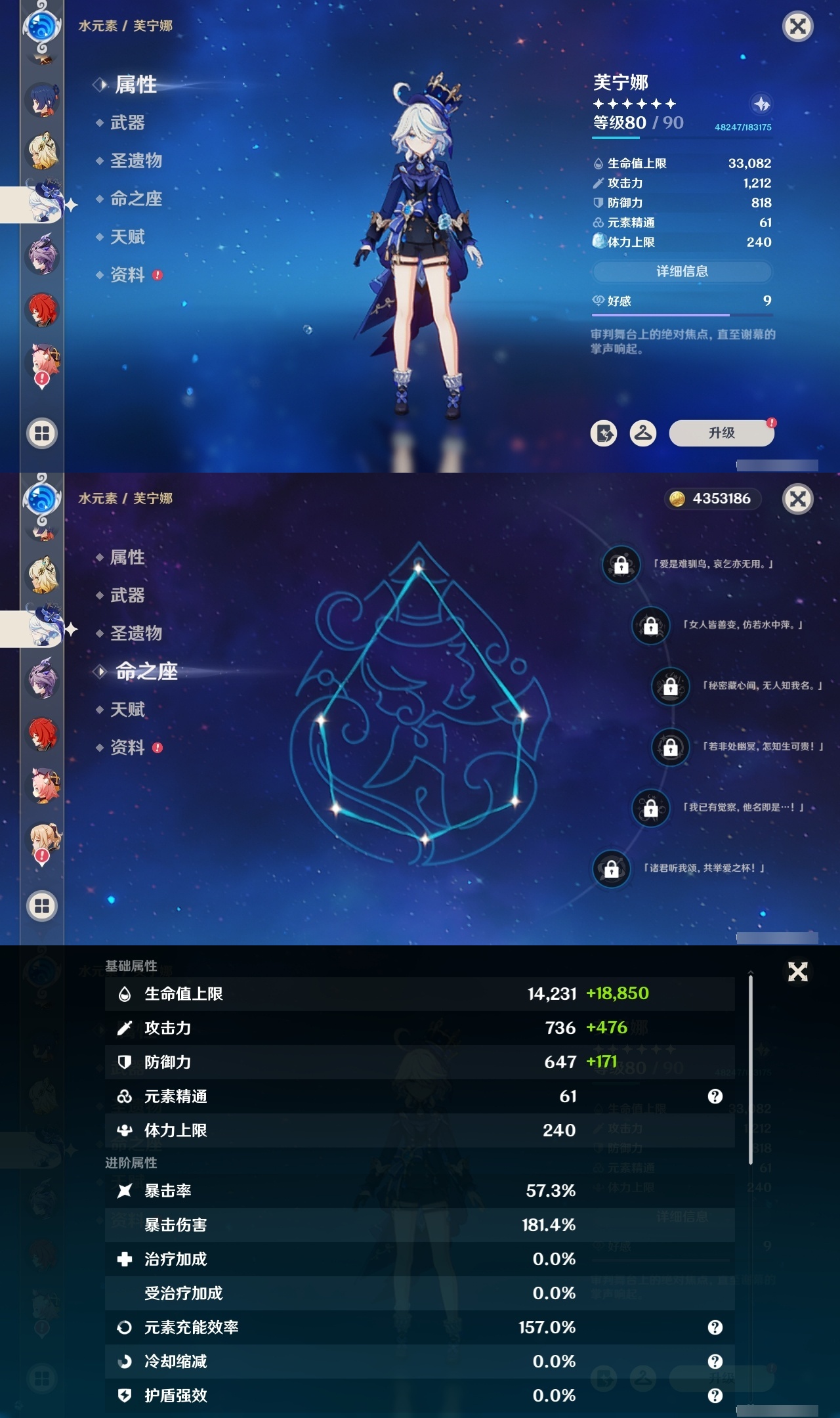 19330 邮箱: 不送邮/死邮 总黄数: 37 冒险等级: 59 4命金色角色: 四命提纳里 3命金色角色: 三命迪卢克 2命金色角色: 二命七七,二命雷电将军 1命金色角色: 一命莫娜,一命胡桃,一命阿蕾奇诺 0命金色角色: 枫原万叶,刻晴,琴,夜兰,纳西妲,芙宁娜,希诺宁,瓦雷莎,杜林 拥有武器: 四风原典,风鹰剑,天空之脊,赤月之形,岩峰巡歌,溢彩心念 2精武器: 风鹰剑 1精武器: 四风