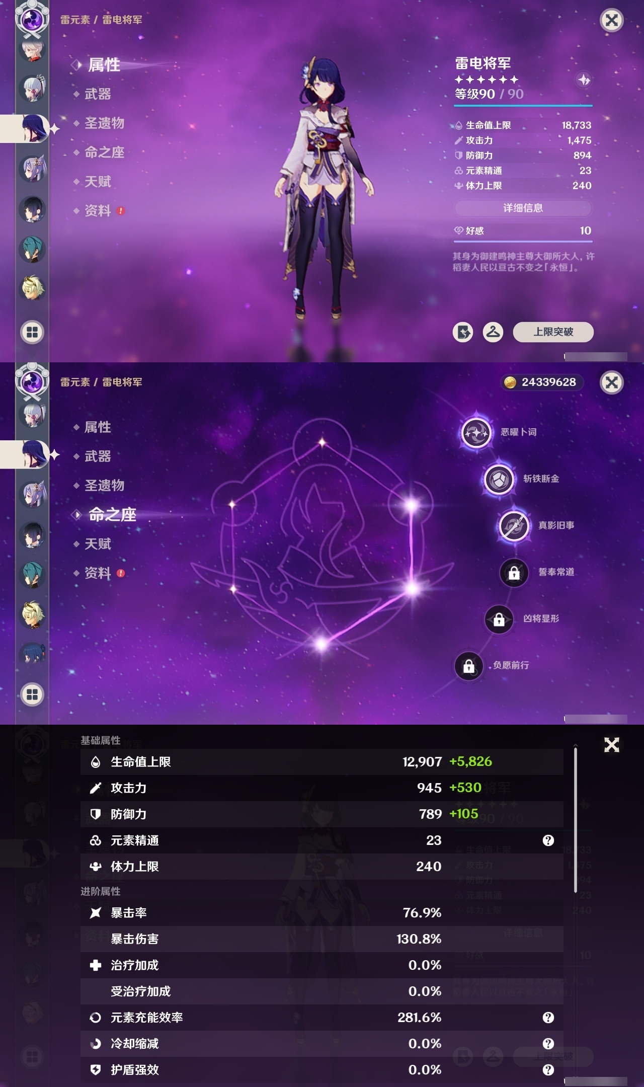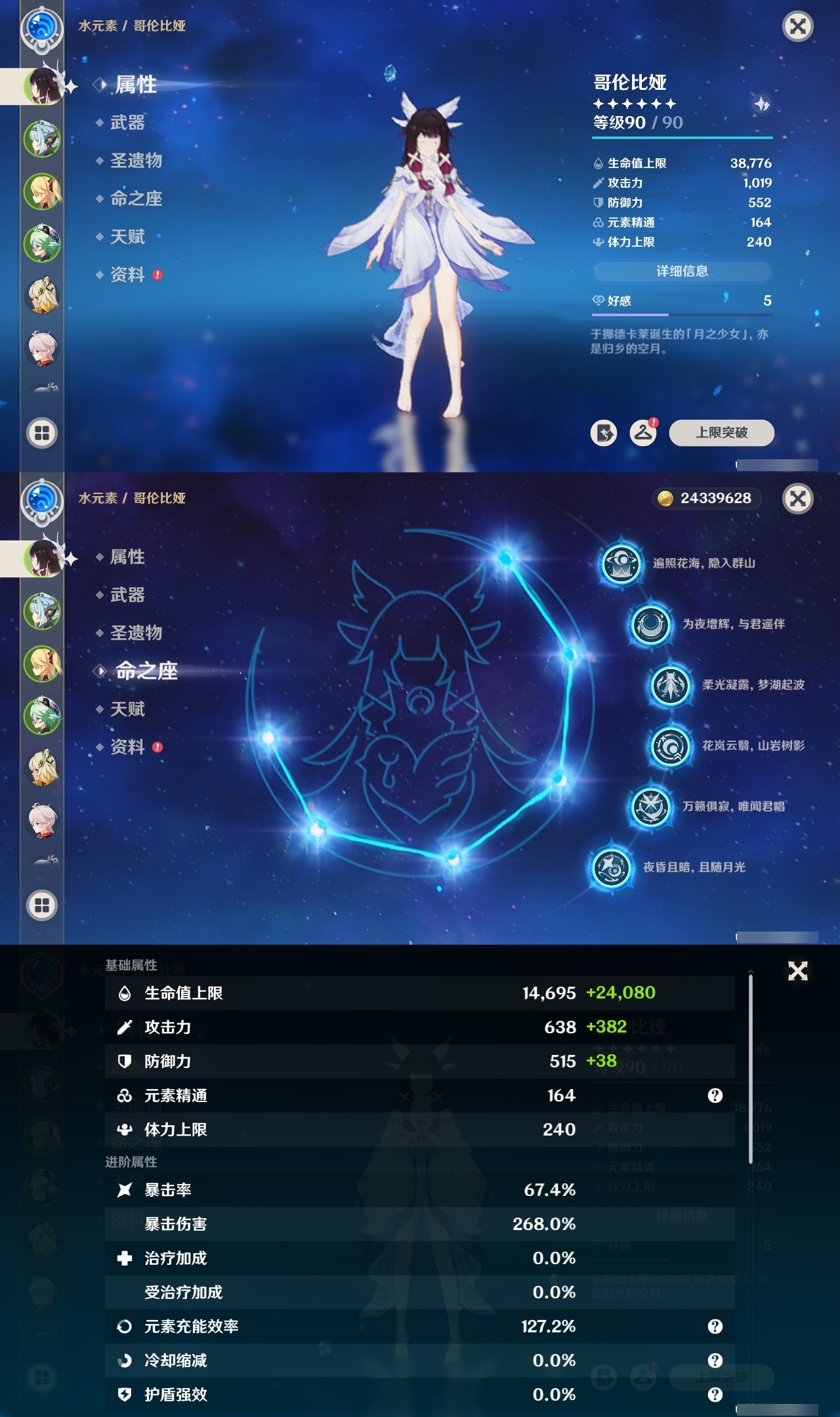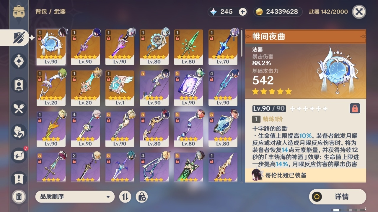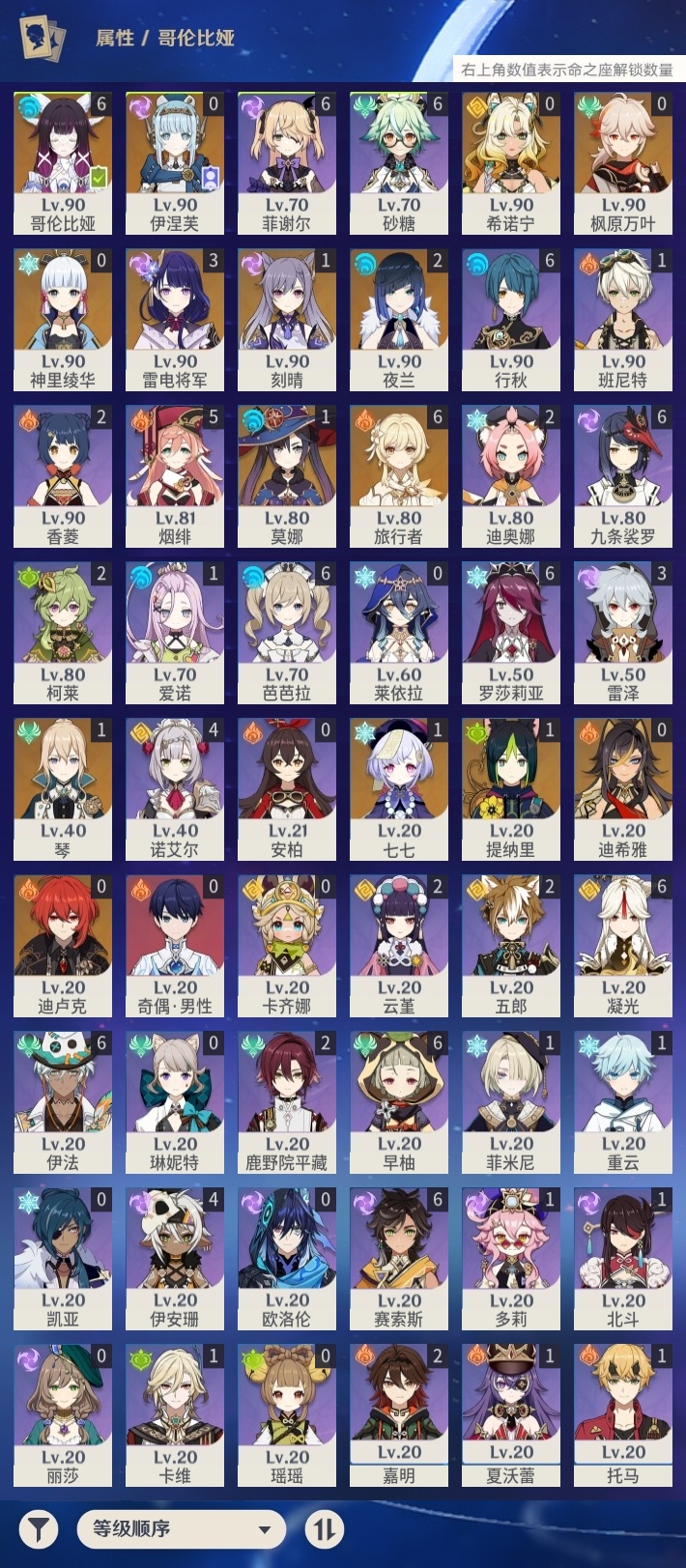 19329 邮箱: 未绑定 总黄数: 39 冒险等级: 59 6命金色角色: 满命哥伦比娅 3命金色角色: 三命雷电将军 2命金色角色: 二命夜兰 1命金色角色: 一命七七,一命刻晴,一命莫娜,一命琴,一命提纳里 0命金色角色: 迪卢克,枫原万叶,神里绫华,迪希雅,希诺宁,伊涅芙 拥有武器: 雾切之回光,天空之卷,和璞鸢,阿莫斯之弓,天空之脊,薙草之稻光,波乱月白经津,支离轮光,帷间夜曲 1精武