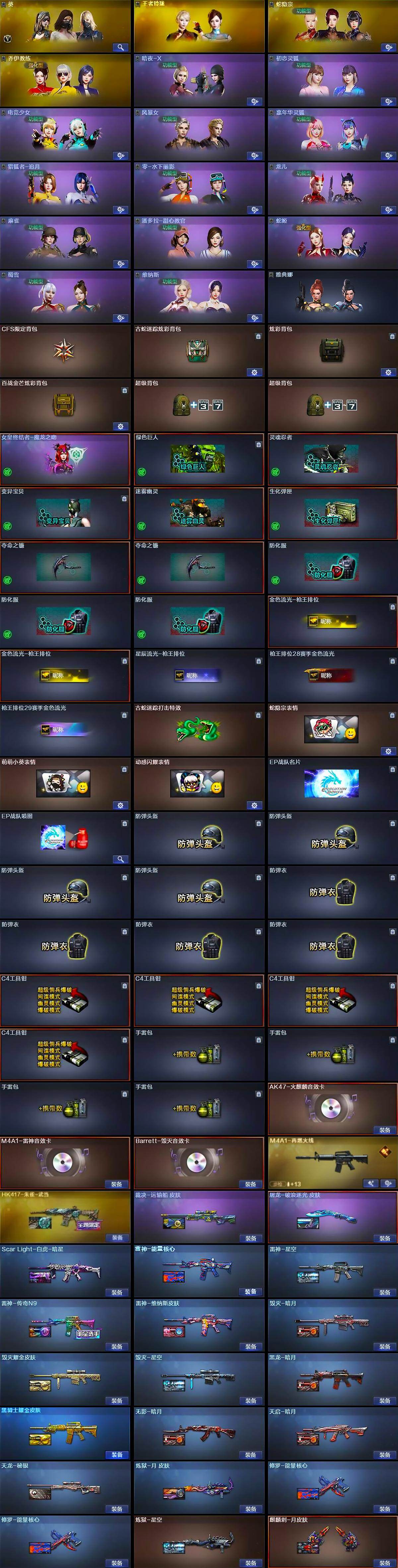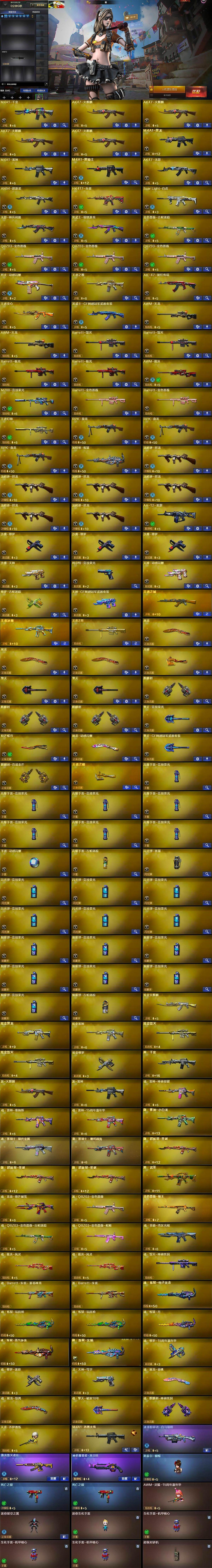 【热门武器】:QBZ03-金色蔷薇*3,Scar Light-白虎,HK417-朱雀,金色蔷薇-古蛇迷踪,修罗-古蛇迷踪,M200-竞技荣光,死亡之眼*2,M4A1-黑骑士,汤姆逊-烈龙*6,RPK-盘龙*3,加特林-炼狱,斯泰尔-蝴蝶,沙鹰-修罗*3,炽芒蝶刃