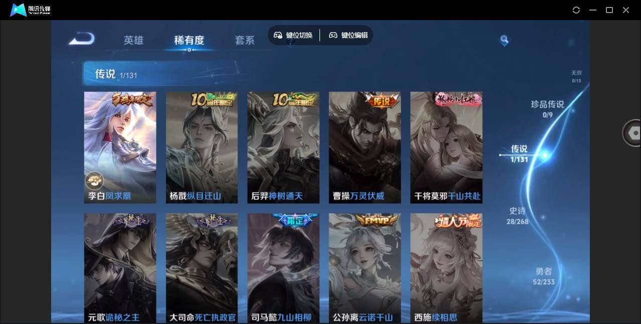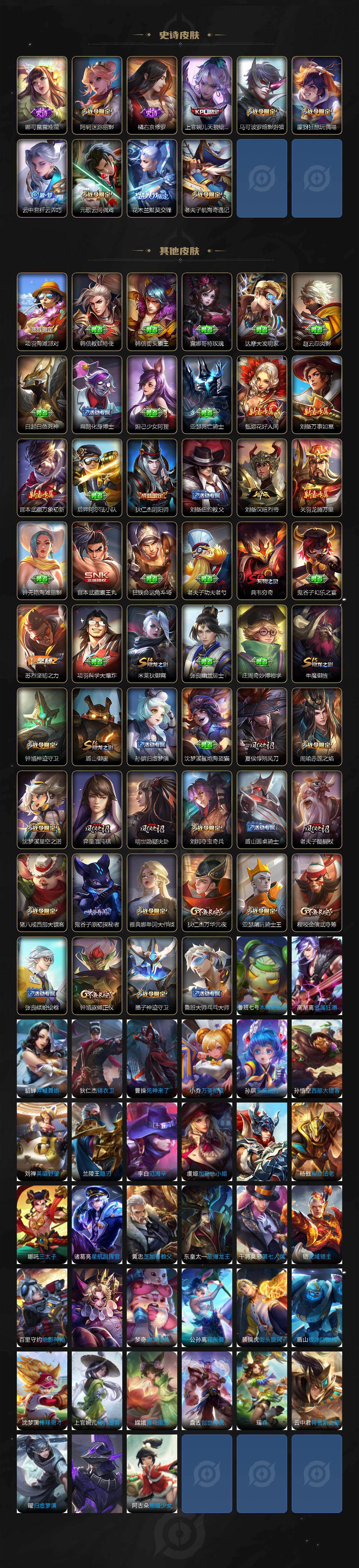 【限定皮肤】:狄仁杰阴阳师,赵云皇家上将,墨子神迹守卫,鲁班七号狮舞东方,阿轲迷踪丽影,周瑜赤莲之焰,元歌云间偶戏,夏侯惇朔风刀,典韦穷奇,马可波罗暗影游猎,狄仁杰魔术师,狄仁杰万华元夜,项羽海滩派对,老夫子醍醐杖,老夫子航海奇遇记,
