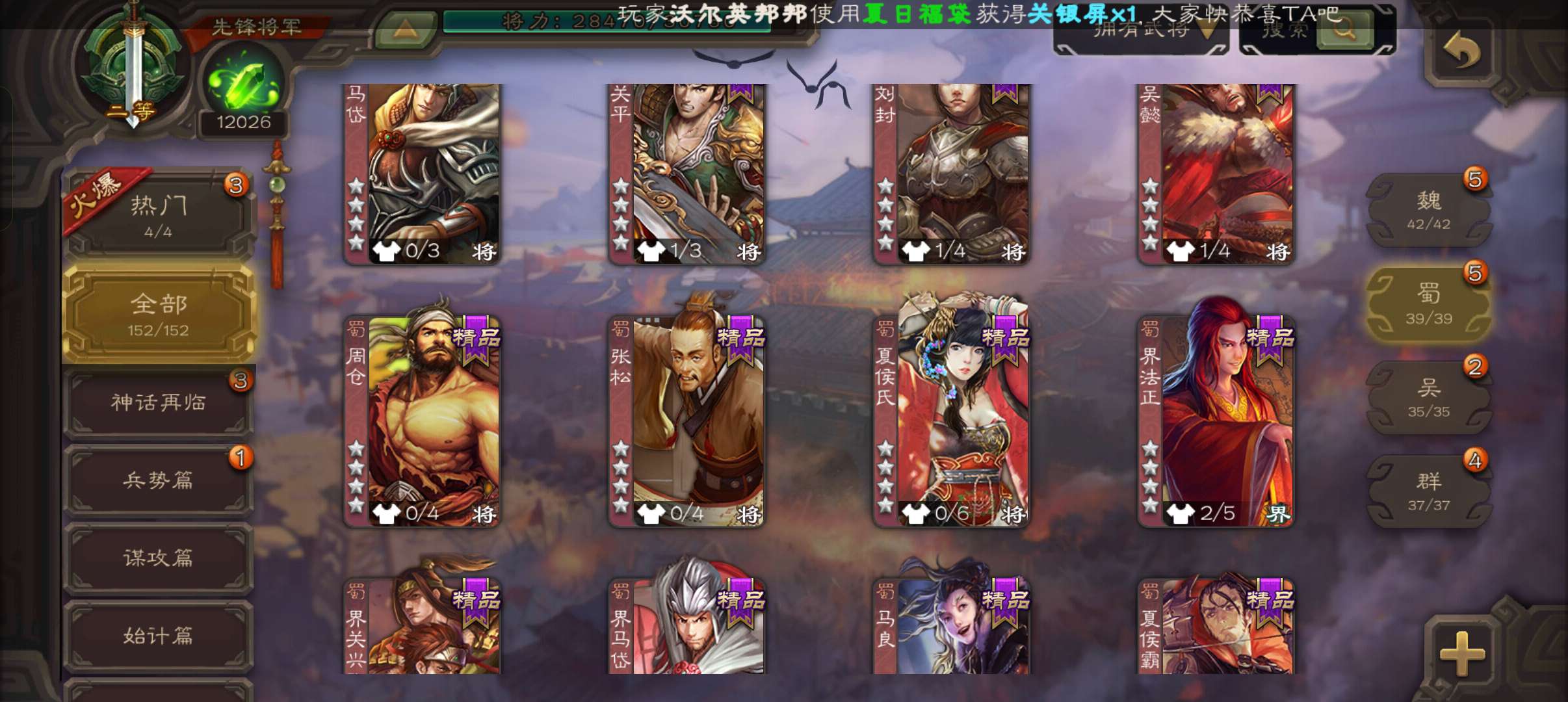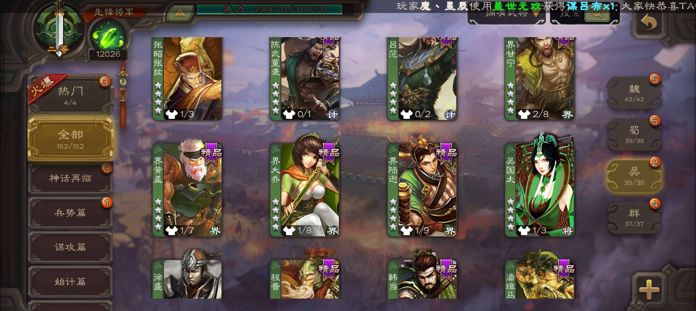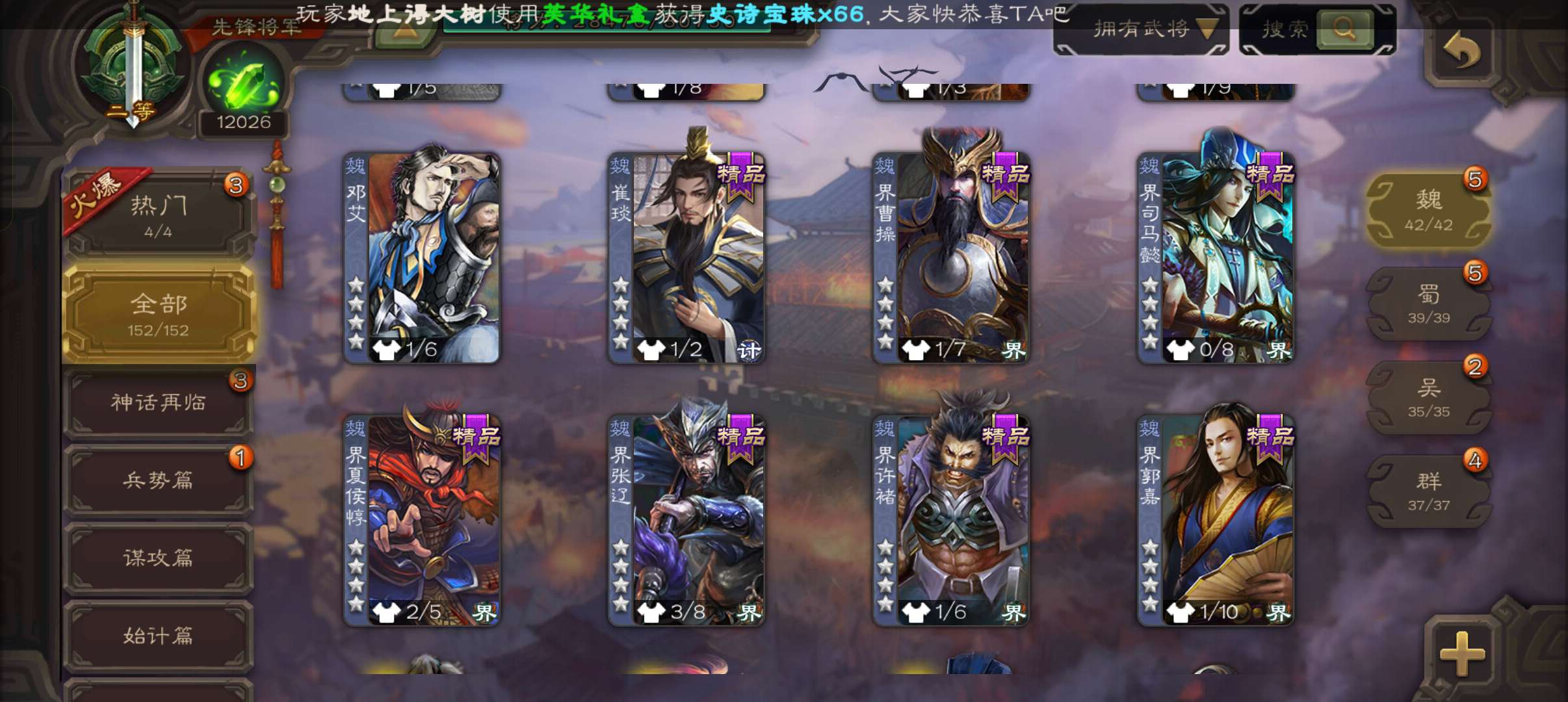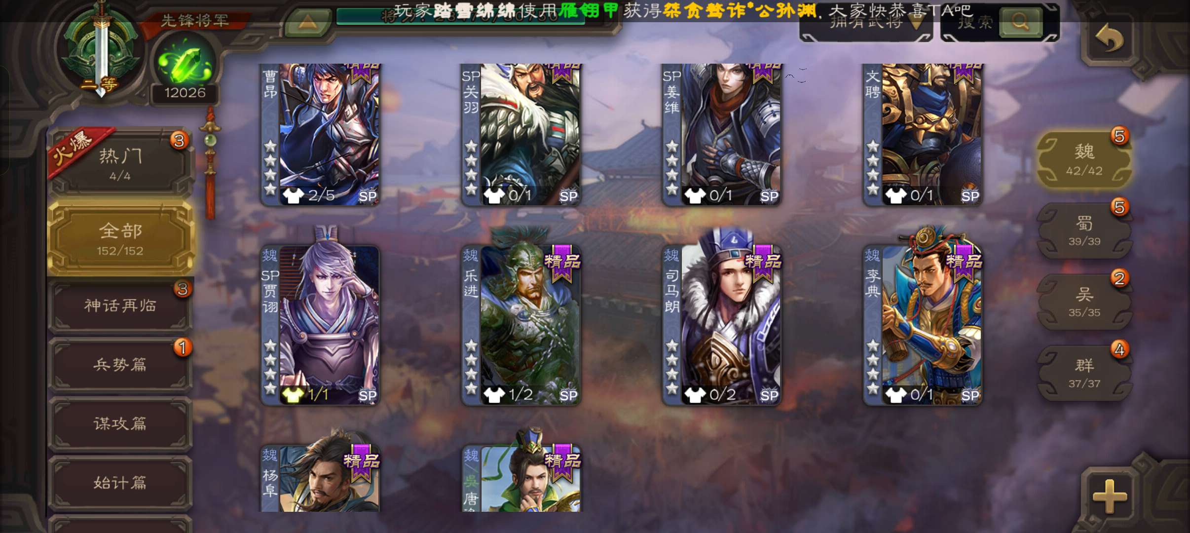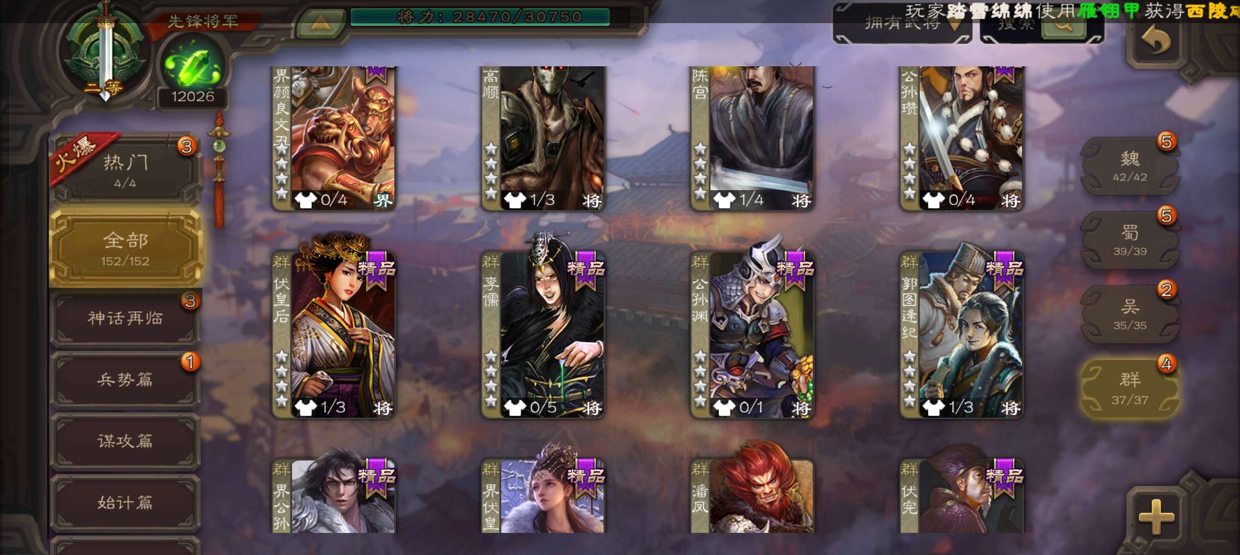 43宝珠9.4万羽毛1.2万将魂7.7万豆,公孙康,甘夫人崔琰谋高顺势陈到孙茹152将