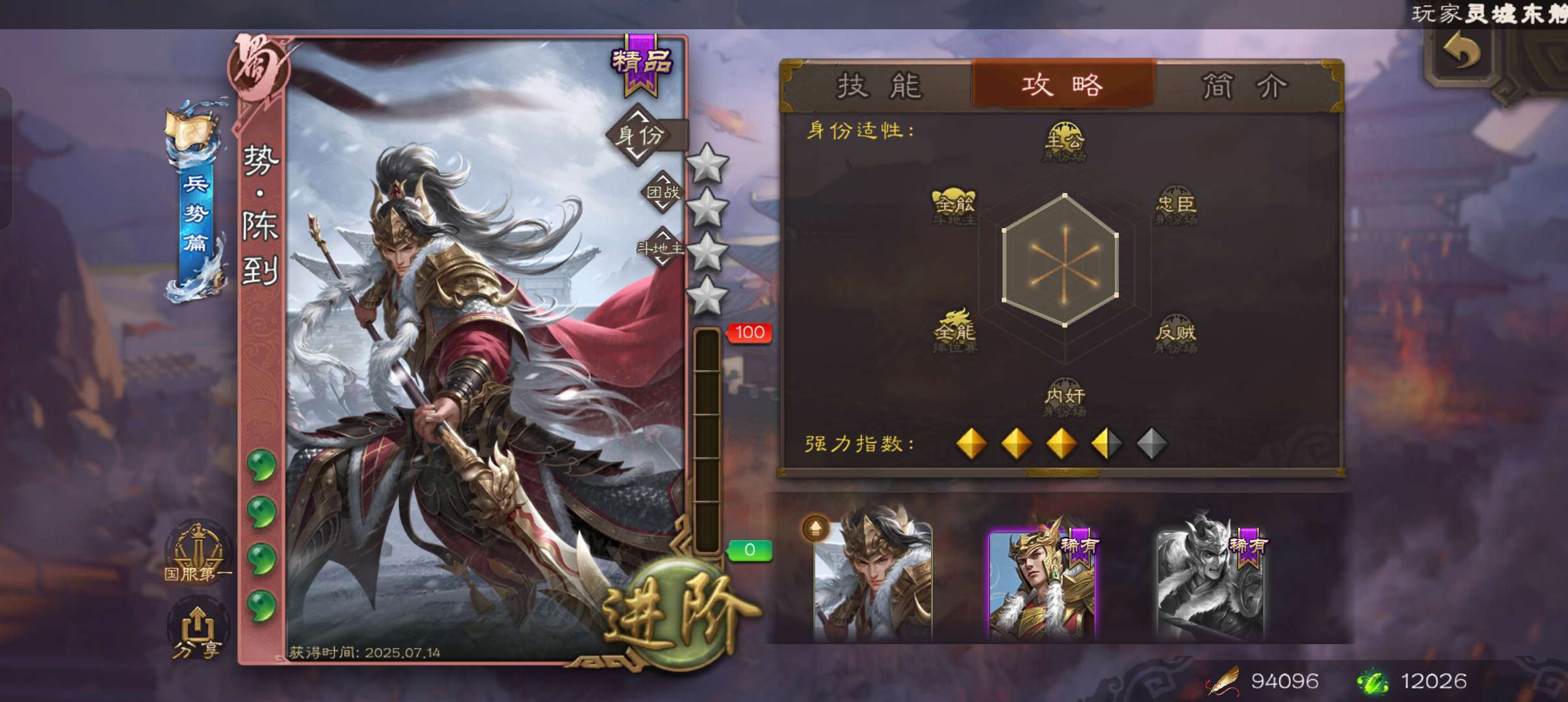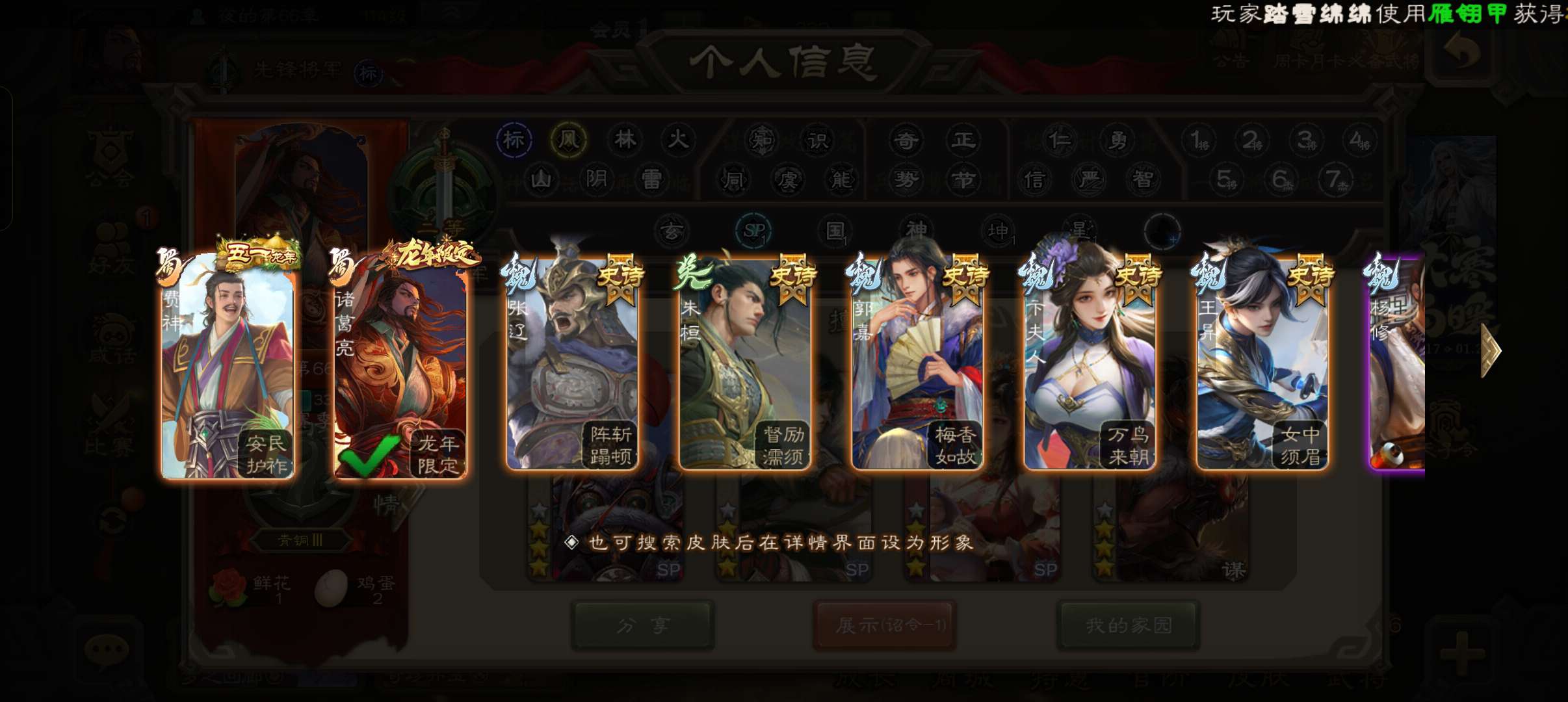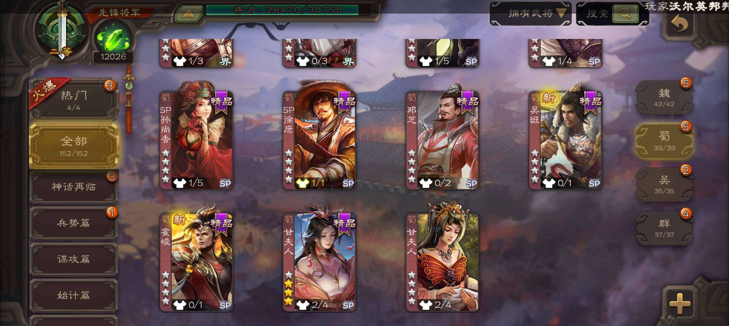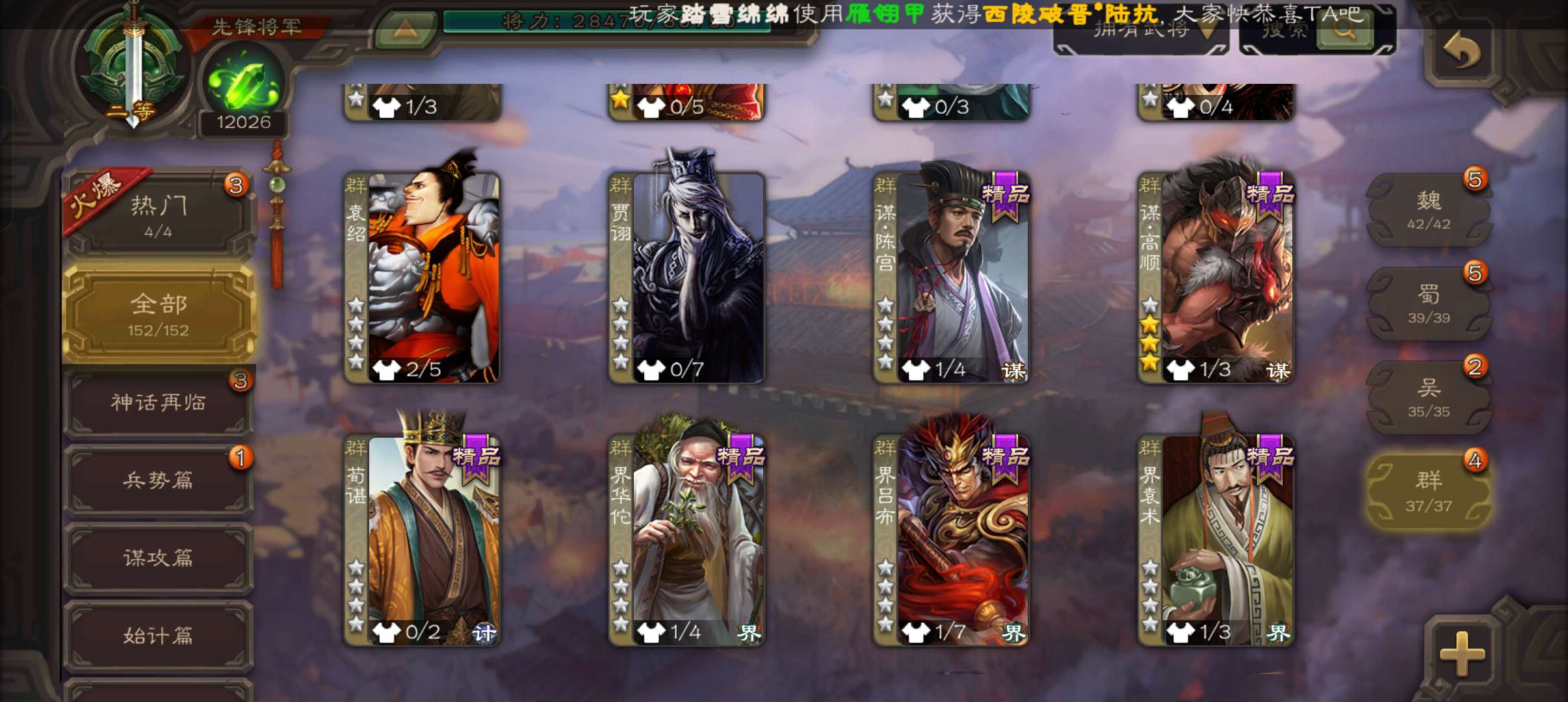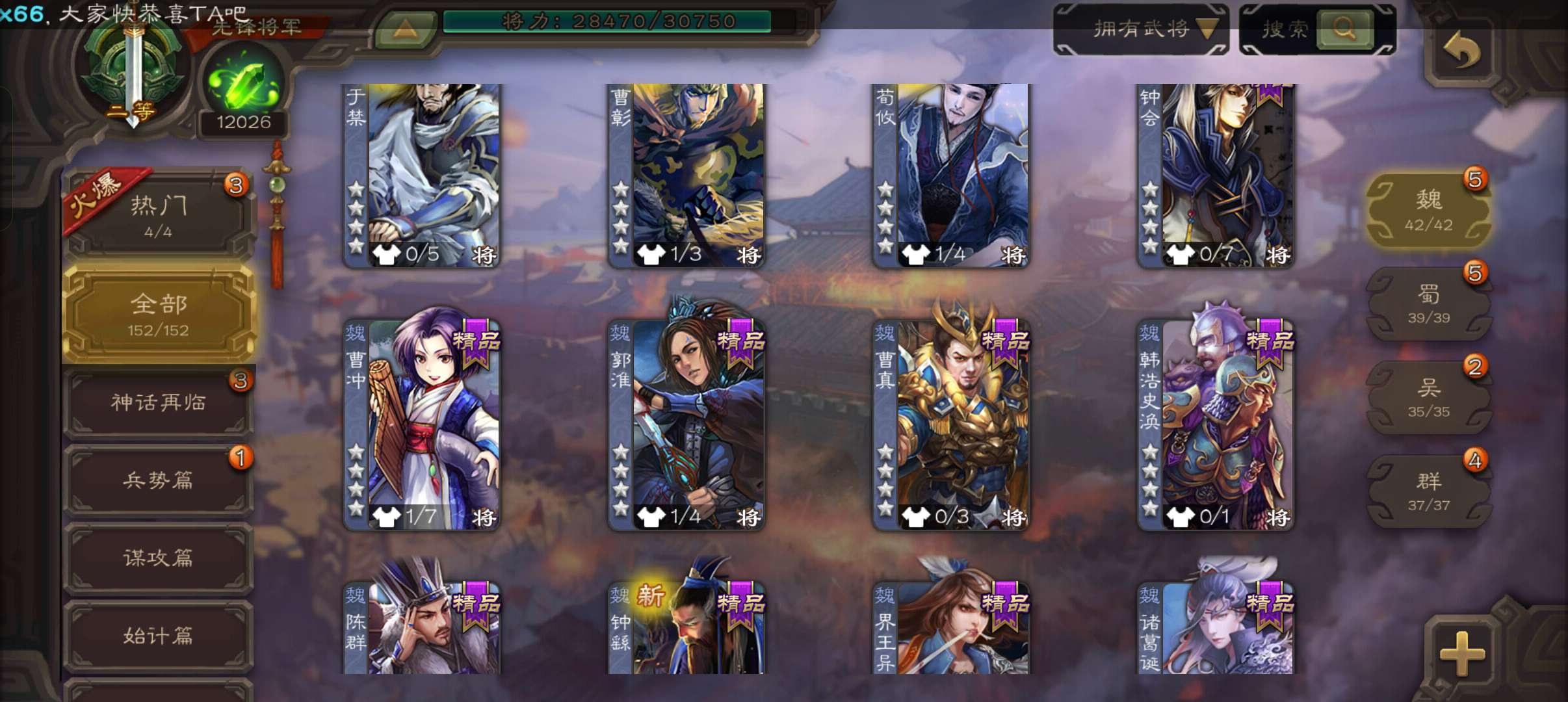 43宝珠9.4万羽毛1.2万将魂7.7万豆,公孙康,甘夫人崔琰谋高顺势陈到孙茹152将