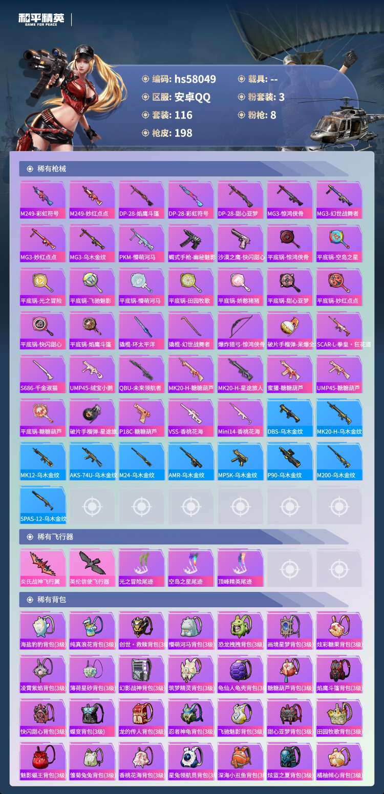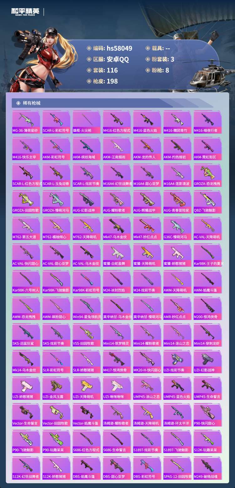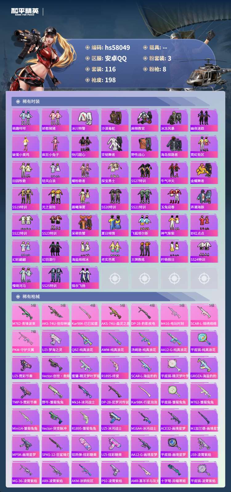 hs58049 安卓手Q-5王牌印记-3粉装-8特效枪-58208热力值-116套装-198枪皮-1