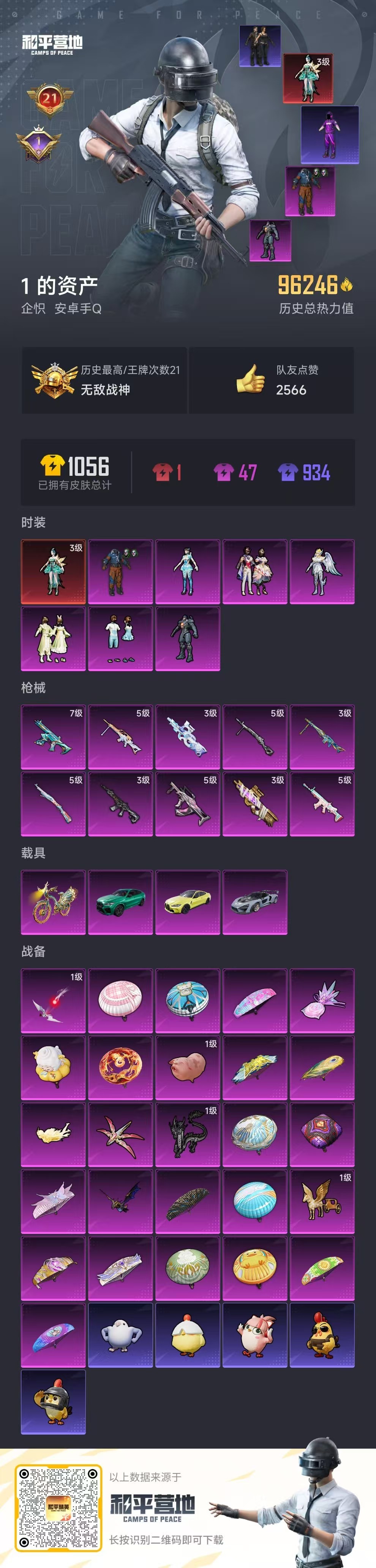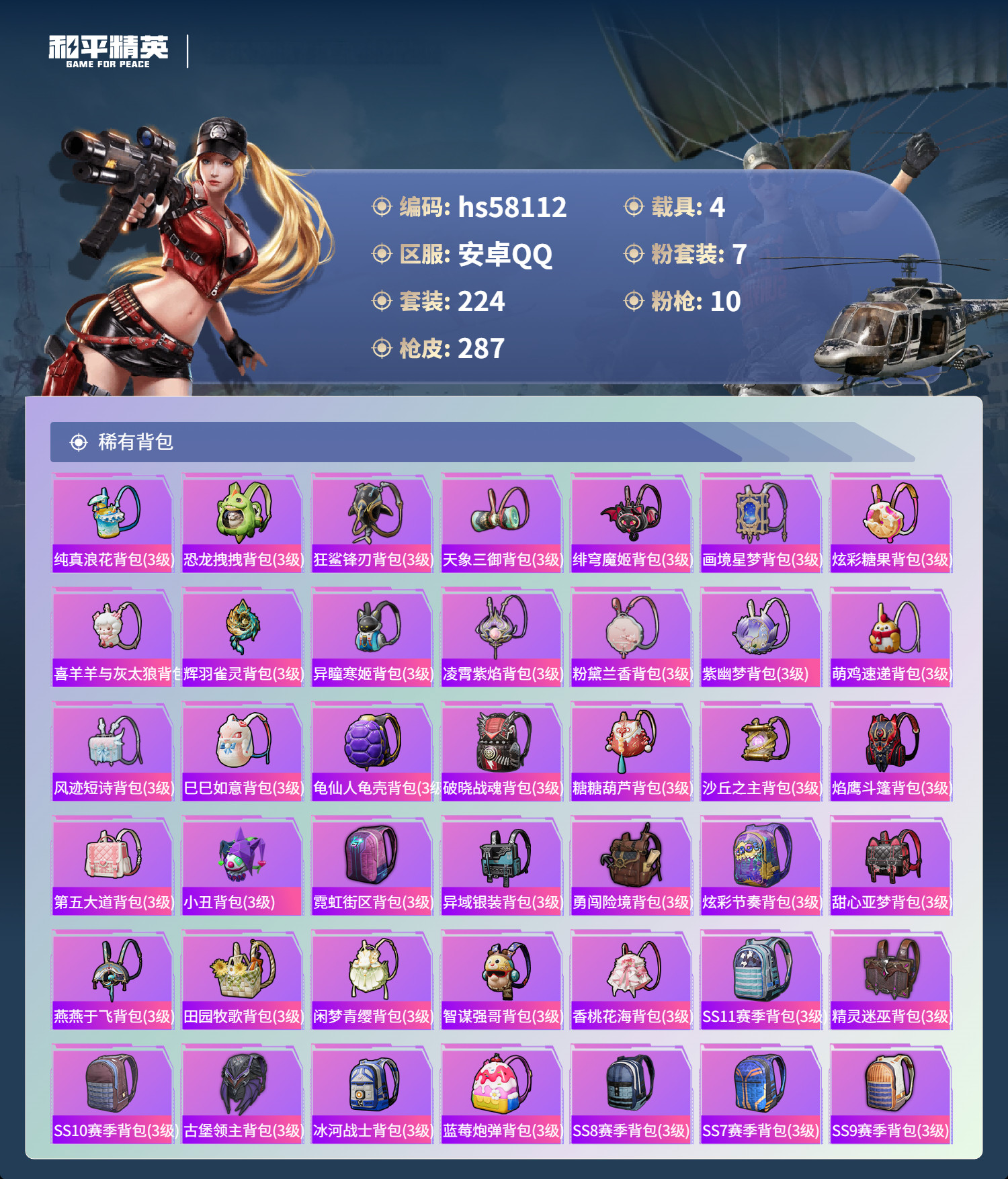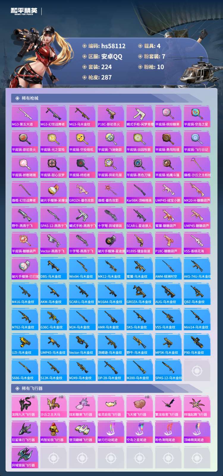 hs58112 安卓手Q-21王牌印记-有战神框-1红装-7粉装-10特效枪-4载具-96246热力