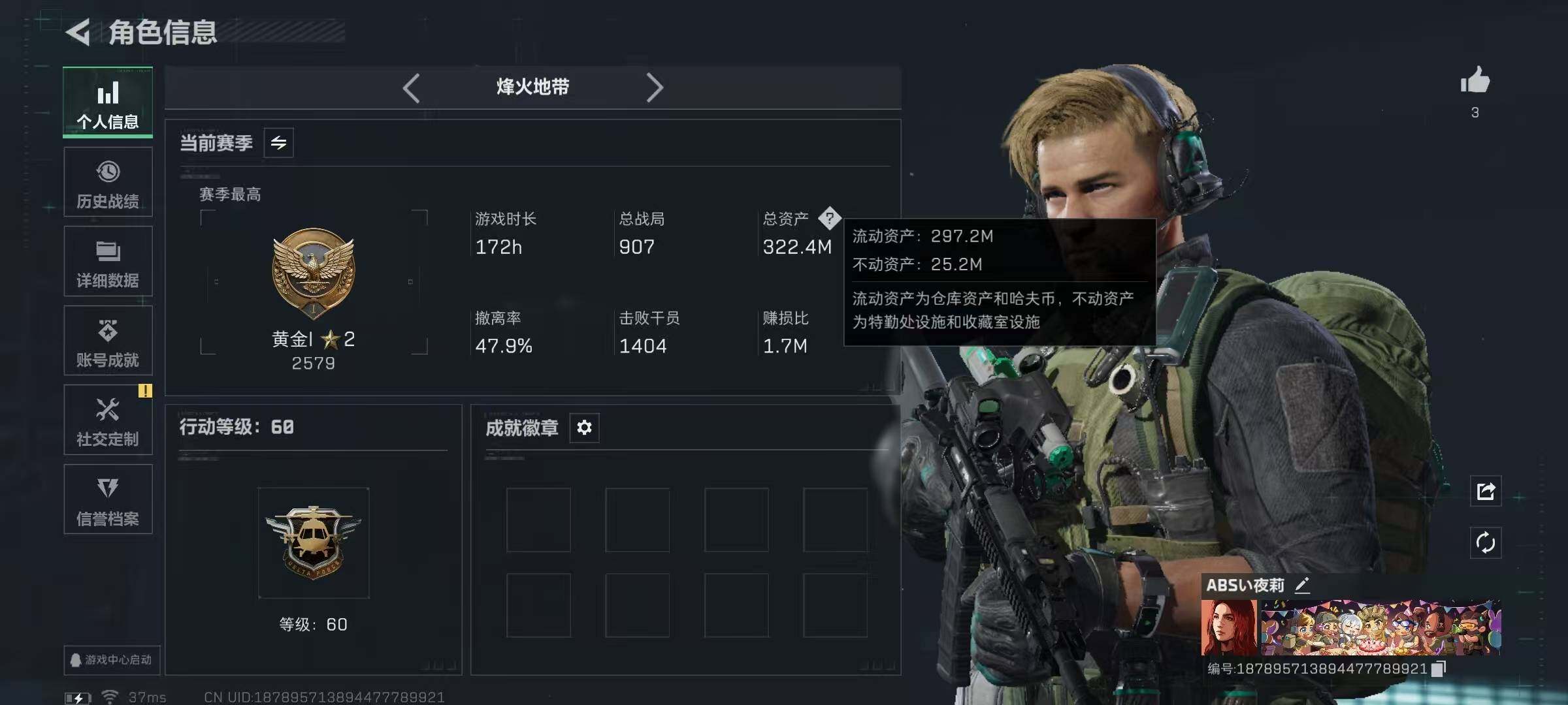 322m总资产-145412k哈伏币-60烽火等级-黄金-1战场等级-无军衔