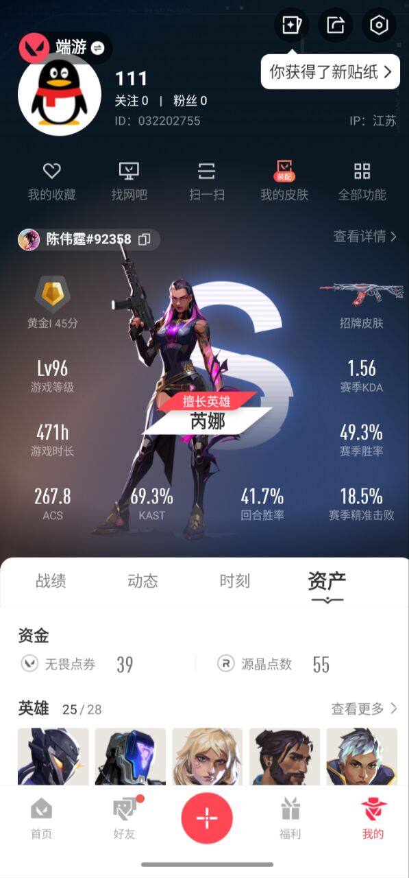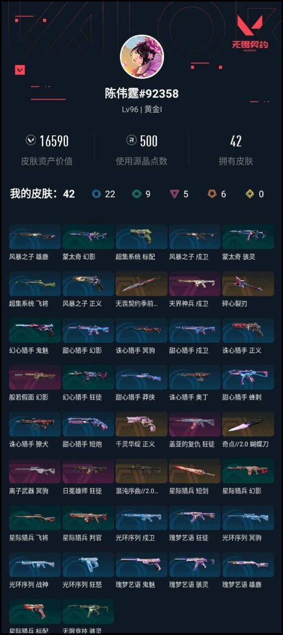 终极*6/卓越*5/皮肤*42/等级*96/段位:黄金/无畏契约季前邀请赛套装