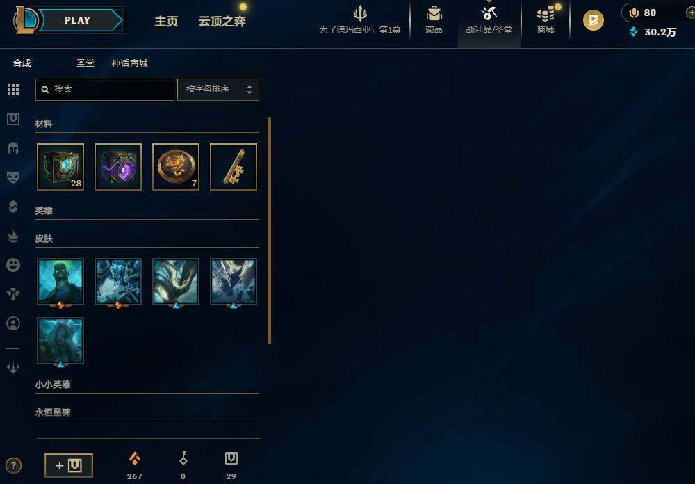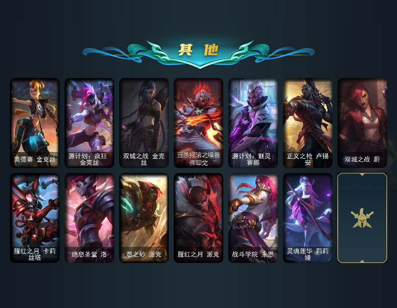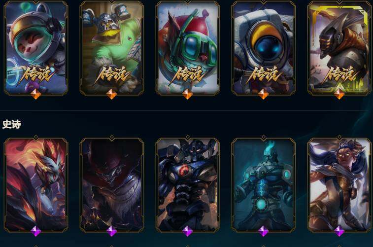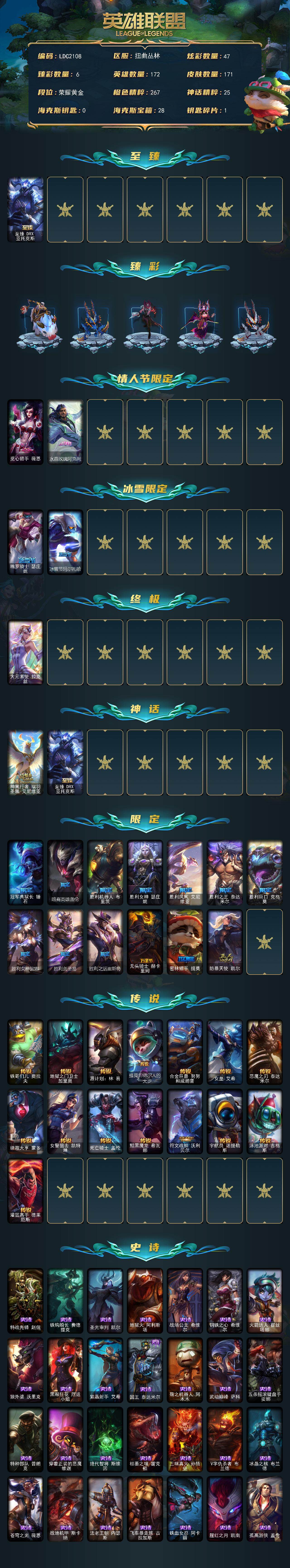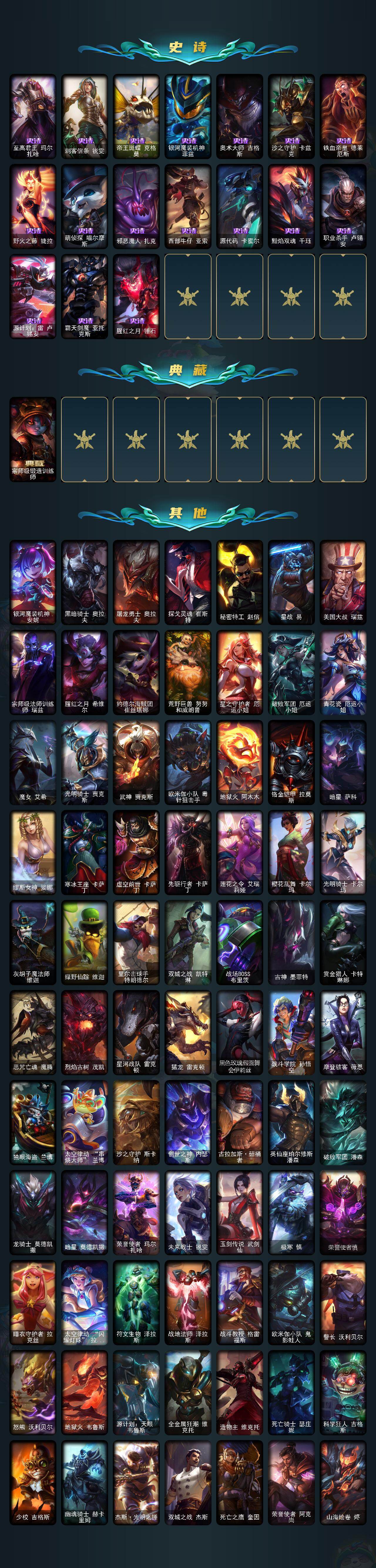 172英雄/171皮肤/1终极/2神话/17限定/6臻彩/47炫彩/15传说/45史诗