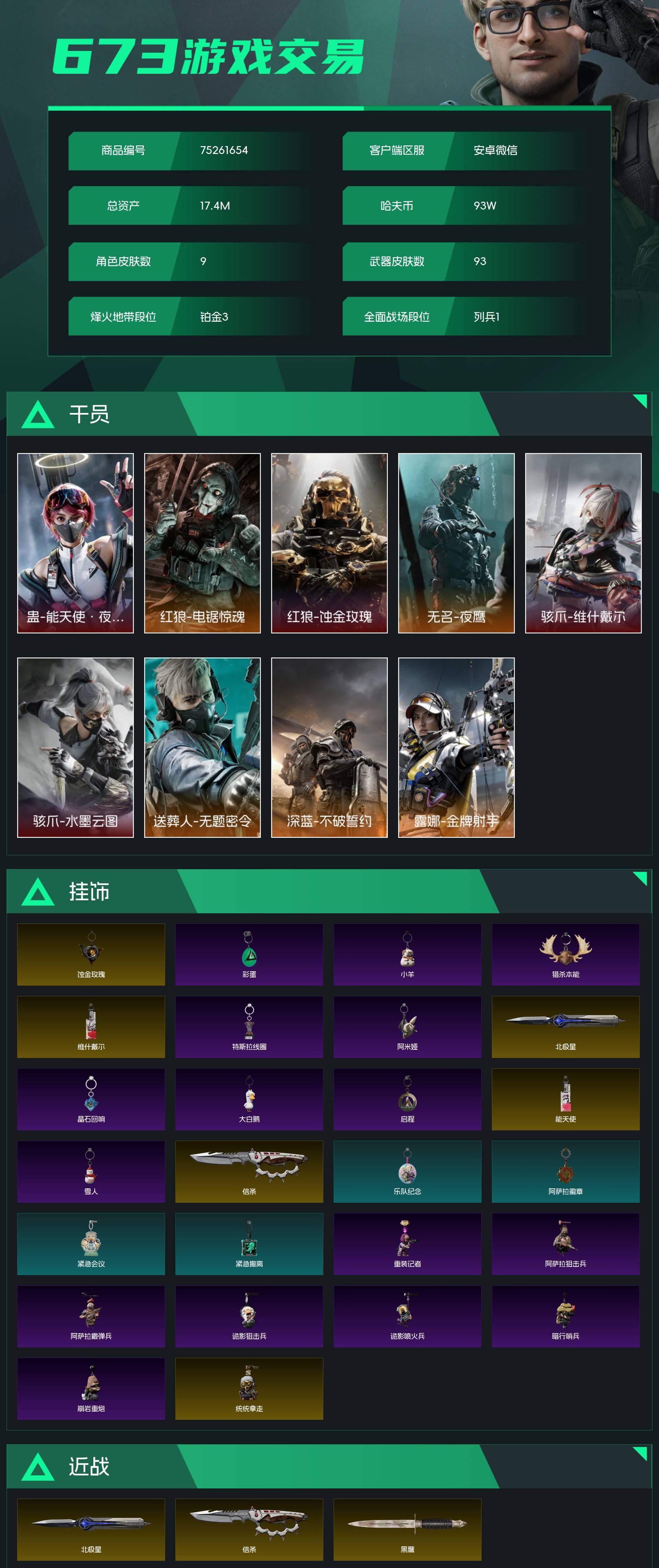 烽火段位铂金3 战场段位列兵1 总资产17.4M 哈夫币93W 干员9 挂饰26 近战3 枪械93 载具54