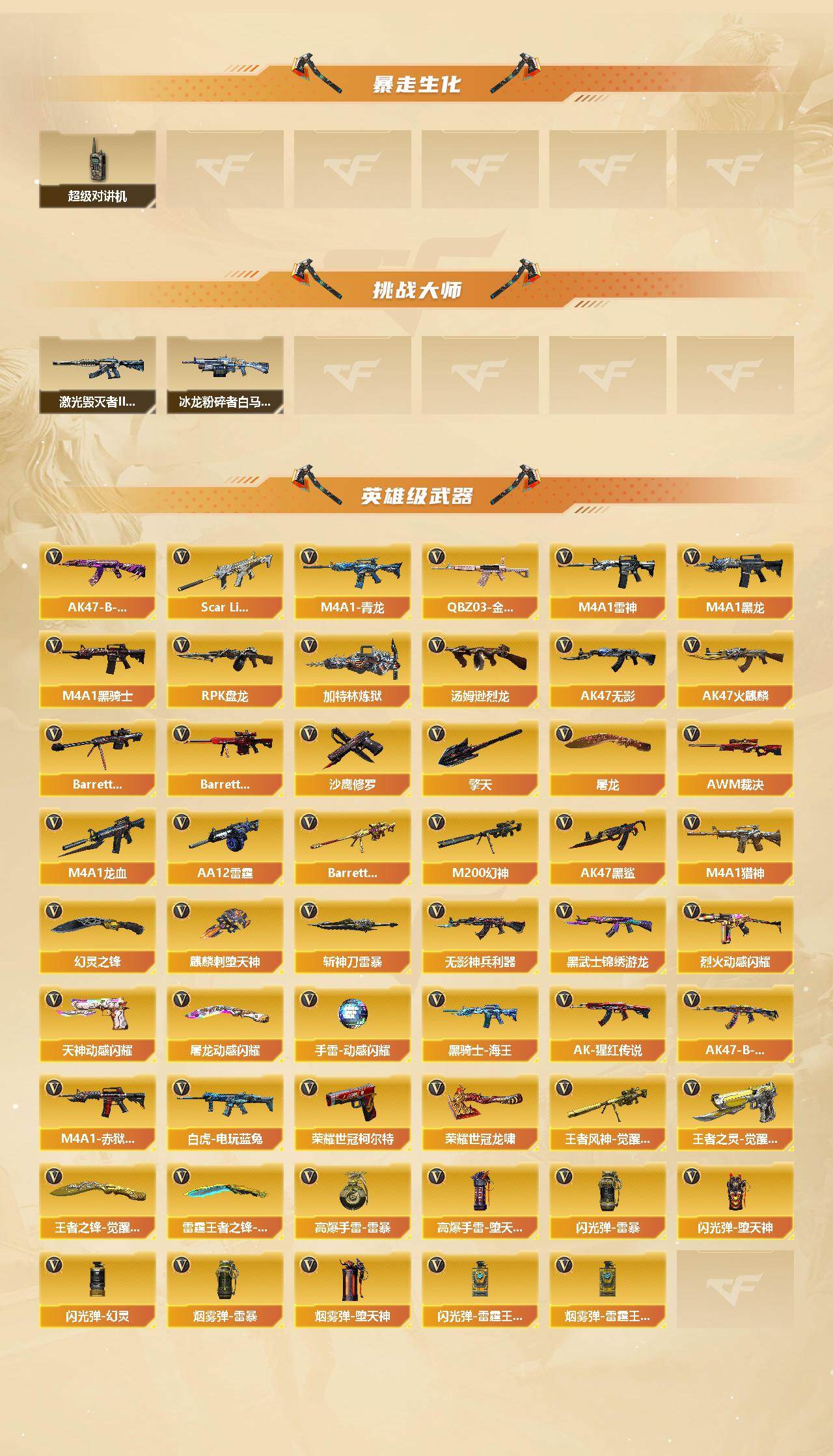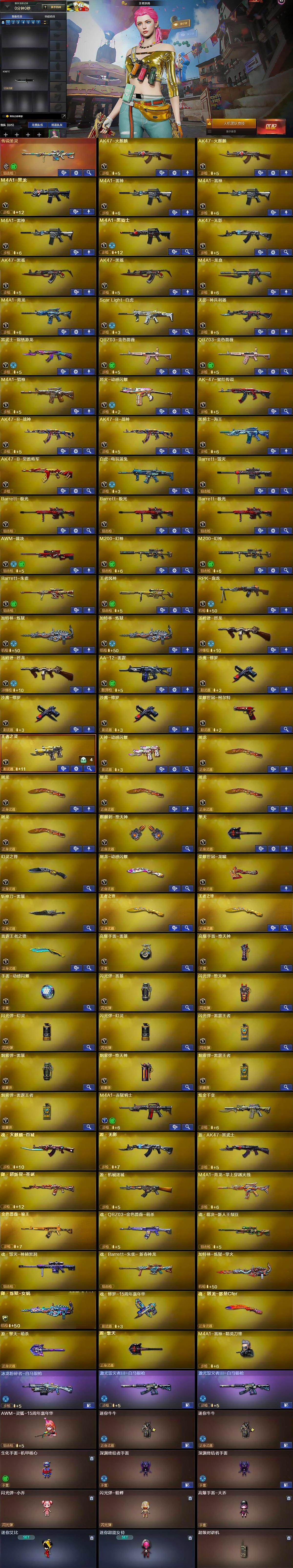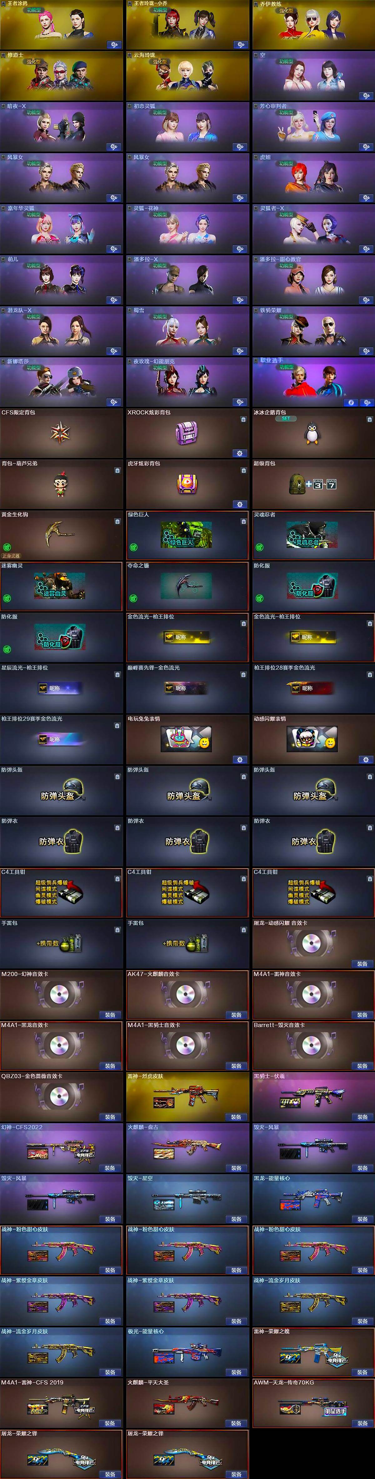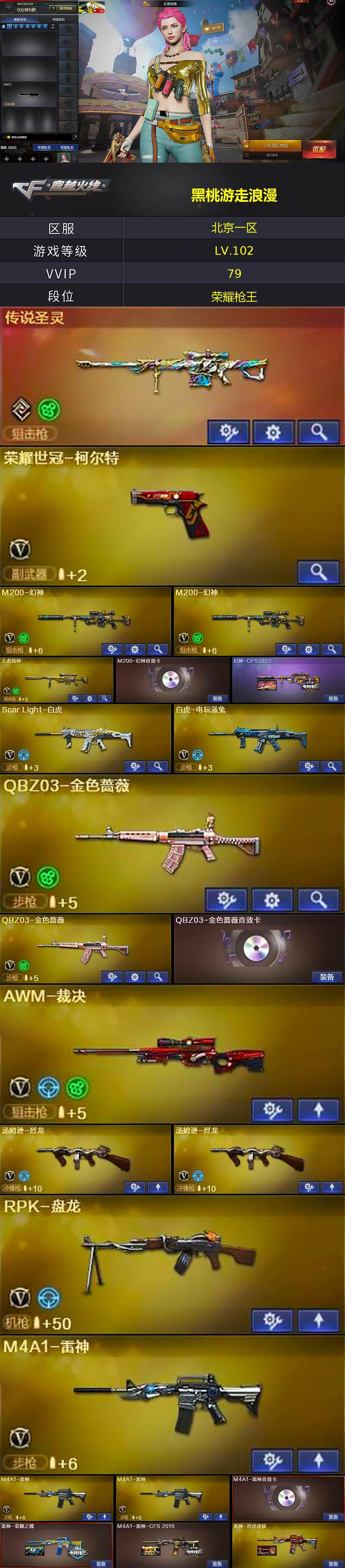 【CFX930】74V/102级/荣耀元首/1传说/14王者/1炫金/1英雄/幻神三件套/传说圣灵/QBZ03-金色蔷薇/scar_白虎/M4A1_青龙/M200_幻神/白虎-电玩蓝兔/荣耀世冠-柯尔特/M4A1_黑骑士/汤姆逊烈龙/RPK_盘龙/加特林_炼狱/沙鹰_修罗/荣耀世冠-龙啸/金刚伞/炫金千变/屠龙-动感闪耀 音效卡/M200-幻神音效卡/AK47-火麒麟音效卡/M4A1-雷神音效卡/M4A1-黑龙音效卡/M4A1-黑骑士音效卡/Barrett-毁灭音效卡/幻神-CFS2022/雷神