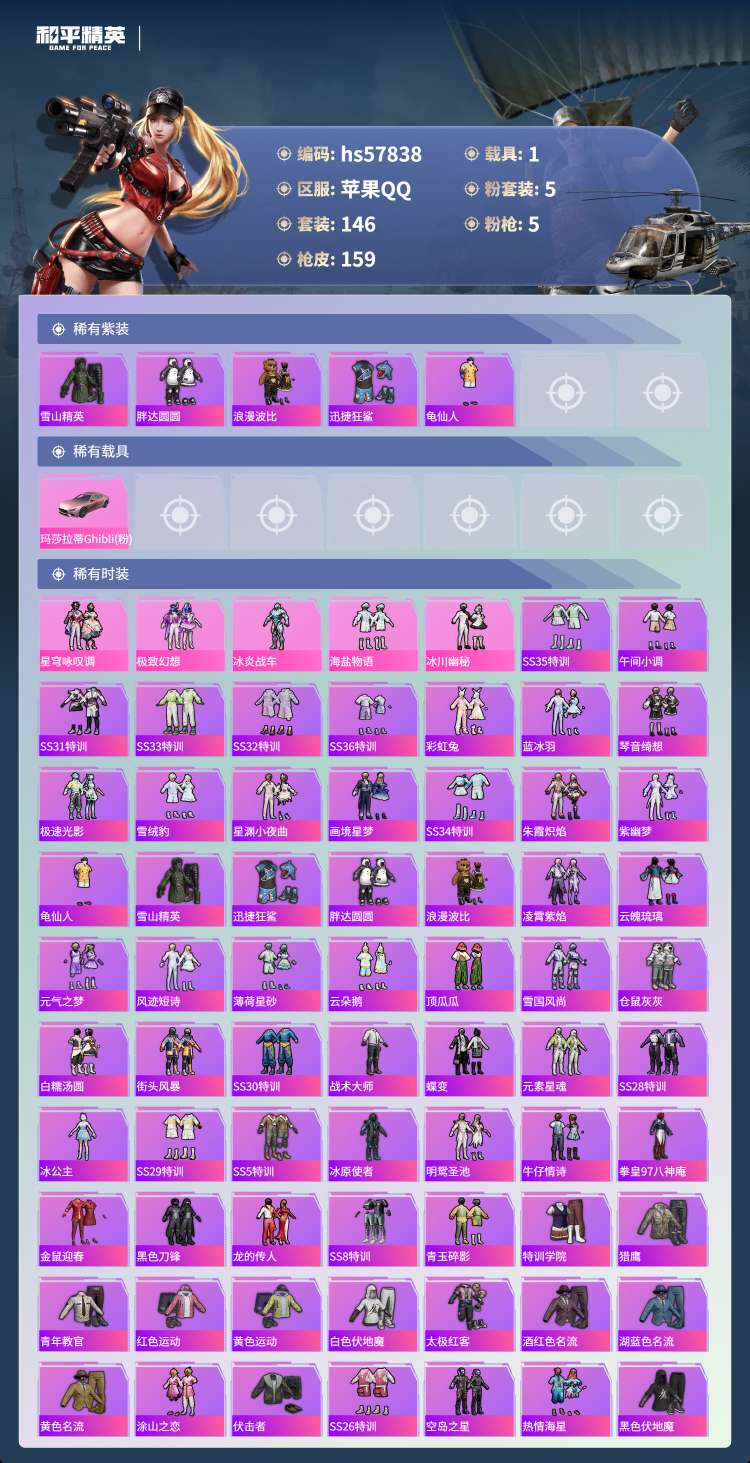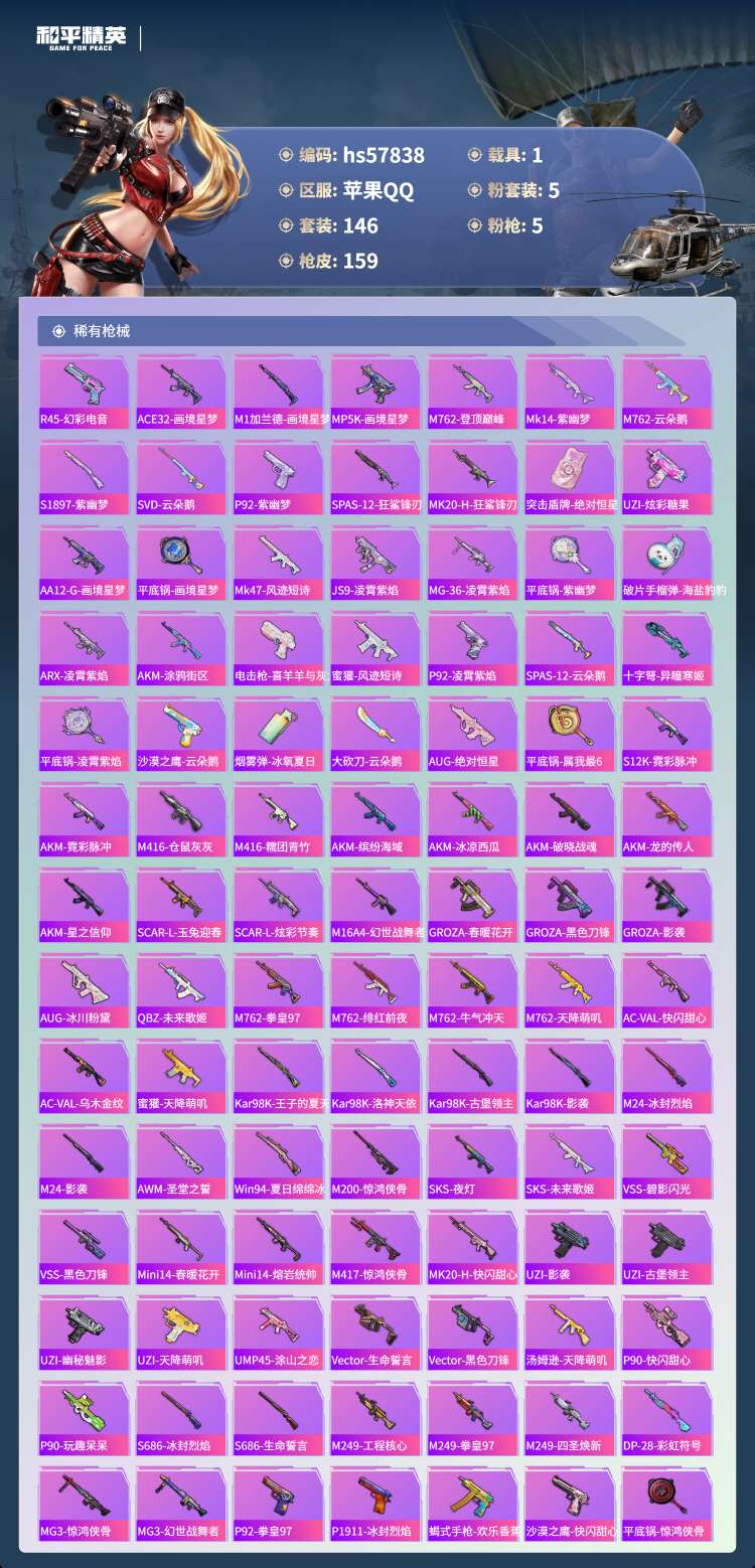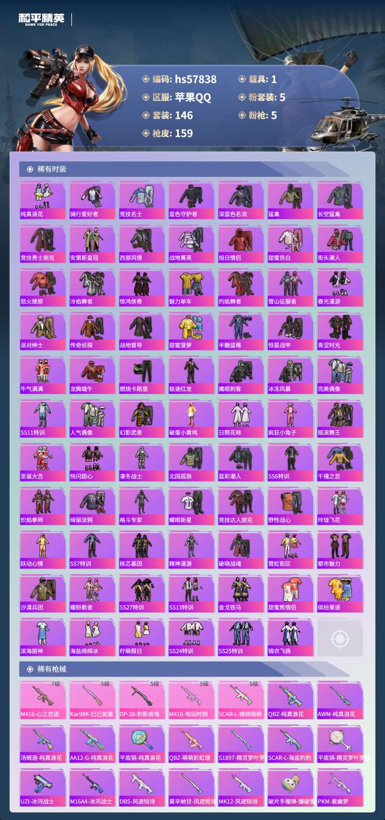 hs57838 苹果手Q-9王牌印记-5粉装-5特效枪-1载具-52815热力值-146套装-159