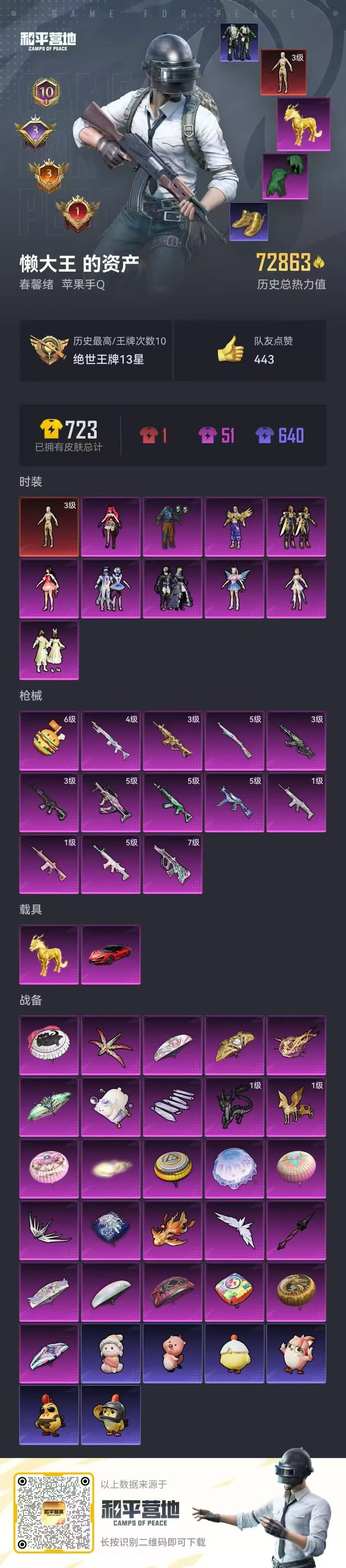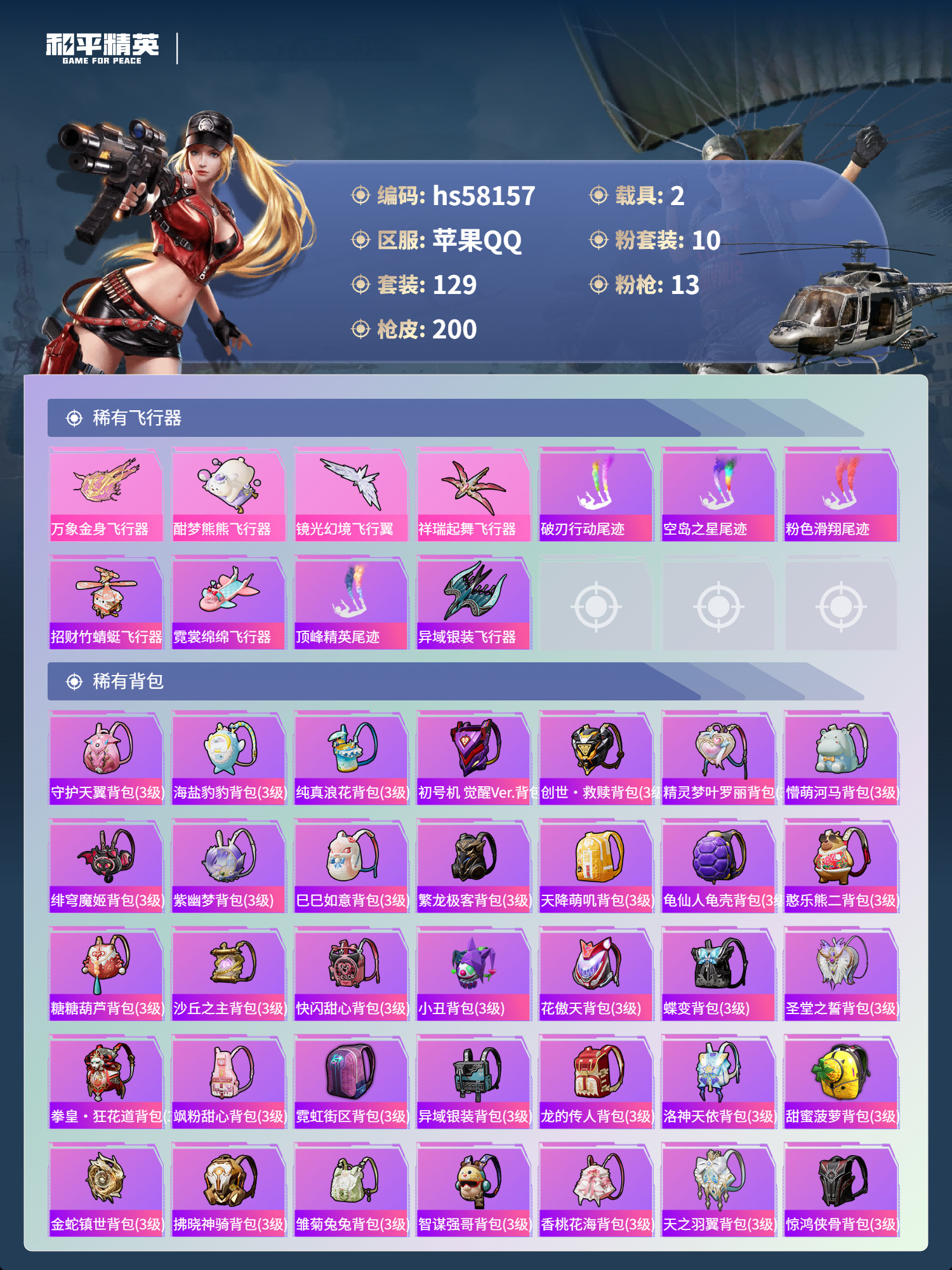 hs58157 苹果手Q-10王牌印记-1红装-10粉装-13特效枪-2载具-73283热力值-12