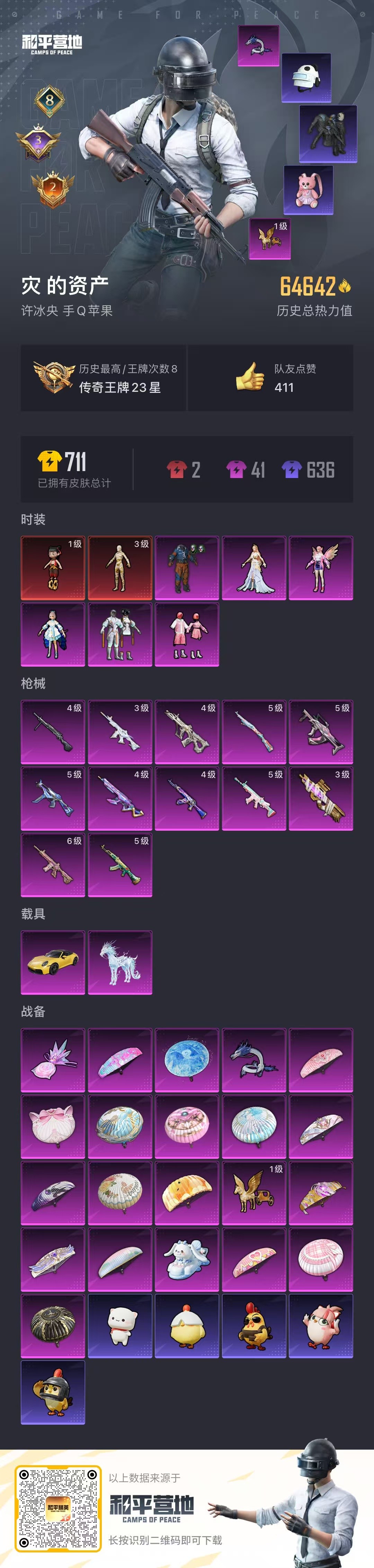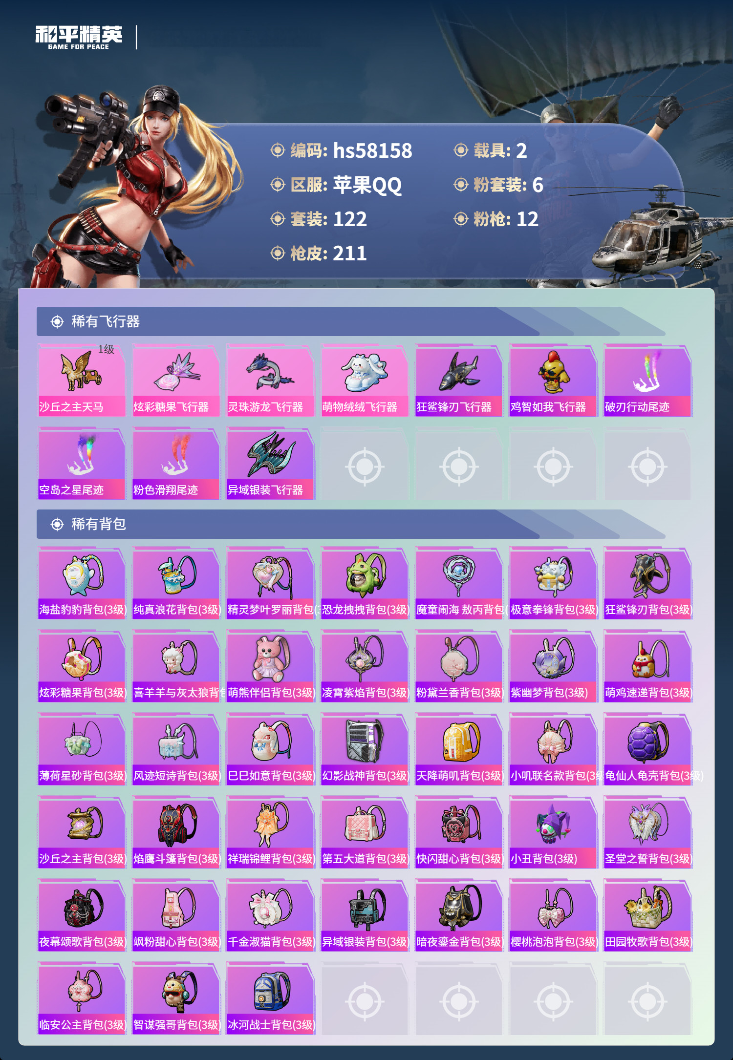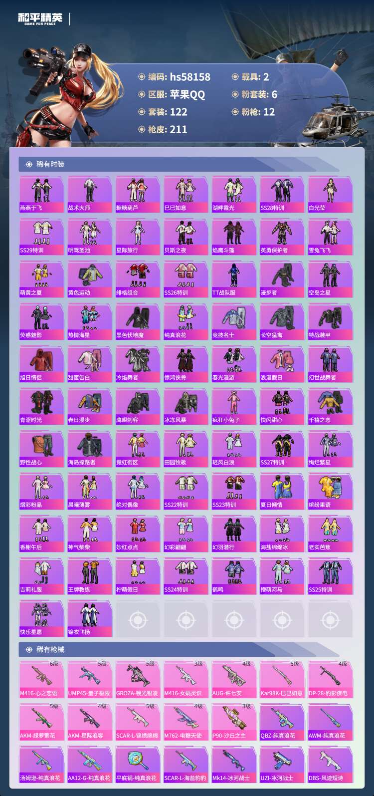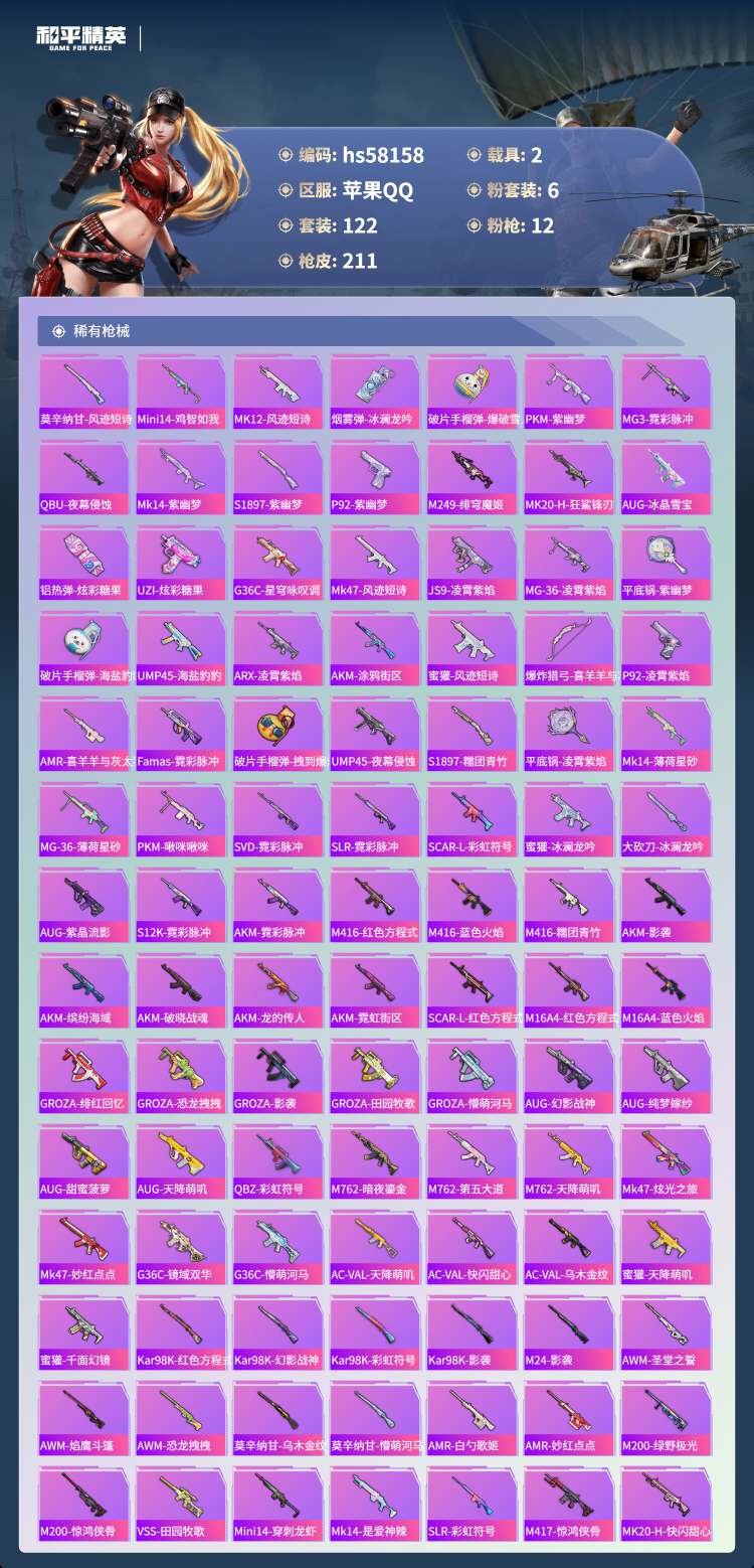 hs58158 苹果手Q-8王牌印记-2红装-6粉装-12特效枪-2载具-64690热力值-122套