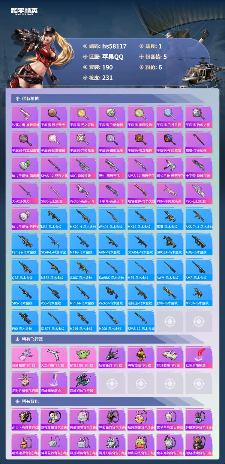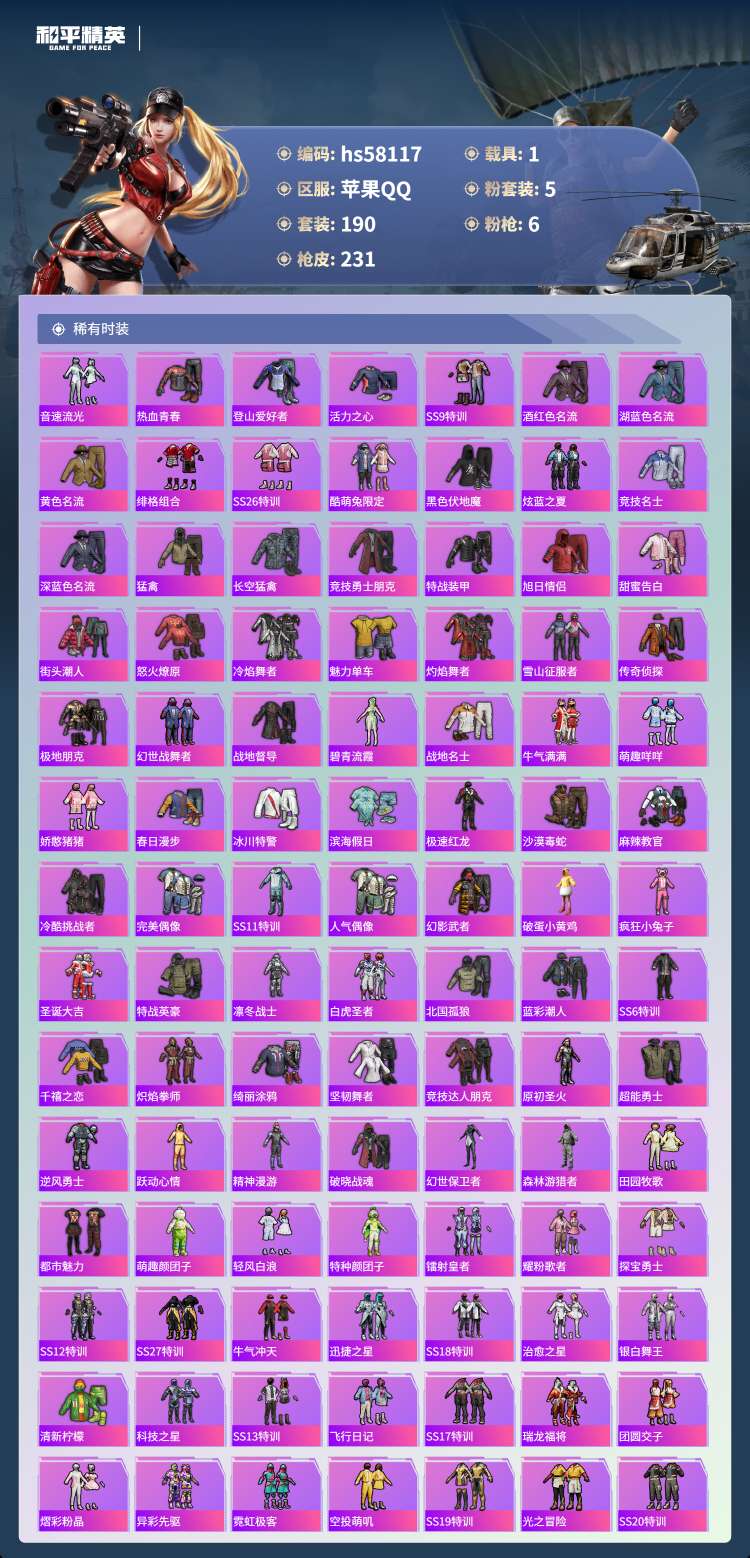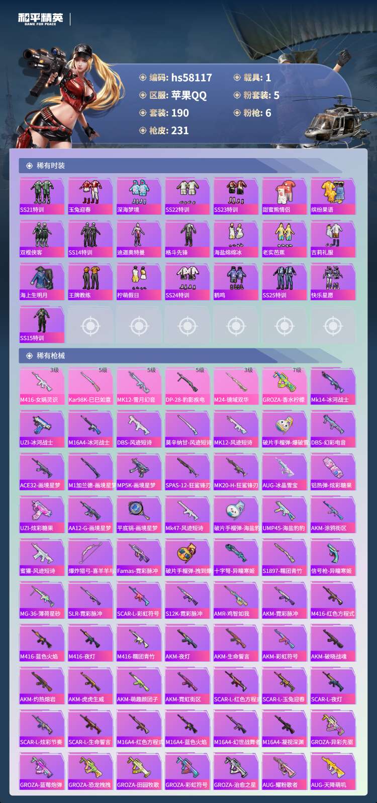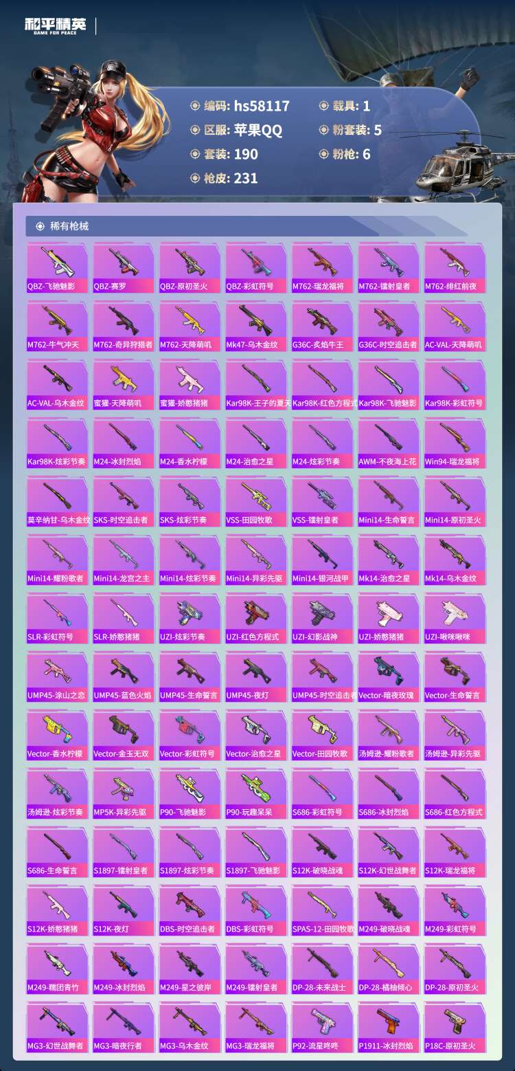 hs58117 苹果手Q-11王牌印记-5粉装-6特效枪-1载具-72876热力值-190套装-23